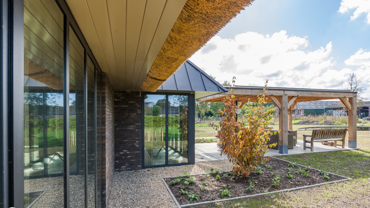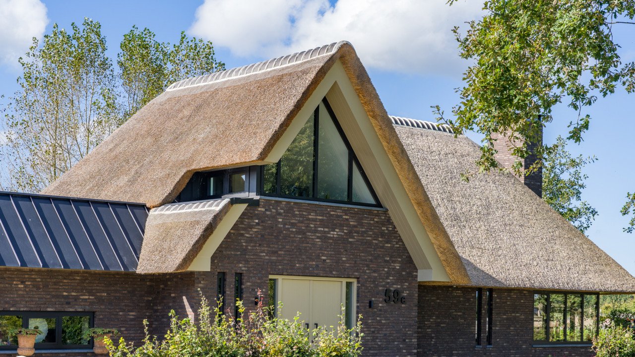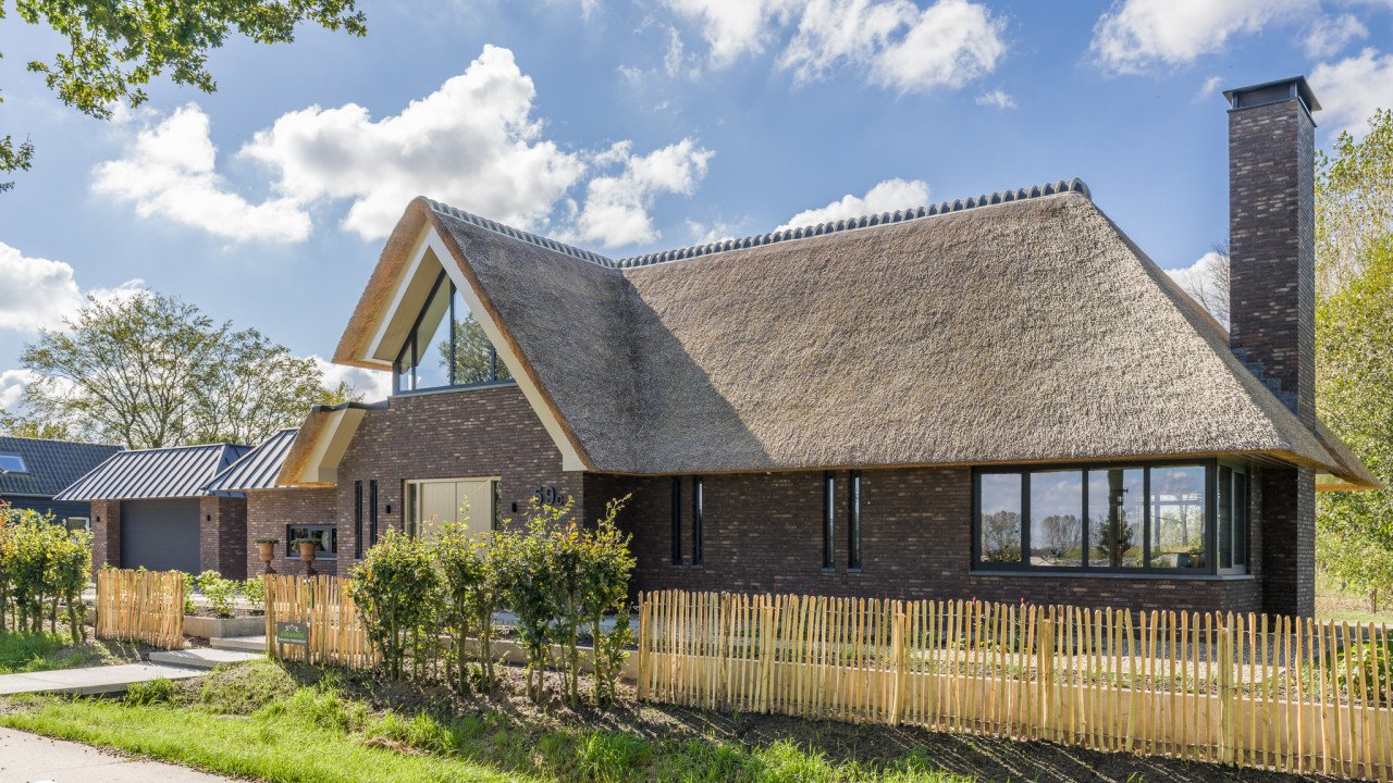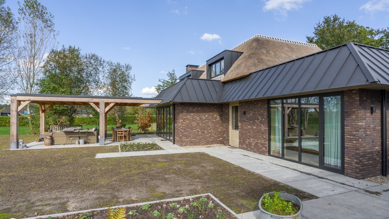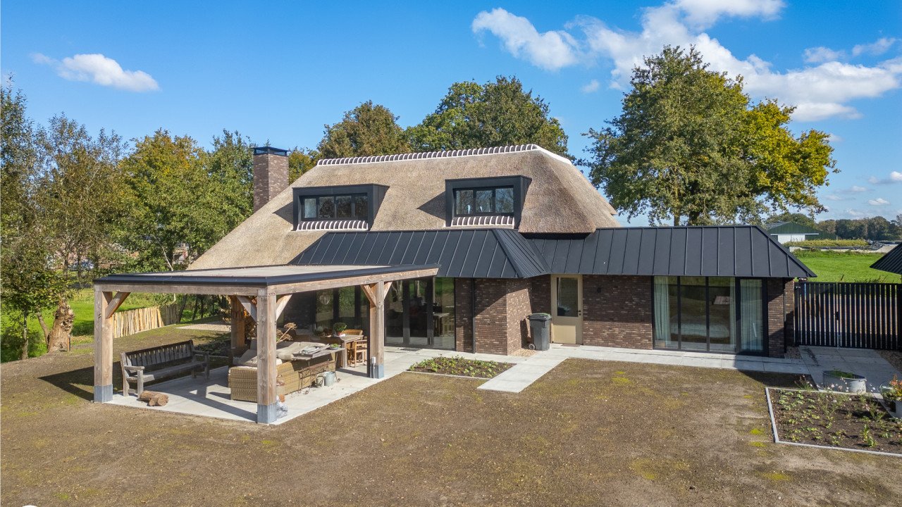 Het dak, een combinatie van riet en strakke zwarte aluminium panelen, geeft de woning een onderscheidend en karaktervol uiterlijk. Aan de achterzijde is een ruime, overdekte zithoek met een stijlvolle houten pergola gerealiseerd. De woning is tot in detail afgewerkt.