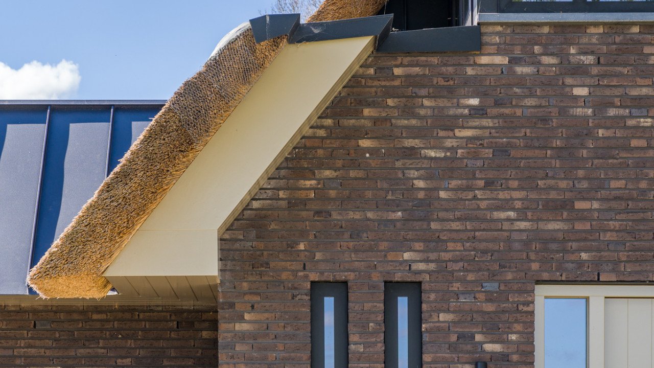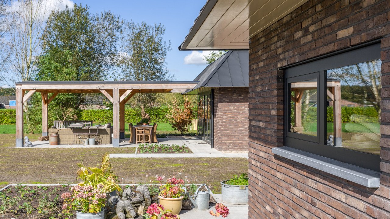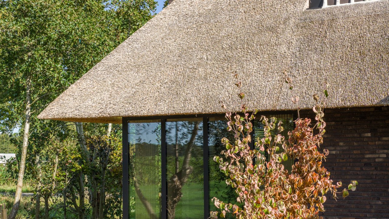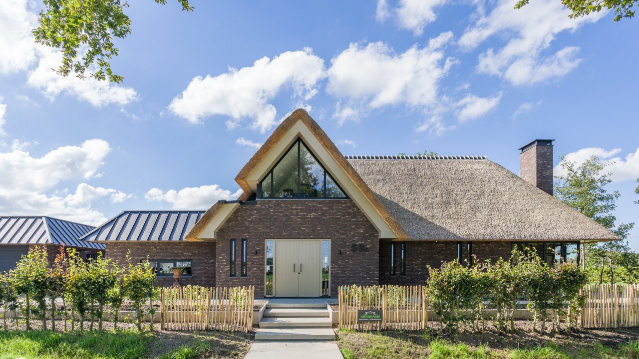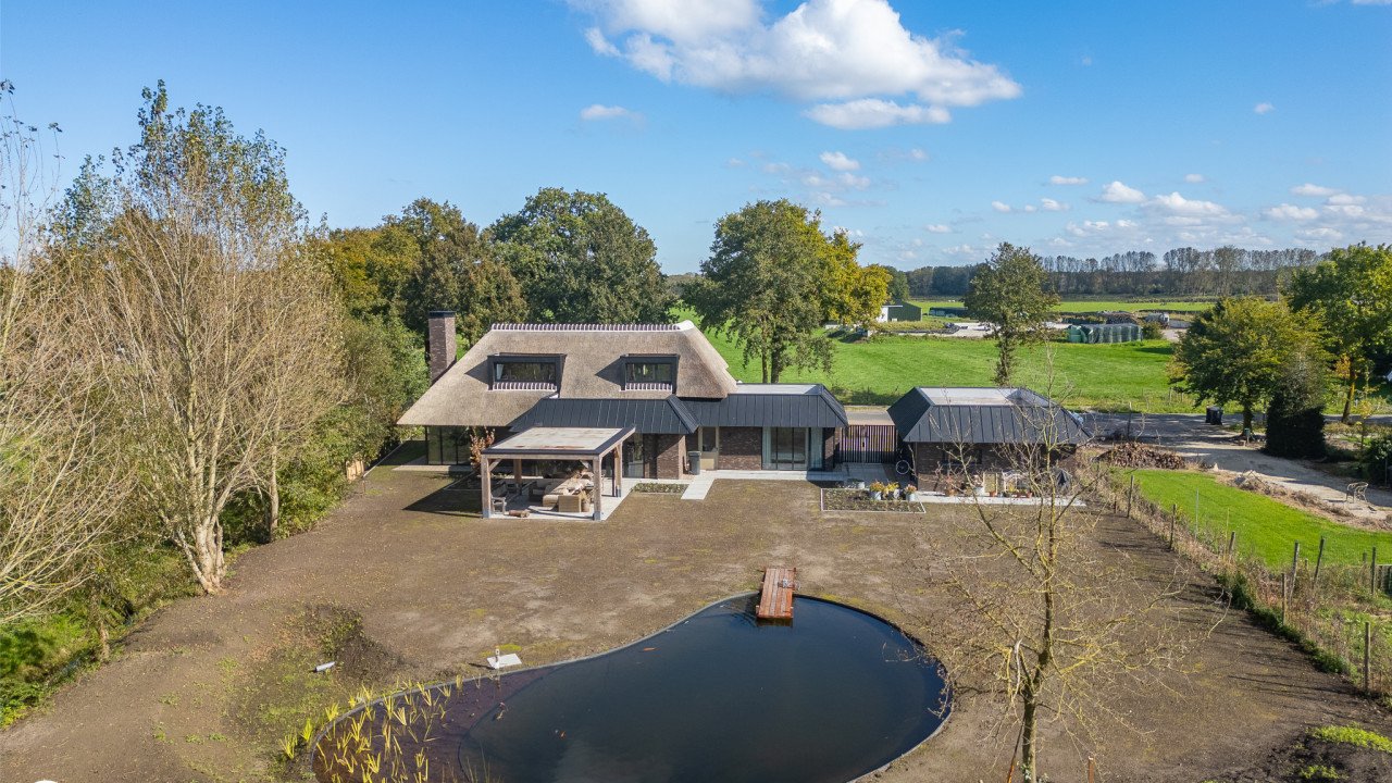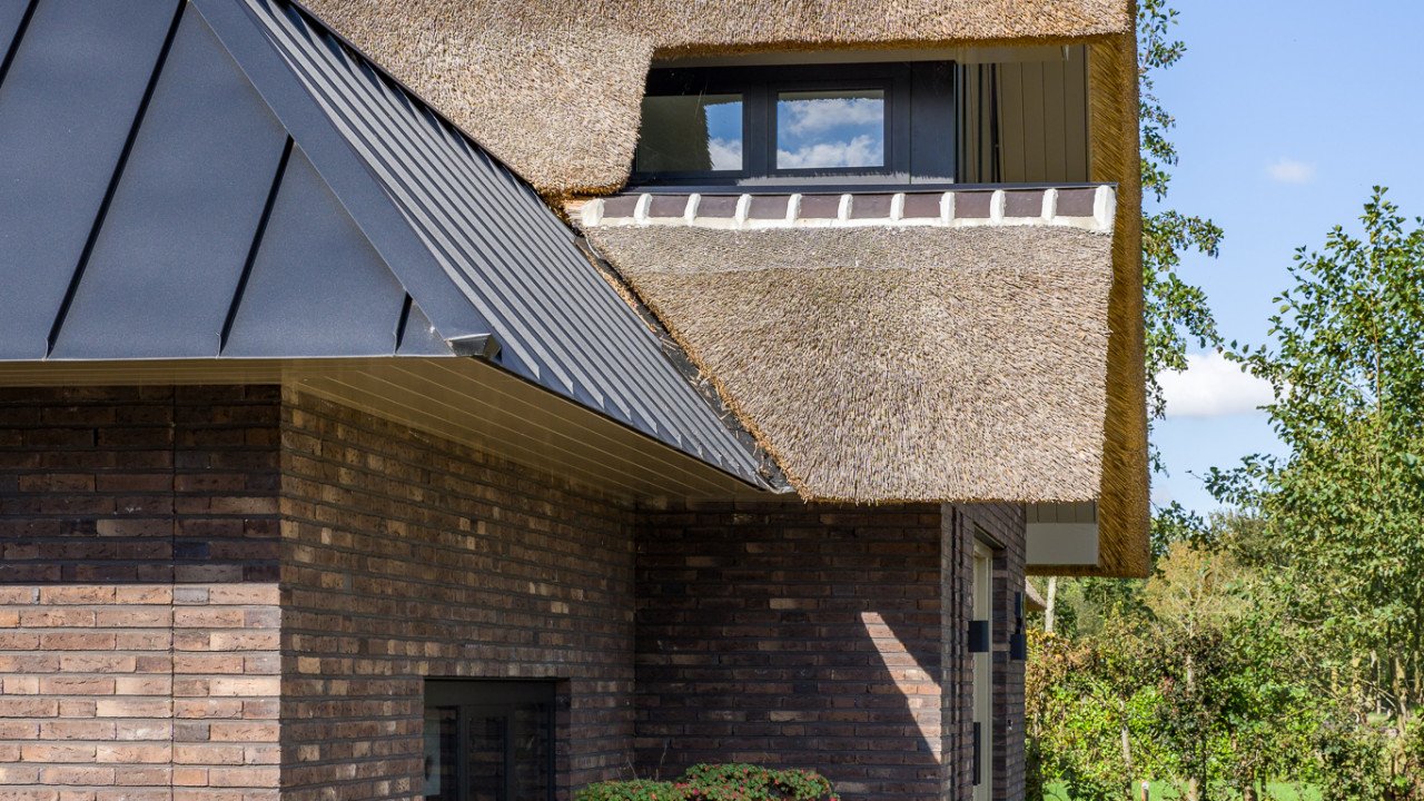 Het dak, een combinatie van riet en strakke zwarte aluminium panelen, geeft de woning een onderscheidend en karaktervol uiterlijk. Aan de achterzijde is een ruime, overdekte zithoek met een stijlvolle houten pergola gerealiseerd. De woning is tot in detail afgewerkt.