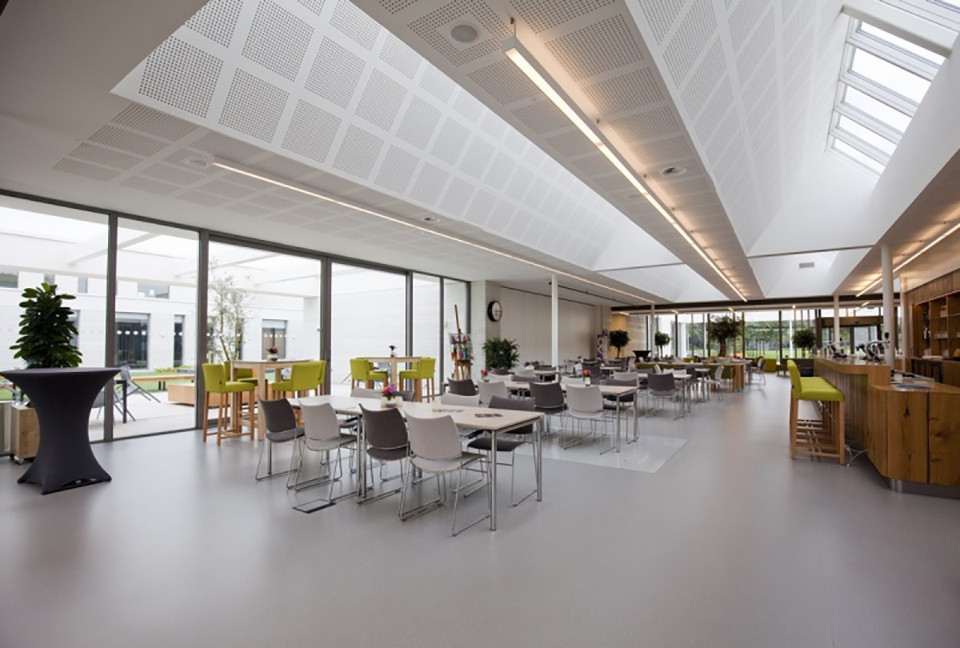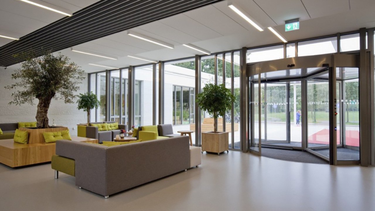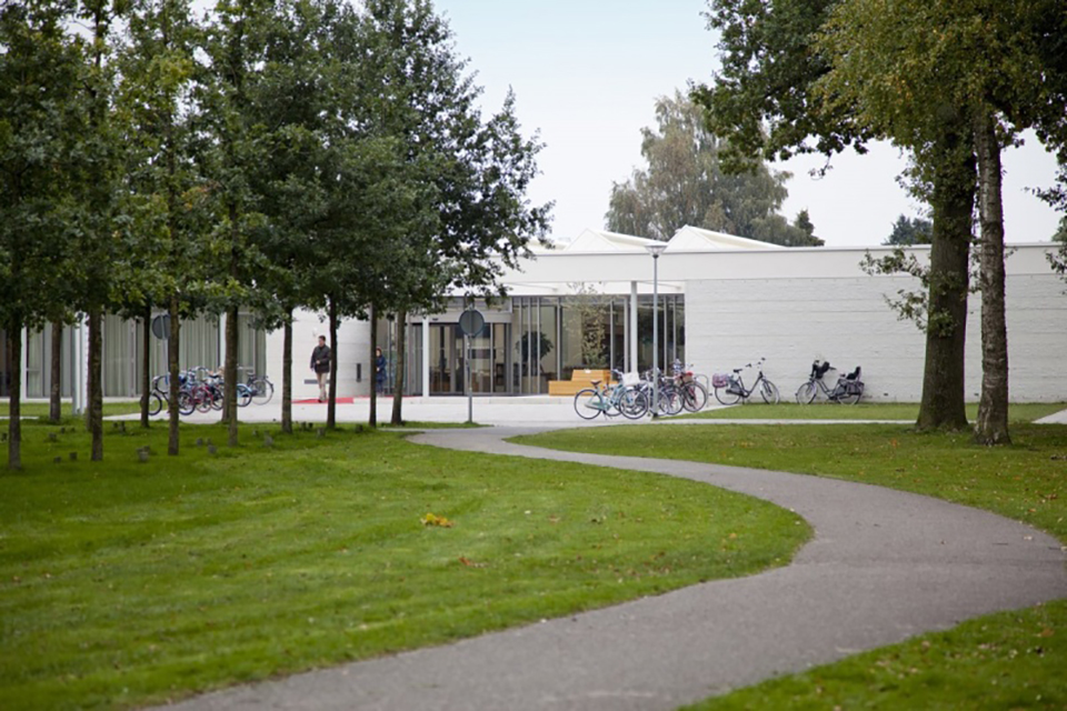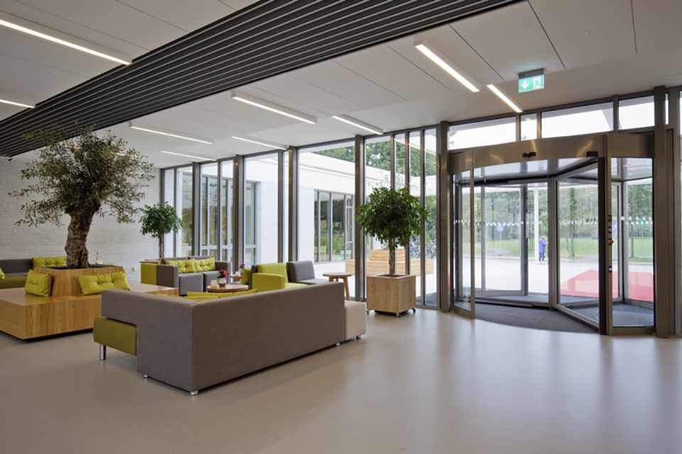 Voor het interieur werkte DAT architecten samen met Nijboer Interieur & Design. Ook de bibliotheek, die eigenlijk een officiële huisstijl heeft, werd in overleg afgestemd met de rest van het gebouw. “Zo komt bijvoorbeeld het houtfineer op de bar in de ontmoetingshal terug in de balie en de tafel van de bibliotheek”, vertelt Vermeer. De omgeving van het gebouw is samen met landschapsarchitect Karres en Brands ontwikkeld. Het gebouw moest tussen de bomen komen te staan, daarom zijn er ook nieuwe bomen geplant. De in het oog springende rode loper bij beide ingangen was een idee van een gebruiker. Zo is meteen duidelijk wat de ingang is en dat er een niveauverschil is. Vooraf was er veel discussie over waar nu de ingang van het gebouw moest komen. Dit werd door DAT Architecten slim opgelost: “Doordat het pad van voor naar achter door het gebouw loopt, zijn er nu twee voorkanten en ingangen.” De negen gebruikers zitten inmiddels enige tijd in het gebouw en de reacties zijn positief, iets waar Vermeer natuurlijk trots op is. Maar vooral is ze blij dat er een gebouw staat dat open en transparant is naar de omgeving.