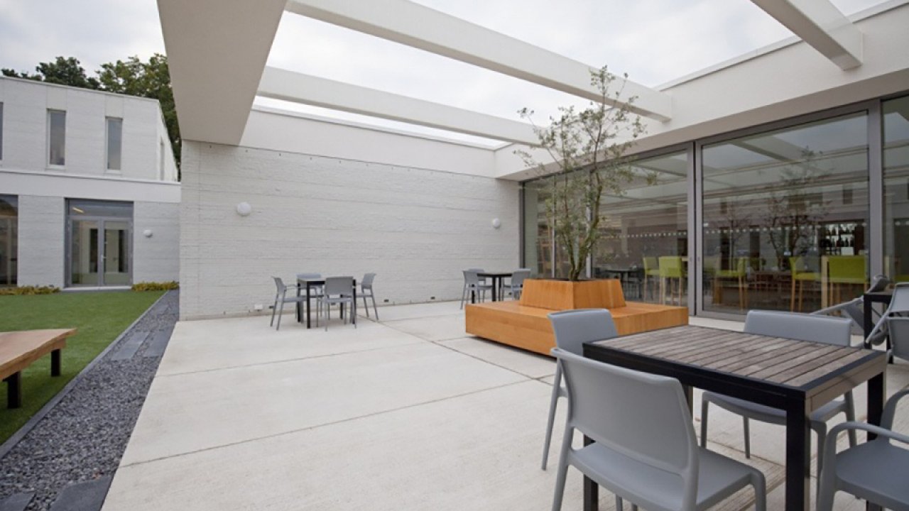 Aan de buitenkant springen vooral de glazen puien in het oog. Deze puien hebben een onregelmatige verticale belijning die door de kozijnen verder benadrukt moest worden. De kozijnen moesten verder slank maar stevig zijn. Vermeer: “Daarom hebben we gekozen voor renovatiekozijnen van Reynaers die speciaal voor dit project verstevigd werden. De kozijnen zijn daardoor nu aan de buitenkant 100 mm diep en dat versterkt meteen de verticale belijning: er is meer schaduwwerking, diepte en ritme. Ook de smalle draaiende delen versterken het ritme.” Het zetwerk is op de kozijndikte aangepast. Het geheel lijkt op een vliesgevel maar wel zonder het bijbehorende prijskaartje. De gevel werd uitgevoerd door Dijkema Ramen en Deuren BV uit Doetinchem. Een ander opvallend element zijn de witte bakstenen in de gevel. “De stenen zijn op twee manieren gebruikt”, vertelt Vermeer. “Afwisselend zijn gebroken en gladde stenen verwerkt. Zo verandert het gevelaanzicht telkens onder de invloed van zon en schaduw. De witte kleur zorgt ook voor een mooi contrast met de groene omgeving.”