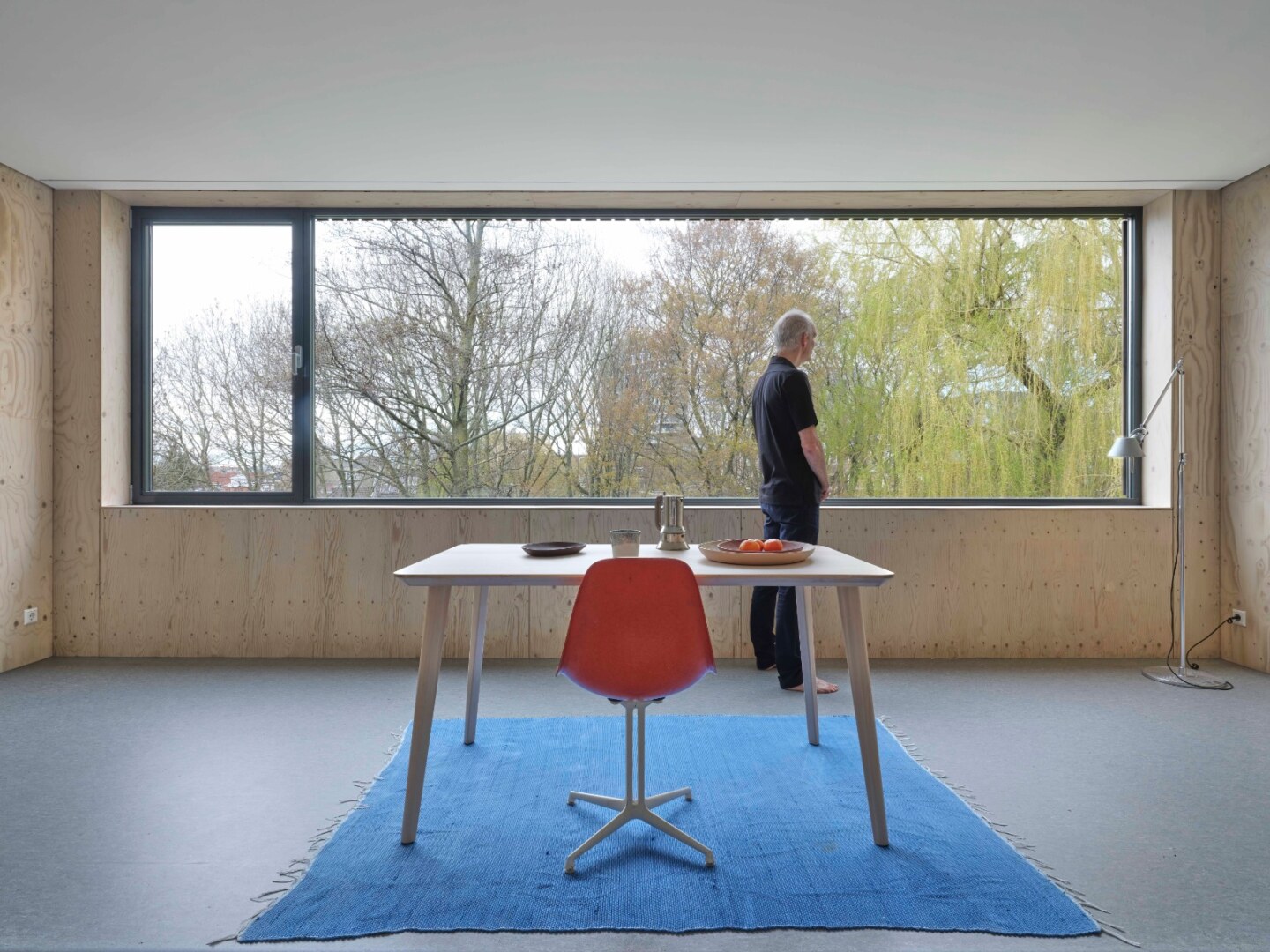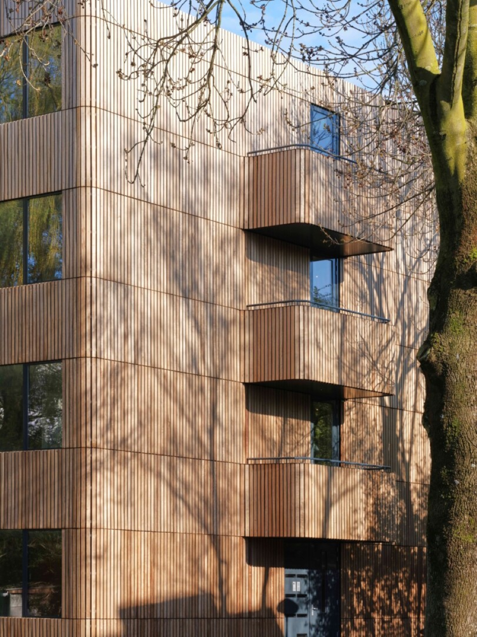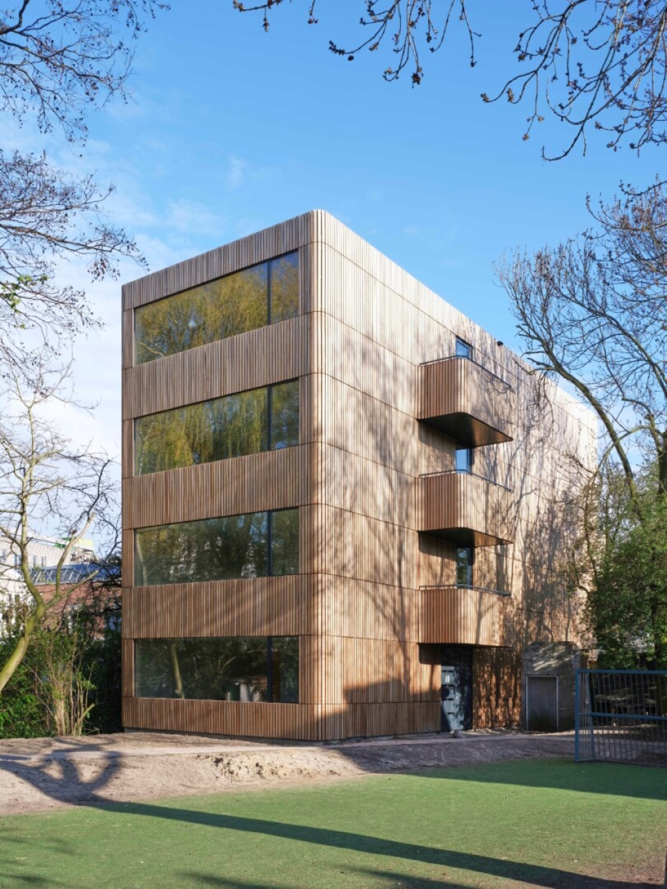Na de sloop van een Neogotische kerk, ontstond er in het Monicahof in Utrecht een binnenhof met speeltuin, grasveld en voetbaldoeltjes. In deze groen oase was ruimte voor een klein appartementencomplex. Om dit gebouw zo goed mogelijk in te passen in zijn groene omgeving, kozen we voor ronde vormen en houtskeletbouw. Het resultaat is een woontorentje met acht appartementen van 50m². Het complex is duidelijk aanwezig in het hof, maar het overheerst niet, doordat het de bestaande bouwlijn volgt. Binnen in de appartementen zorgt een blok in het midden van de ruimte – met daarin keuken en badkamer – voor een efficiënte indeling.