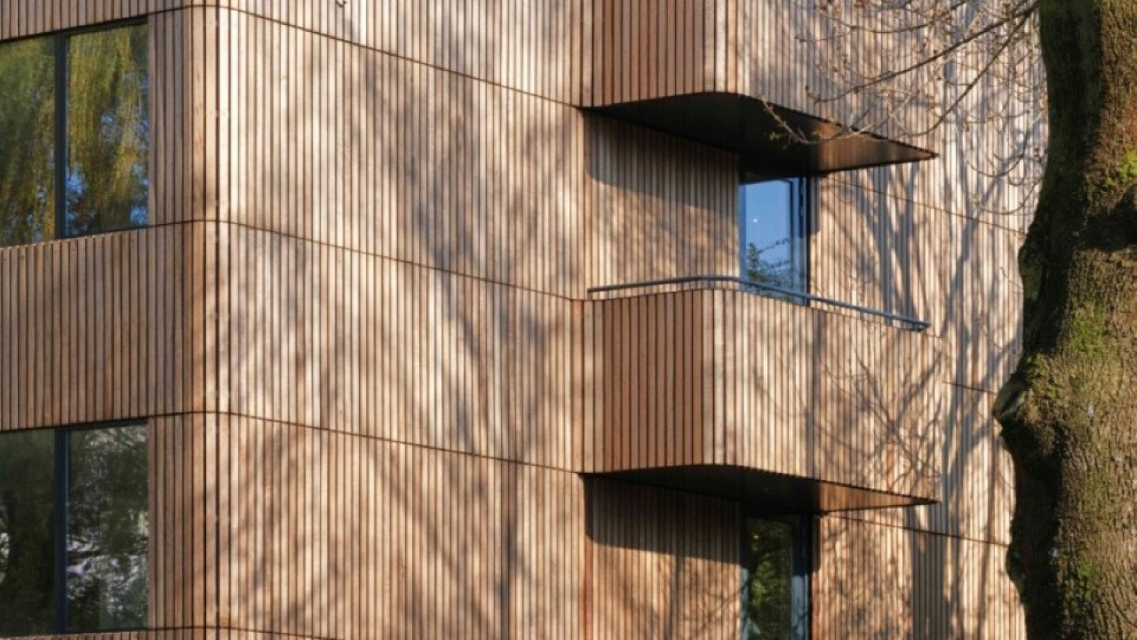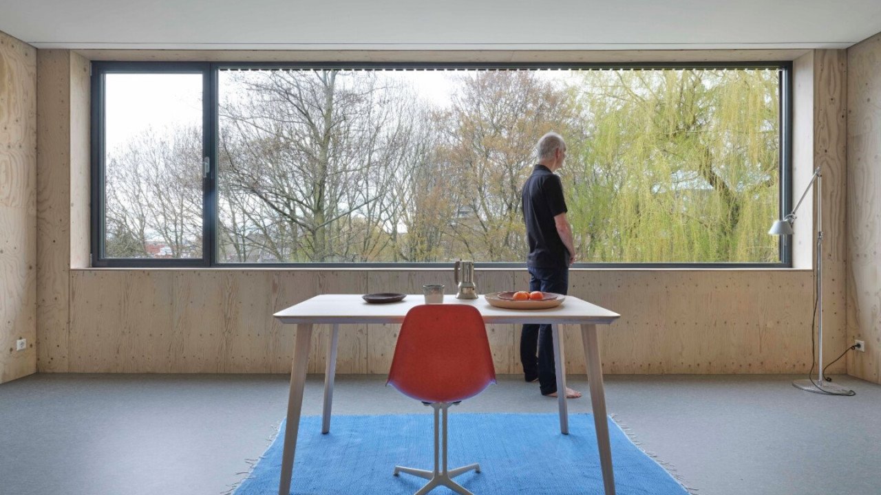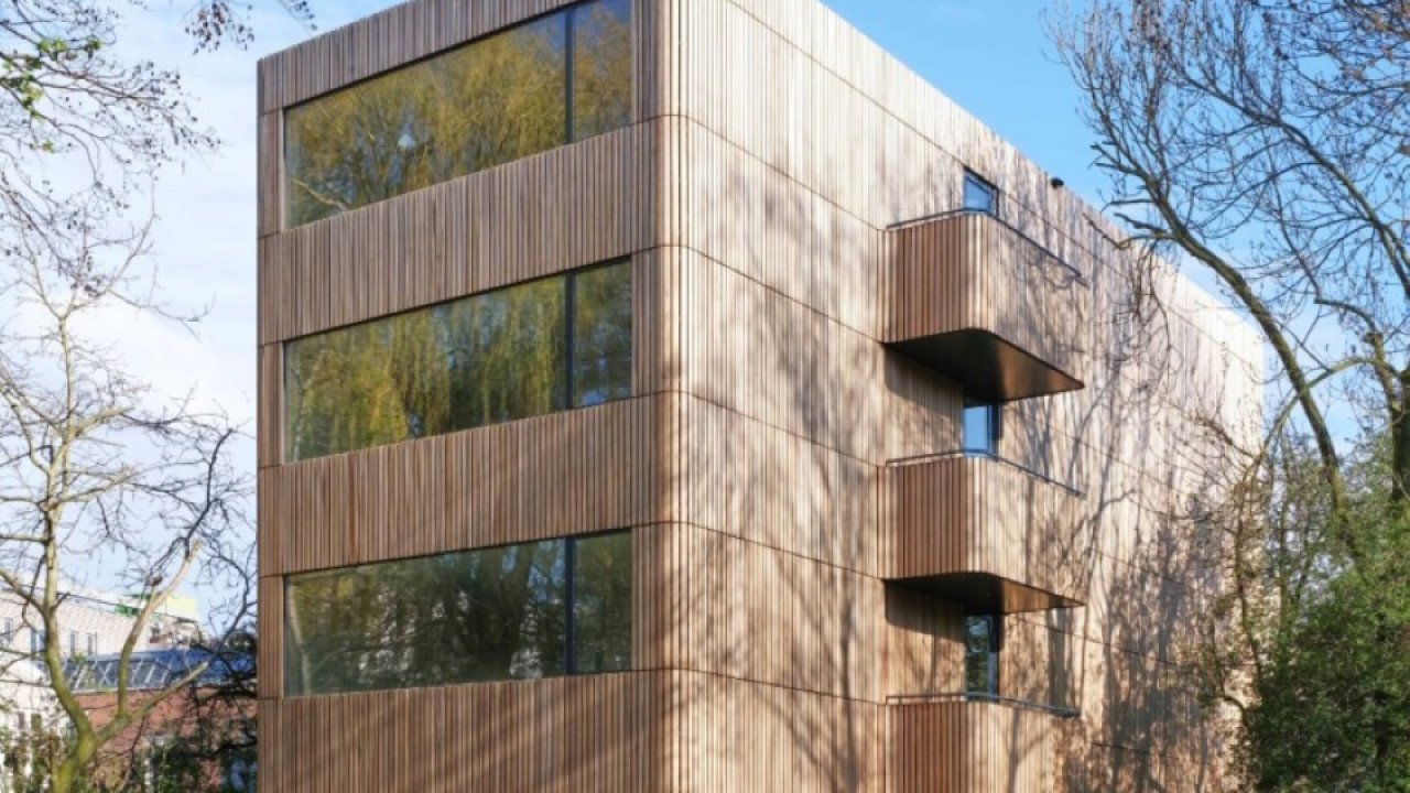 Na de sloop van een Neogotische kerk, ontstond er in het Monicahof in Utrecht een binnenhof met speeltuin, grasveld en voetbaldoeltjes. In deze groen oase was ruimte voor een klein appartementencomplex. Om dit gebouw zo goed mogelijk in te passen in zijn groene omgeving, kozen we voor ronde vormen en houtskeletbouw. Het resultaat is een woontorentje met acht appartementen van 50m². Het complex is duidelijk aanwezig in het hof, maar het overheerst niet, doordat het de bestaande bouwlijn volgt. Binnen in de appartementen zorgt een blok in het midden van de ruimte – met daarin keuken en badkamer – voor een efficiënte indeling.