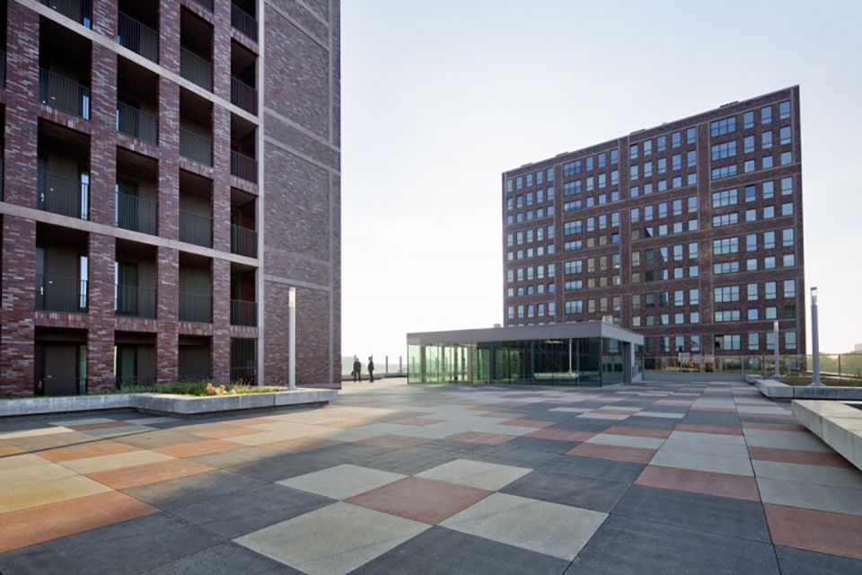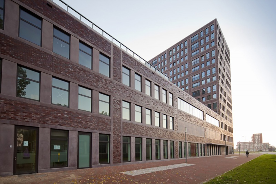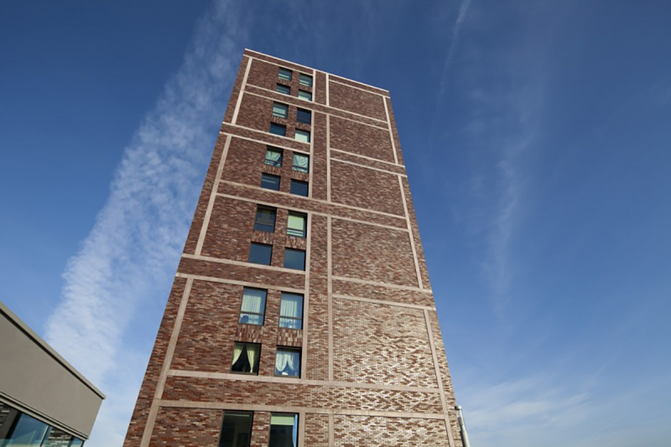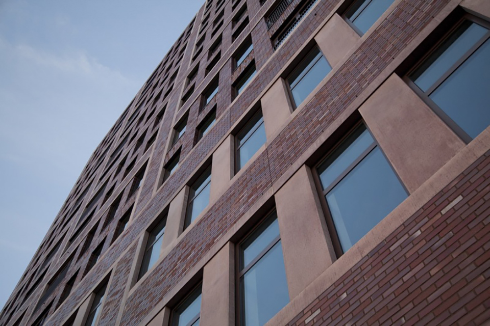 Ook de bakstenen gevels van Musa springen in het oog. De gebruikte bakstenen, die zijn verwerkt in een vlechtwerkpatroon, glinsteren het ene moment zilverachtig, het volgende moment lijken ze wel van goud. Sommige stenen zijn heel ruw, andere juist glad. De bakstenen en het vlechtpatroon zorgen er samen voor dat het stoere gebouw toch de uitstraling van een woongebouw heeft. “We hebben veel aandacht besteed aan de details”, zegt Kuipers. “Er zijn vier soorten Duitse baksteen door elkaar gebruikt. Ook op de galerijgevel zijn we trots. Deze ziet er namelijk niet uit als galerij. Vaak ziet de galerij er uit als de achterkant en dat wil je niet. Het gebouw is nu alzijdig, alle kanten moeten mooi zijn.”