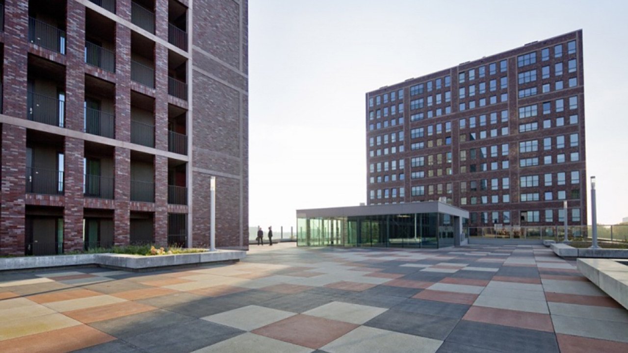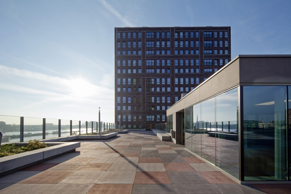 Het dakterras op het gebouw, tussen de twee woontorens, noemt Tom Kuipers 'een gouden greep'. “Het geeft veel lucht en ruimte en scholieren kunnen hier hangen, ze hoeven de straat niet op.” Het is dus een veilige plek en dat is precies wat opdrachtgever WoonCompas wilde voor zowel de scholieren als de vaak oudere bewoners van de appartementen. Ook vormt het gebouw zo een soort omlijsting van het gebied. Het dakterras kan door alle gebruikers gebruikt worden. Er zijn geïntegreerde banken en windschermen.