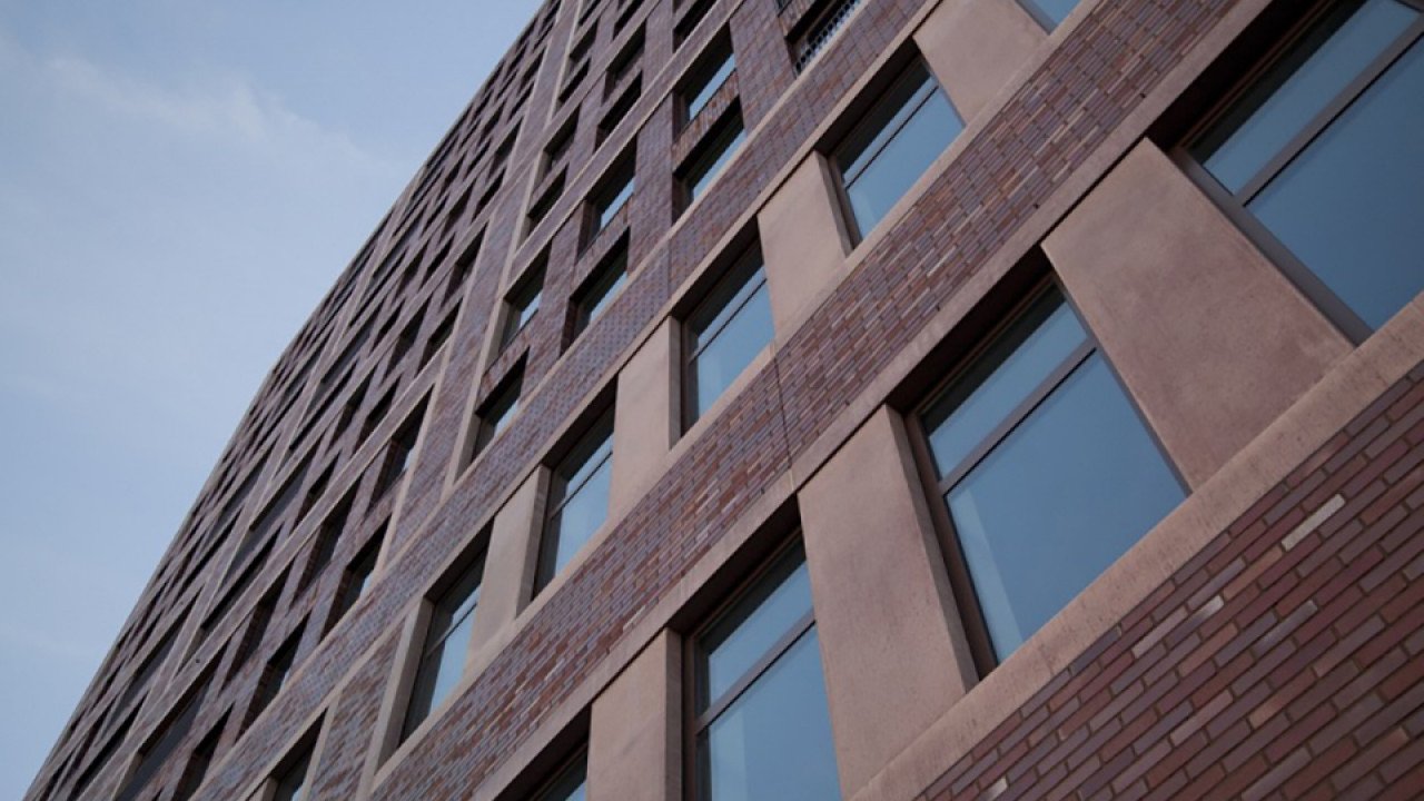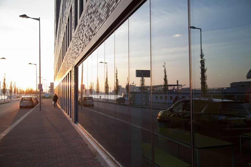 In hele gebouw zijn bruin-antraciete aluminium kozijnen van Reynaers gebruikt, geplaatst in diepe neggen voor extra dieptewerking. De kozijnen zijn van binnenuit geplaatst door gevelbouwer Alkondor, iets wat in Nederland niet vaak gebeurt. Kuipers: “Dit had een esthetische en een praktische reden. Allereerst zijn nu alle ramen van buitenaf gelijk, je ziet dus niet welke delen er open kunnen.” Dit werd bereikt door het hidden vent-systeem, waarbij de draaiende delen zijn verstopt achter de flens. “Daarnaast kunnen de kozijnen in de toekomst eventueel van binnenuit vervangen worden, een wens van de opdrachtgever.” De plaatsingsmethode wordt in Nederland niet veel gebruikt vanwege het risico van vocht in de gevel. Dit potentiële probleem werd aangepakt door Alkondor door de kozijnen tegen een extra aanslagprofiel te plaatsen. “De kozijnen van Reynaers werden ook gekozen omdat ze goed aansluiten bij de minimalistische detaillering van het gebouw”, vertelt Kuipers. “Daarnaast waren duurzaamheid en onderhoudsarm belangrijke redenen voor de opdrachtgever om hiervoor te kiezen.”