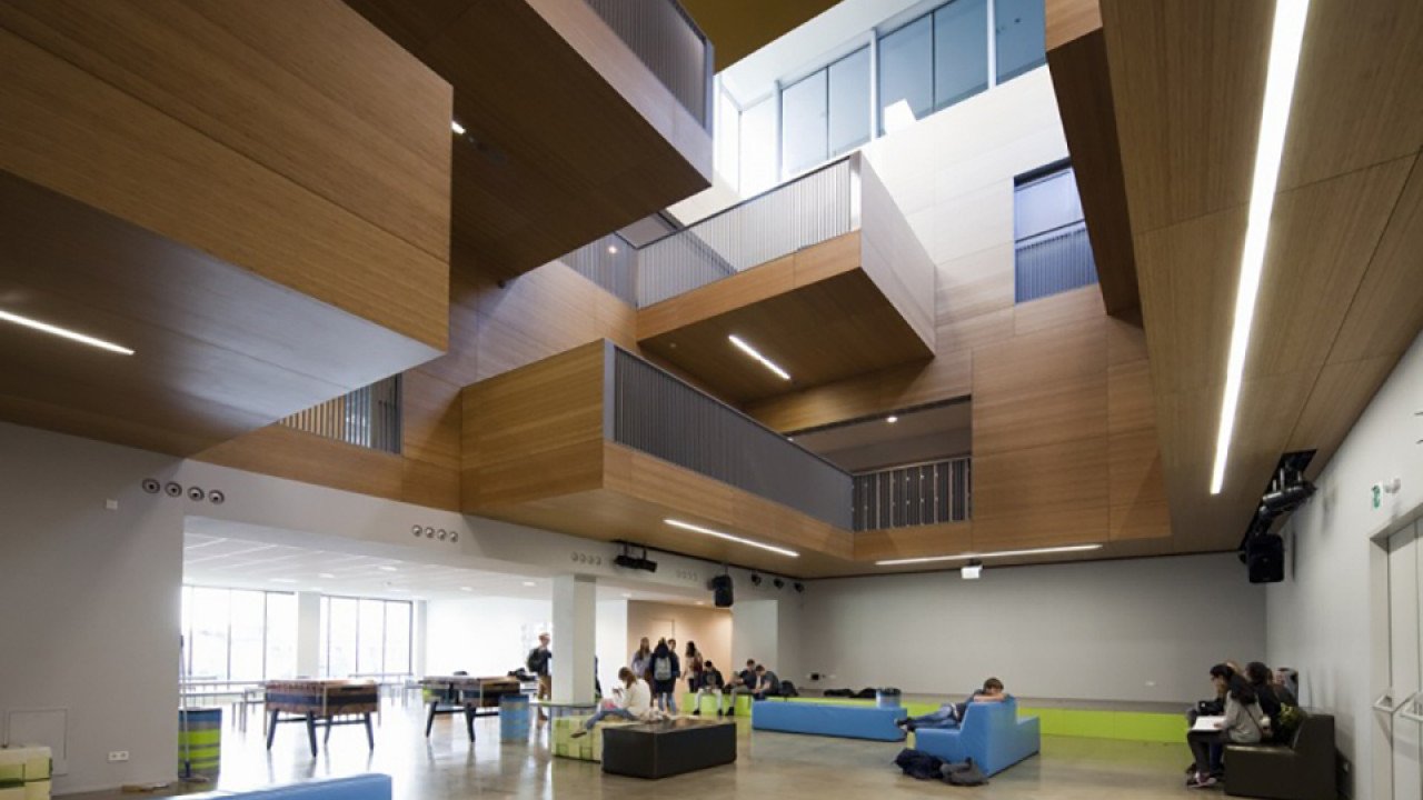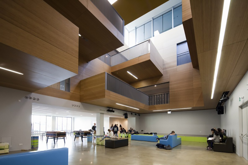 De middelbare school is gelokaliseerd rondom een centraal atrium van 16 bij 12 meter met daarboven een aantal uitstekende blokken, die een verbinding leggen tussen het atrium en de klaslokalen. Deze zijn bekleed met bamboefineer en doen dienst als studieplekken. De studieplekken worden bij brand afgesloten van de rest van de school, zodat het gebouw aan de brandveiligheidsnormen voldoet. De hal heeft een podium dat door de leerlingen maar ook door andere partijen gebruikt wordt. “Dit vind ik een erg mooie plek”, zegt Kuipers. “Er valt mooi licht naar binnen via het dakterras.”