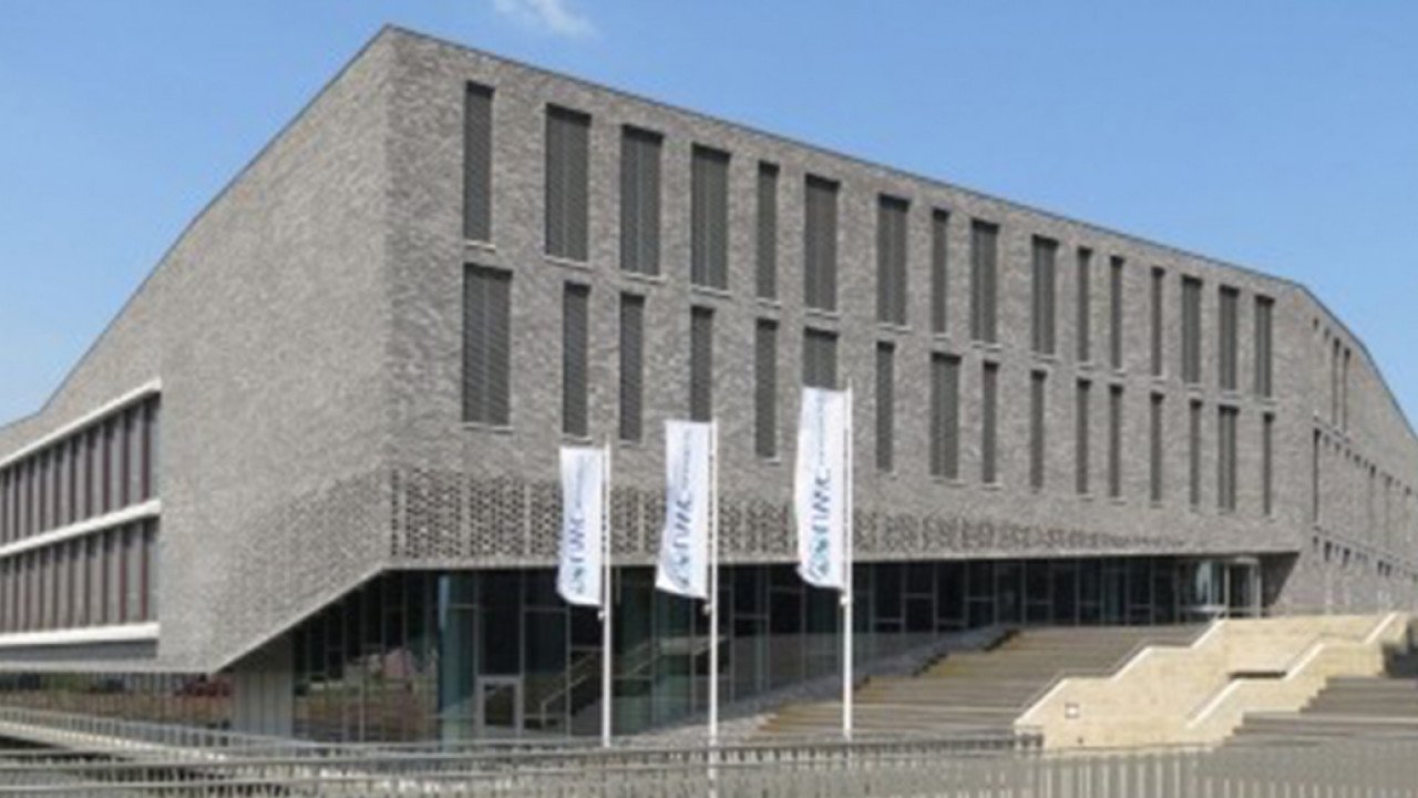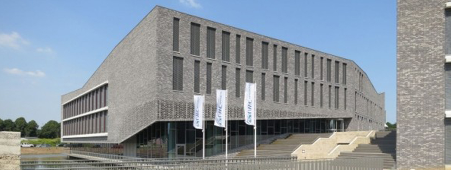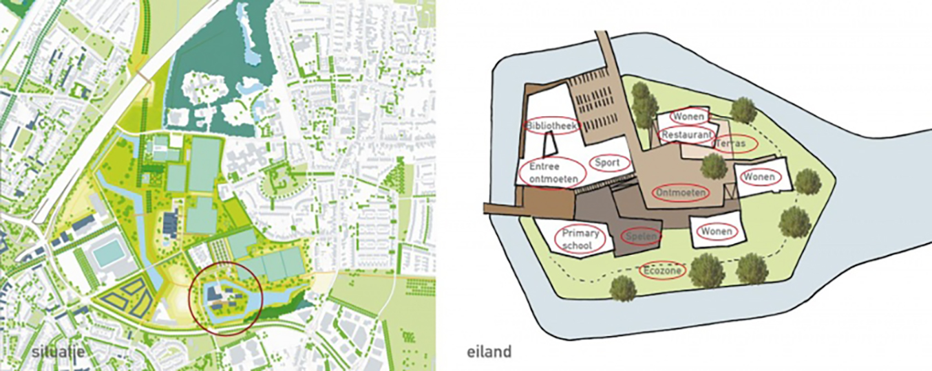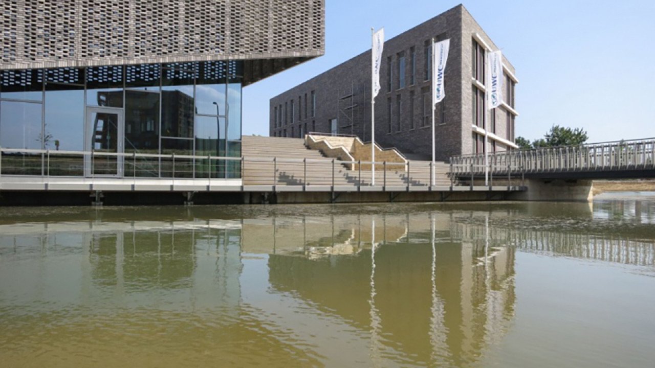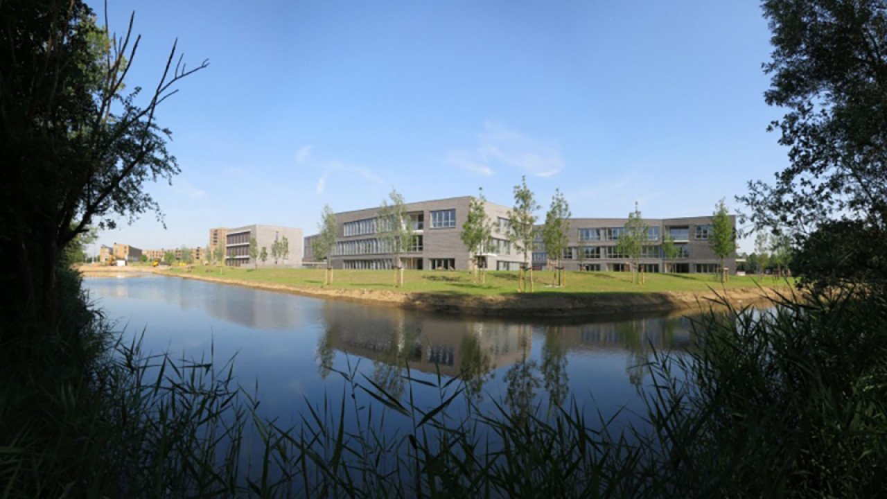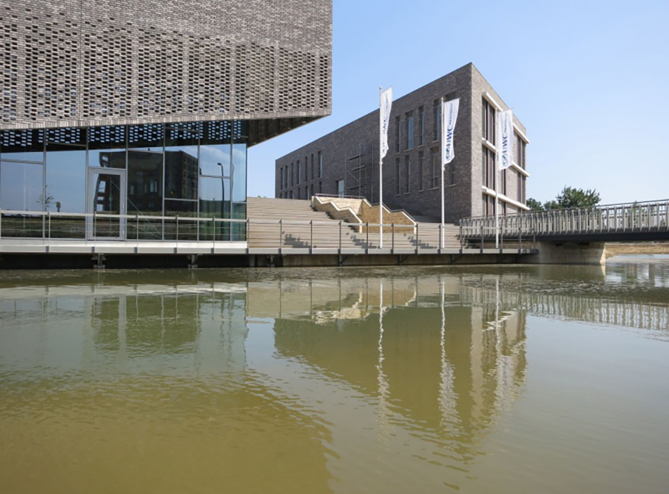 De nieuwe campus, gelegen aan het water, is een verzameling van zogenoemde paviljoens die in materialisering en detaillering op elkaar zijn afgestemd. De lichtgrijze materialen - baksteen, aluminium, beton - vormen met elkaar een compositie van gesloten, opengewerkt patronen en volledig transparante geveldelen. Elk materiaal is toegepast binnen deze drie condities.
