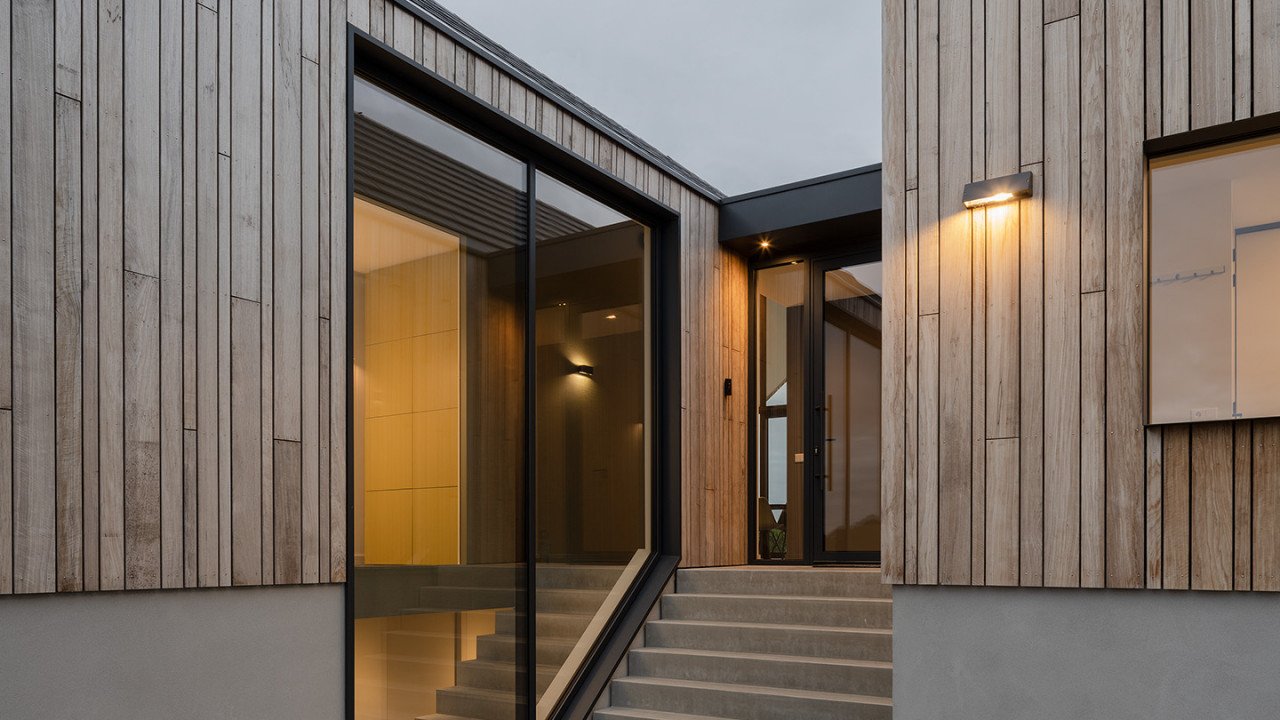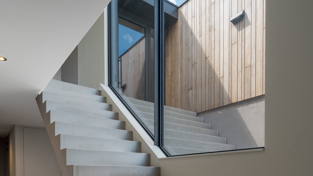 Eenvoud en abstractie kenmerken deze schuurwoning. En juist die combinatie maakt het geheel ook frivool. Lijken de twee delen van de woning op het eerste oog identiek, bij nader inzien zijn ze dat allerminst. En hoe strak en tegelijkertijd speels zijn de hoge raampartijen die de twee verdiepingen met elkaar verbinden?