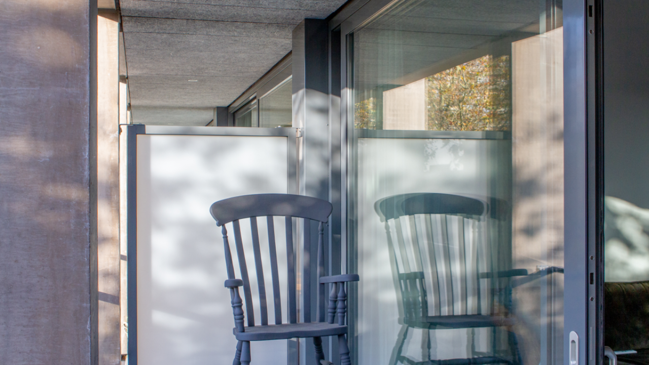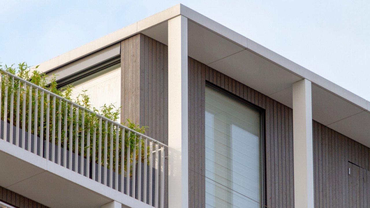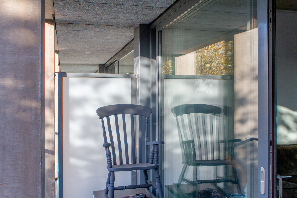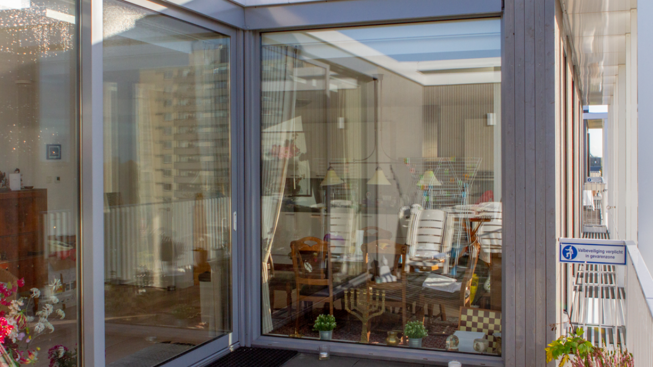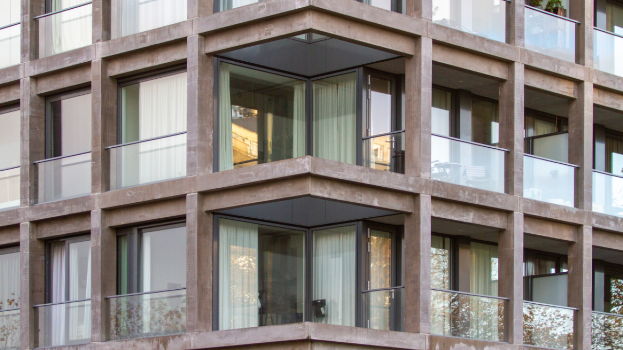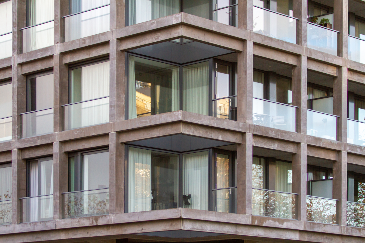 Niet alleen is het spiegelglas verwijderd, ook is de vliesgevel van de appartementen naar achteren gelegd. De teruggetrokken glasgevel is uitgevoerd met donkere aluminium kozijnen, die minimaal opvallen. “Deze ingreep voorziet de gevel van een transparant aanzicht én zorgt voor reductie van het geluid van de drukke verkeersweg. Ook is hiermee een buitenruimte aan de woningen toegevoegd.” De vier hoeken van de bestaande architectuur waren een inkeping in het gebouw. Nu is het betonnen vloerprofiel doorgetrokken, waardoor het grid intact blijft en de illusie van letterlijke opening in de gevel is ontstaan. “Alsof we iets hebben weggehaald in plaats van toegevoegd.”