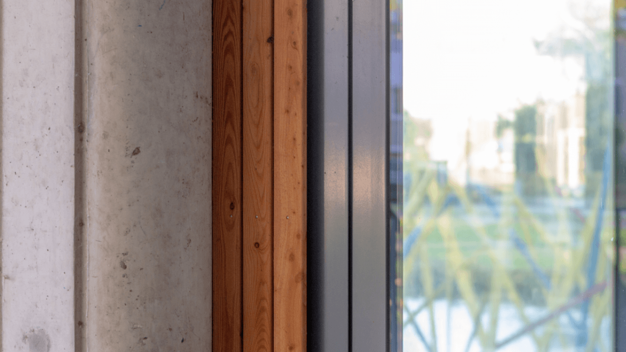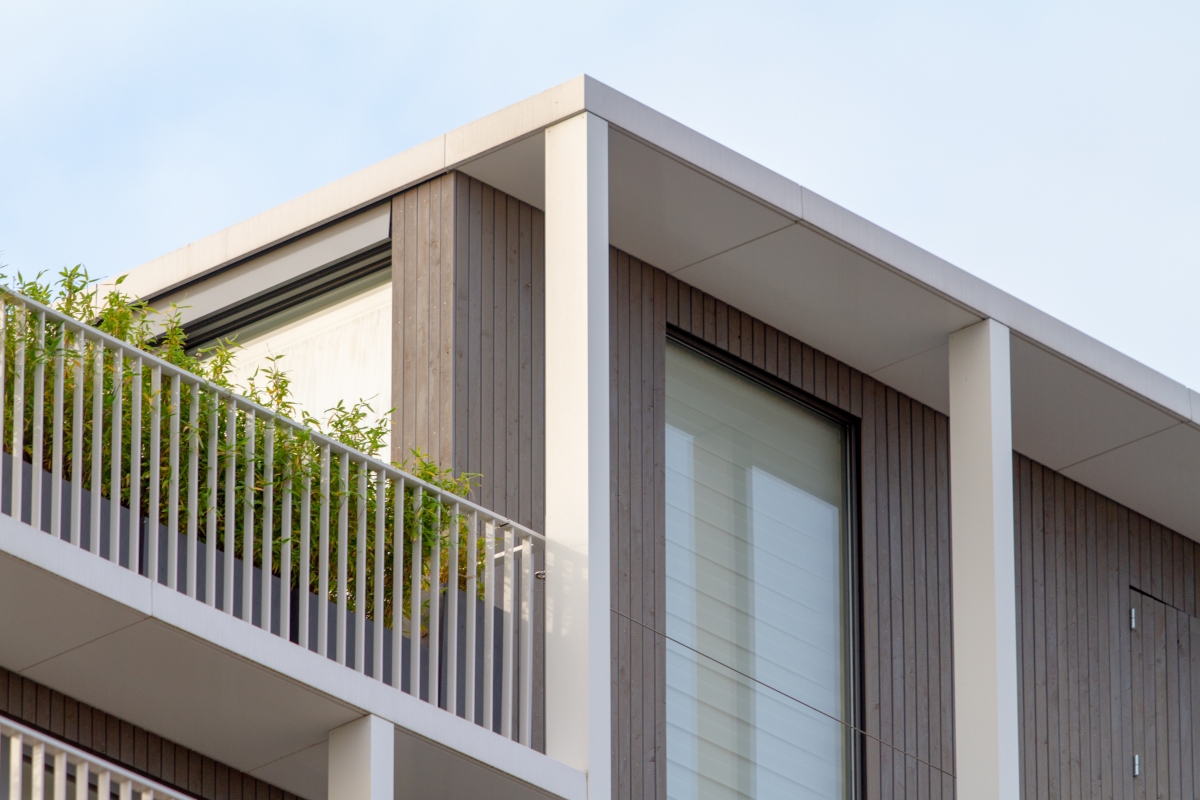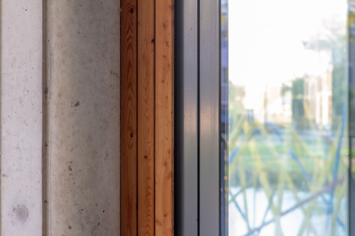 Tijdens de transformatie is het gebouw helemaal gestript. “Alleen het betonnen karkas van vloer en kolommen bleef over.” De plint is gevuld met commerciële verhuur en kreeg een glasgevel. Ook hier is bewust gekozen voor aluminium kozijnen. “Deze gevel moet zo transparant mogelijk zijn en toch zelfdragend.” Door het reduceren van de bouwmassa (onder meer door gebruik van lichtgewicht microbeton) kon het gebouw zonder funderingscorrectie worden opgetopt met twee extra woonlagen. Deze onderscheiden zich van het dwingende grid van vierkante betonelementen. De optopping bestaat uit appartementen, afgewerkt met hout en fijnere witte profielen in een staand rechthoekig grid. Omdat de tweede woonlaag wordt onderbroken door dakterrassen, ontstaat een onregelmatig getrapte gevel. “Het complex heeft een grote woondiversiteit met appartementen van 45 tot 150 vierkante meter, zowel huur als koop. Dat wordt mede op deze manier zichtbaar gemaakt.”