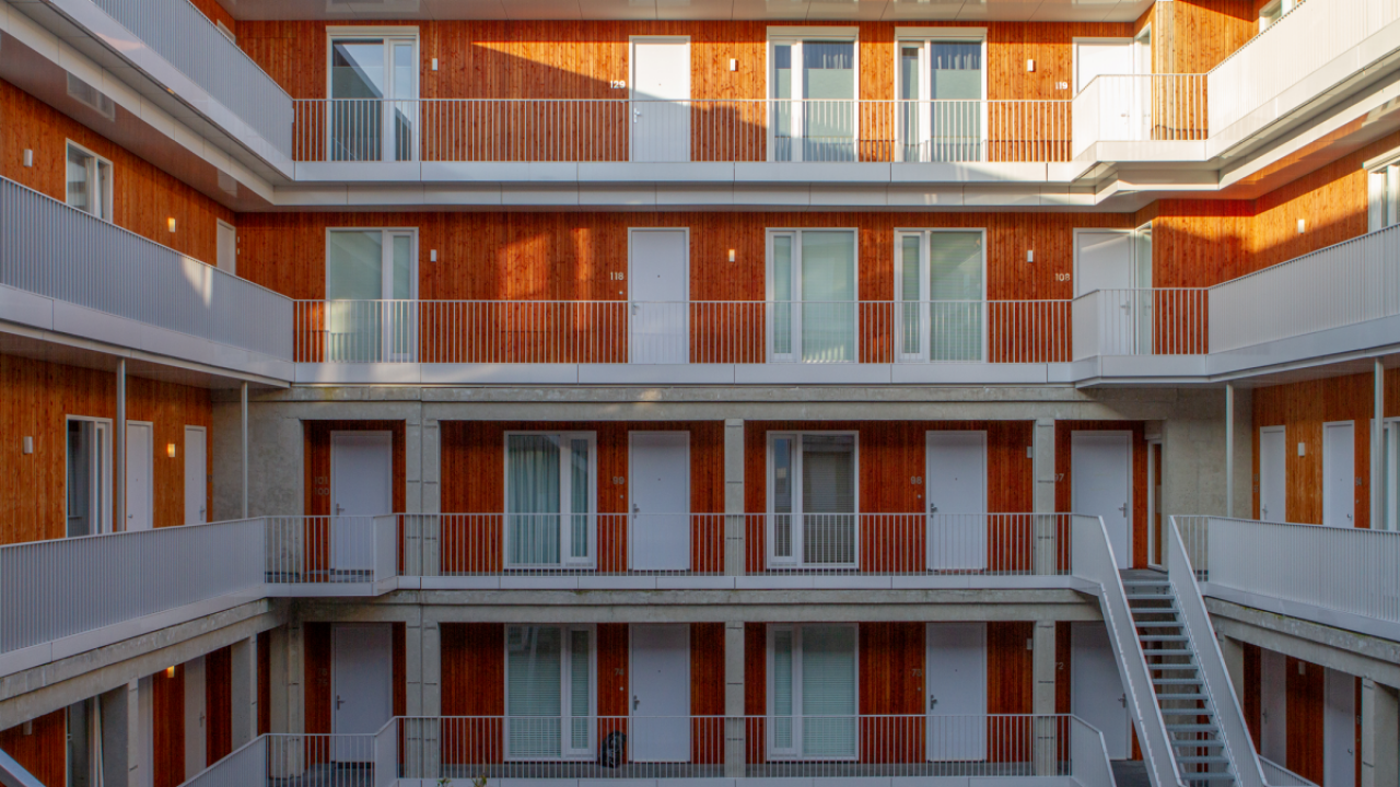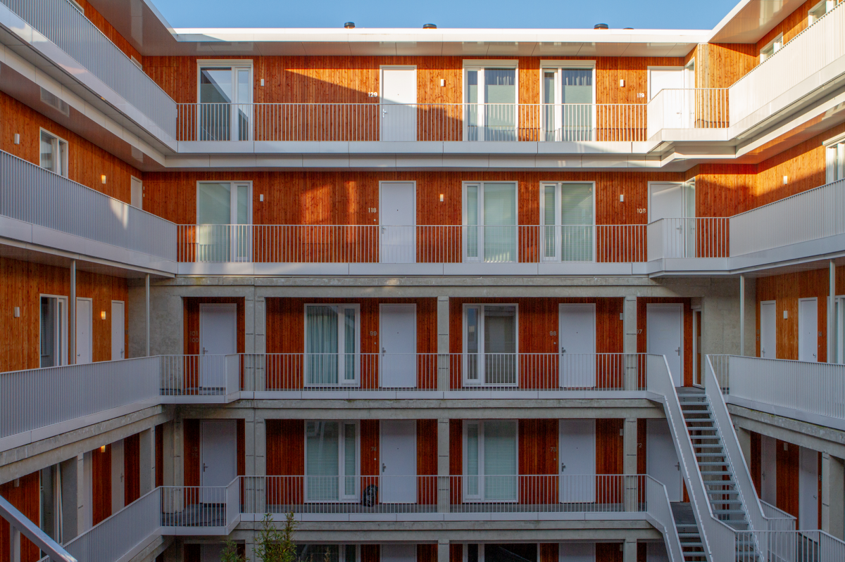 Vanaf de binnenplaats kan door de trap naar het straatniveau worden gekeken. Daarvoor moest wel het dak van de oude vergaderzaal worden verlaagd. Op de binnenplaats zijn bomen en groen aangeplant en informele zitjes geplaatst. “Het moet fungeren als een pleintje.” De cour vormt een schril contrast met de harde buitenkant. De appartementen hebben een lichte houten gevel. De kozijnen zijn juist fris wit, net als de deuren, trappenhuizen en balustrade. Het onderscheid tussen de twee opgetopte woonlagen en de onderliggende woningen zijn hier nagenoeg onzichtbaar; alleen de dragende betonkolommen zijn bewust zichtbaar gehouden en markeren de oorspronkelijke architectuur. “Ondanks de sterk verschillende woningen wordt hiermee het gevoel versterkt dat iedereen in hetzelfde gebouw leeft.”