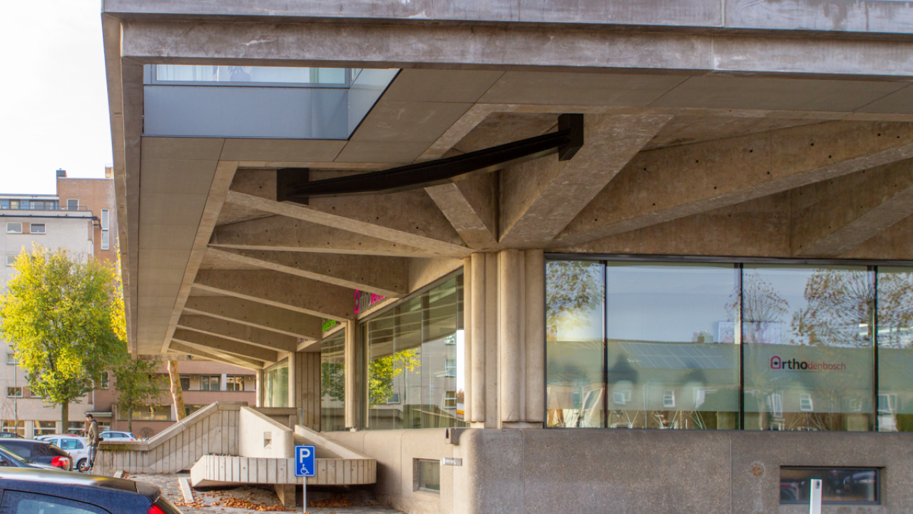 De oorspronkelijke architectuur van het wooncomplex Schubert in Den Bosch is een uitgesproken voorbeeld van het brutalisme, de betonbouw uit de jaren zestig en zeventig met zijn gesloten blokstructuren. Het overheidsgebouw van Rijkswaterstaat was zo massief dat er zelfs sprake was van de aanleg van een atoomkelder. Toch is het oorspronkelijke ontwerp uit 1977 relatief eenvoudig. De visuele drager is een hard grid van hoge, schuine vloerelementen. Kenmerkend was de vierkante opbouw van drie verdiepingen die uitkraagde boven een sokkel. Het gebouw wordt bovendien deels omringd door een vijver, wat de uitstraling grootser, statiger maar ook afstandelijker maakt. En dan was de kantoorgevel ook nog eens dichtgesmeerd met getint glas. Kortom, hier stond een gesloten werkmachine van ongenaakbaar beton, pal in een woonwijk.