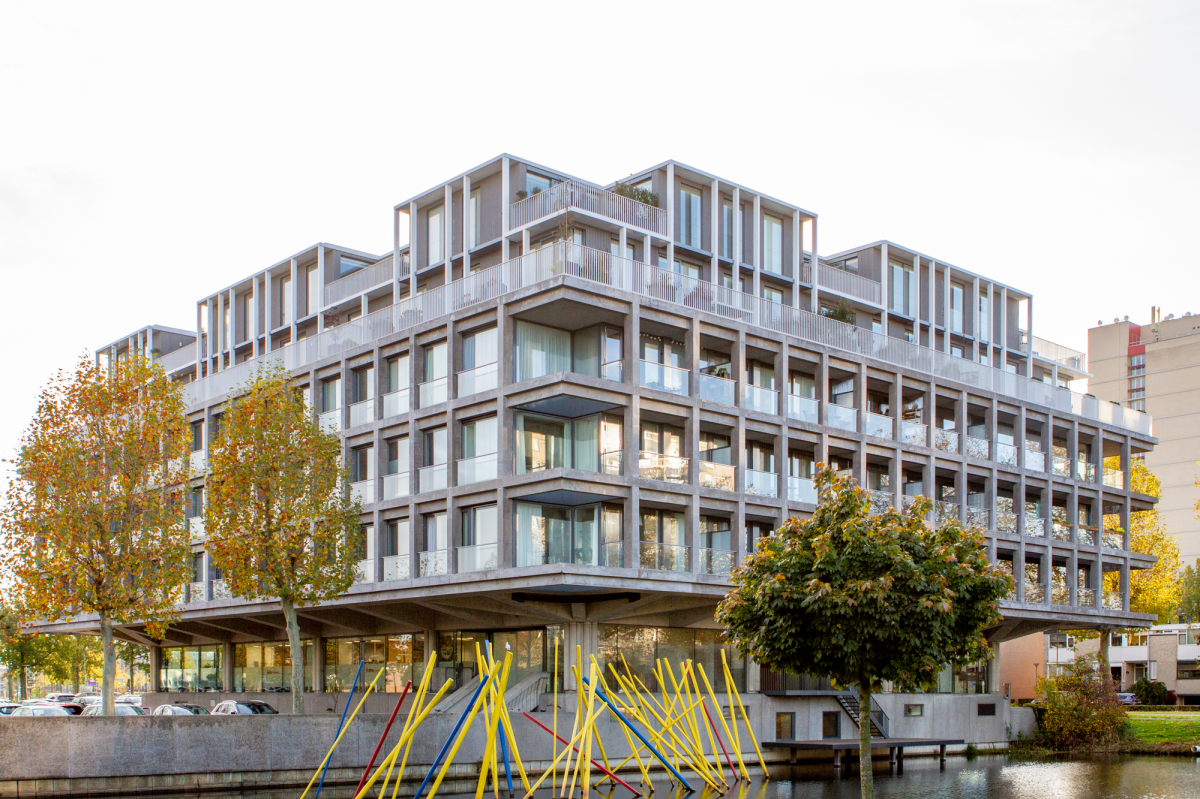 Het voormalige kantoor van Rijkswaterstaat is van een betonnen eiland in een woonwijk getransformeerd tot een toegankelijk en modern wooncomplex. Dankzij een brede publiekstrap die een groen binnenplein ontsluit, heeft het gebouw een open uitstraling. De gevel is transparant gemaakt door de woningen diep achter de gevel te plaatsen. De toegevoegde dakwoningen met speelse gevels maken het woonplezier zichtbaar. Tegelijkertijd is de architectuur onverminderd eigenzinnig. De glazen plint oogt fragiel onder de uitkragende betonconstructie. Het no-nonsense grid van beton oogt vertrouwd en toch spannend.