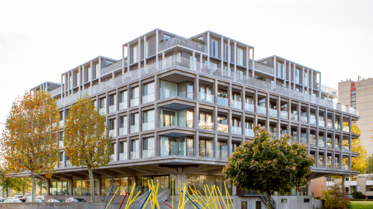Een brutalistisch bastion is met slimme ingrepen getransformeerd in een open en prettig woongebouw dat zich voegt naar de omliggende woonwijk. Achter een hard betongrid ligt een teruggetrokken glasgevel met subtiele aluminium kozijnen. Een optopping met twee speelse verspringende woonlagen zorgen voor dynamiek.