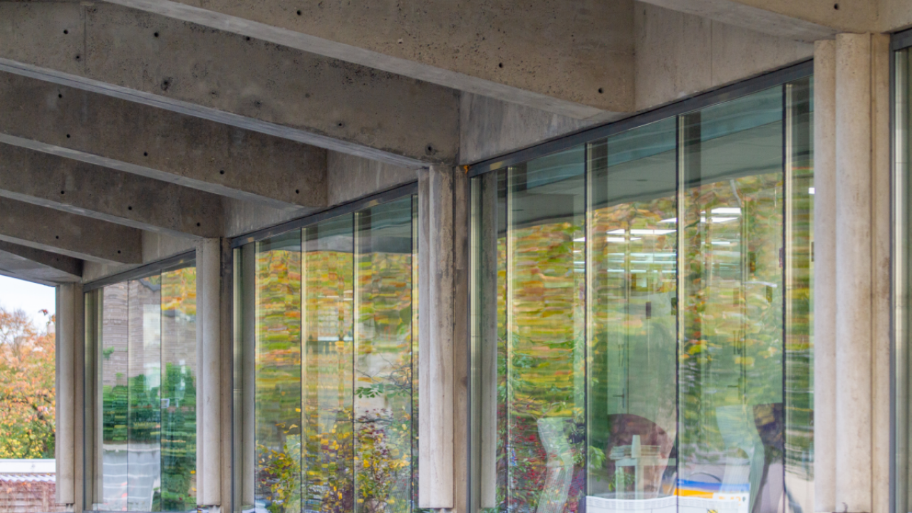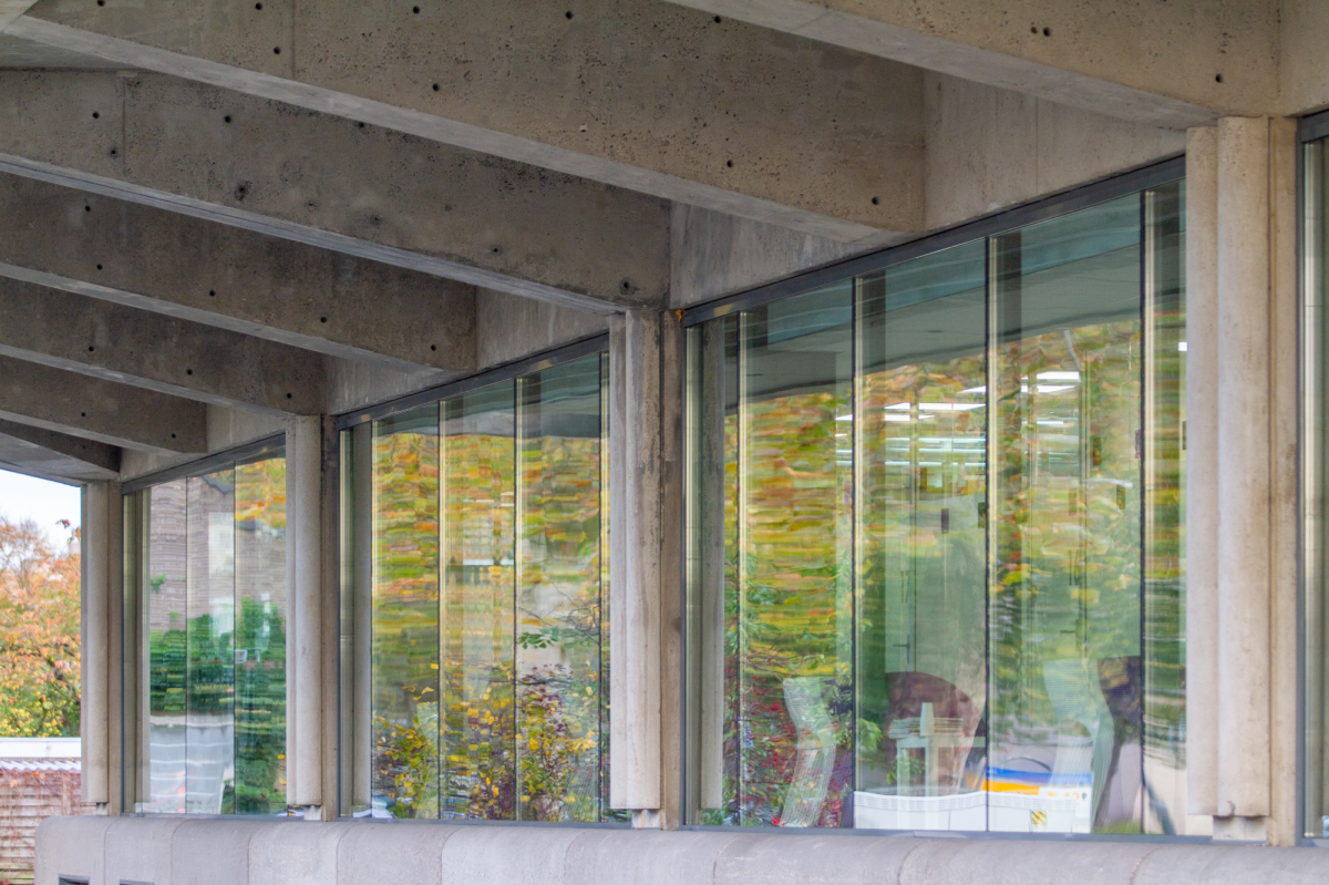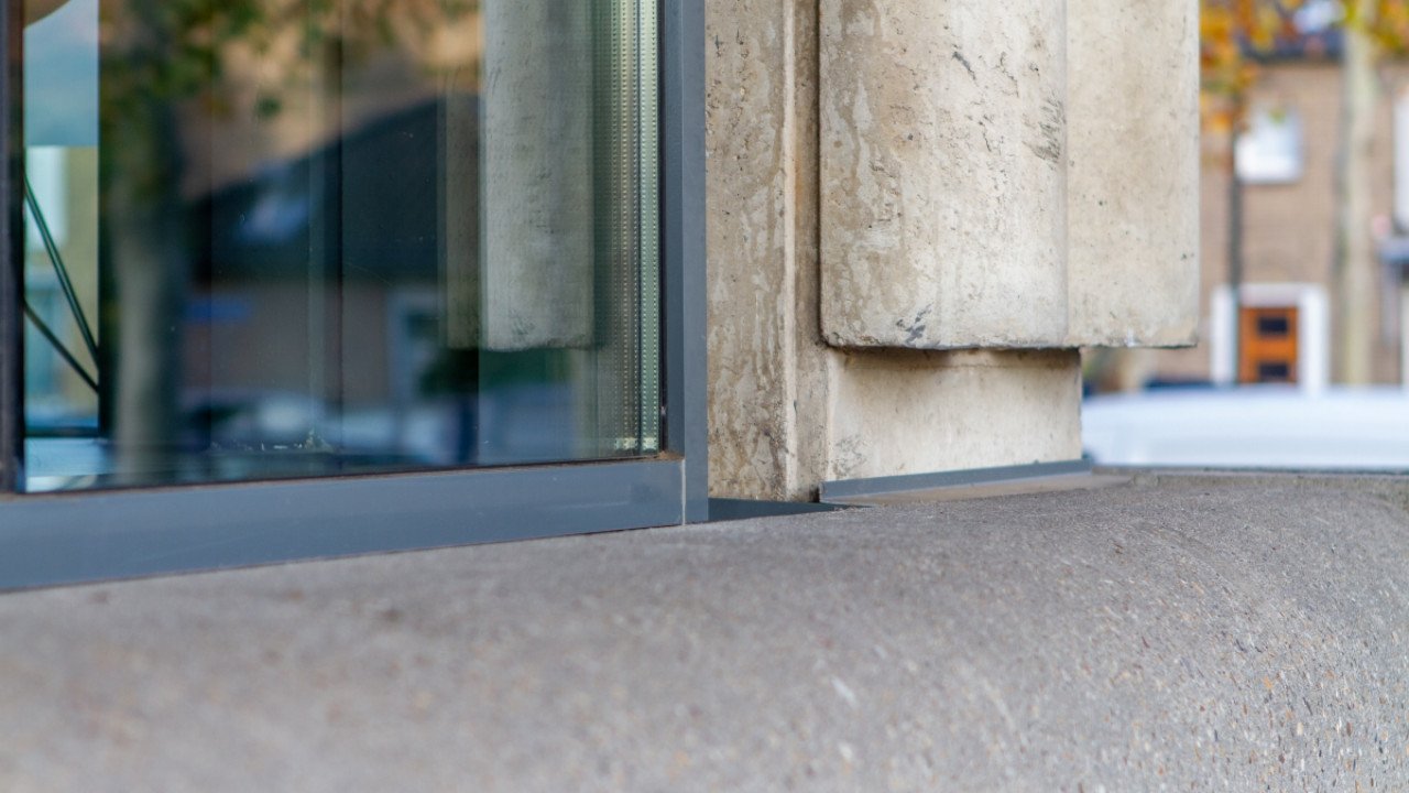 “De voornaamste ingreep was het openbreken van de gevel”, zegt architect Bas van Mierlo van architectenbureau Houben / Van Mierlo. “Zo zijn de horizontale gevel-elementen voor de vloeren verkleind en bekleed met microbeton, ze hebben nu hetzelfde volume als de verticale profielen. Die zijn overigens nieuw geplaatst. Hierdoor ligt een sterk vierkant grid over de gevel.” Het gebruikte microbeton is glad en oogt fris.