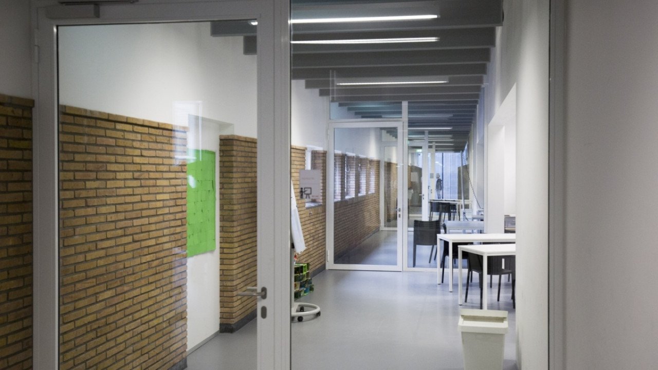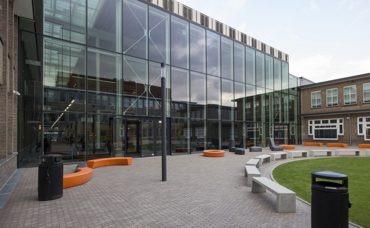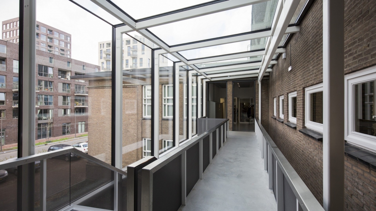 De oude gangstructuur in het voormalige Natlab met vele kleine onderzoekruimtes aan lange gangen, is optisch in stand gehouden. “We hebben glazen puien in de gang aangebracht en stukken gang aan de oude labruimtes toegevoegd, zodat de lokalen ruim genoeg zijn. Door het toepassen van glas staan alle lokalen visueel in verbinding met elkaar, een wens van het SintLucas college met het oog op sociale veiligheid”, besluit de architect.
