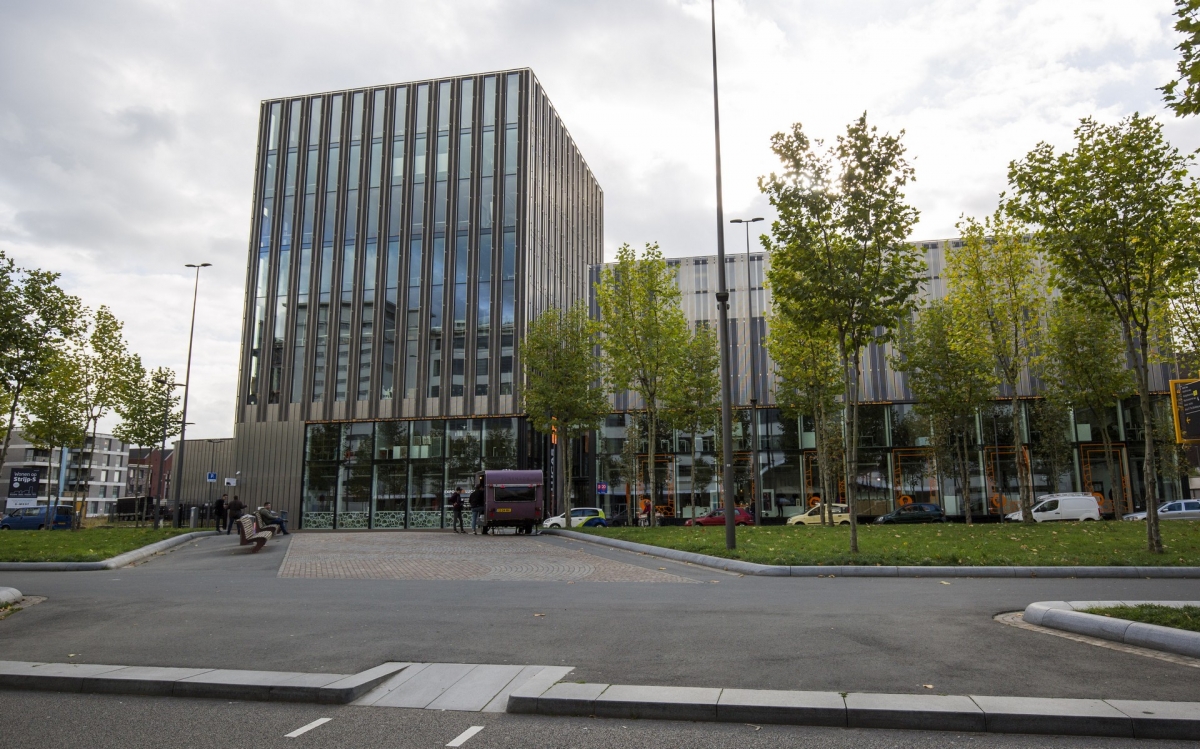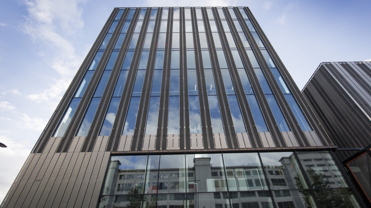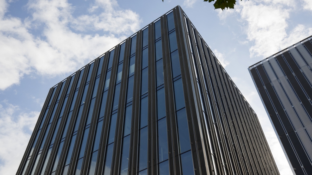 In de aluminium vliesgevelprofielen heeft gevelbouwer VPG dichte delen en glazen stroken in één systeem geïntegreerd. Hetzelfde profiel zorgt zowel voor de bevestiging van het glas als de afwerking van verticale aluminium roosters op de verdiepingen. Deze roosters variëren in dichtheid en brengen dynamiek in de gevel. Door zowel glas- als gevelpanelen in het vliesgevelsysteem te integreren, worden lekkages voorkomen en zijn tijd en middelen bespaard. Bovendien is het beeld aan de buitenzijde eenvormig.