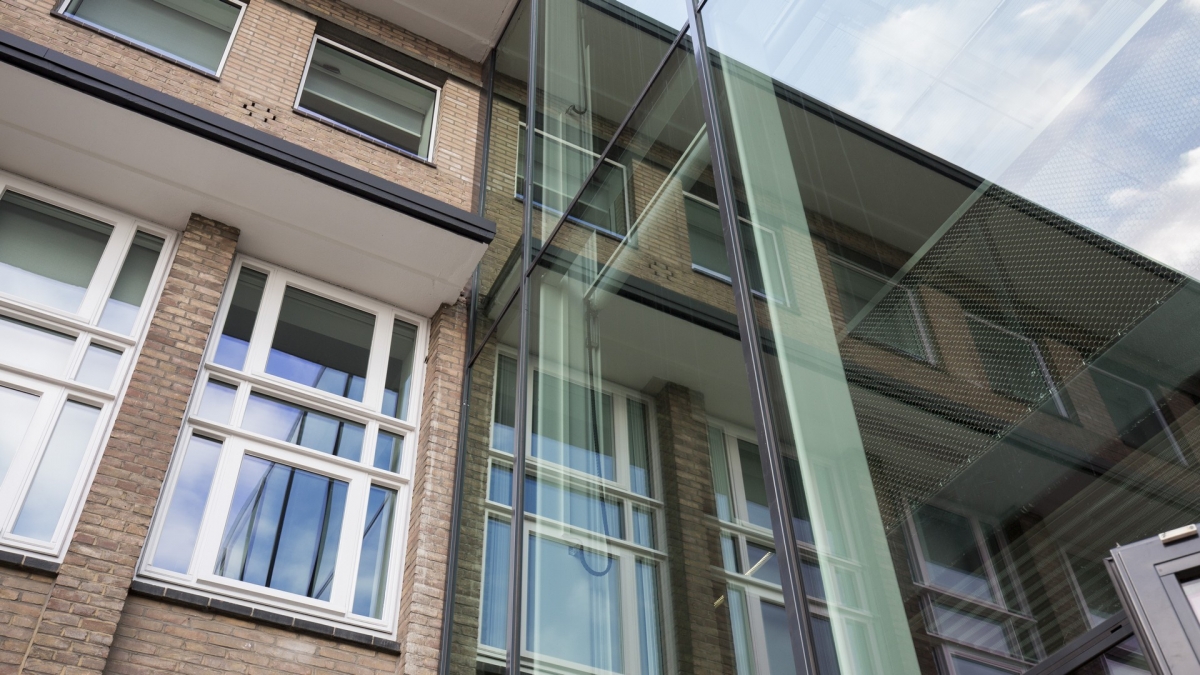 De hoge glasgevel van het atrium naar de binnentuin contrasteert met de originele horizontale bakstenen gevels met teakhouten kozijnen van het oude Natlab. “De aluminium profielen zijn hier direct op de stalen constructie gemonteerd voor een slanke en transparante uitstraling. We hebben de profielen zwart laten maken, dat versterkt de slankheid” aldus Van de Heuvel. En inderdaad: van buitenaf lijken de aluminium profielen zelfs los te staan van de witte stalen kolommen.
