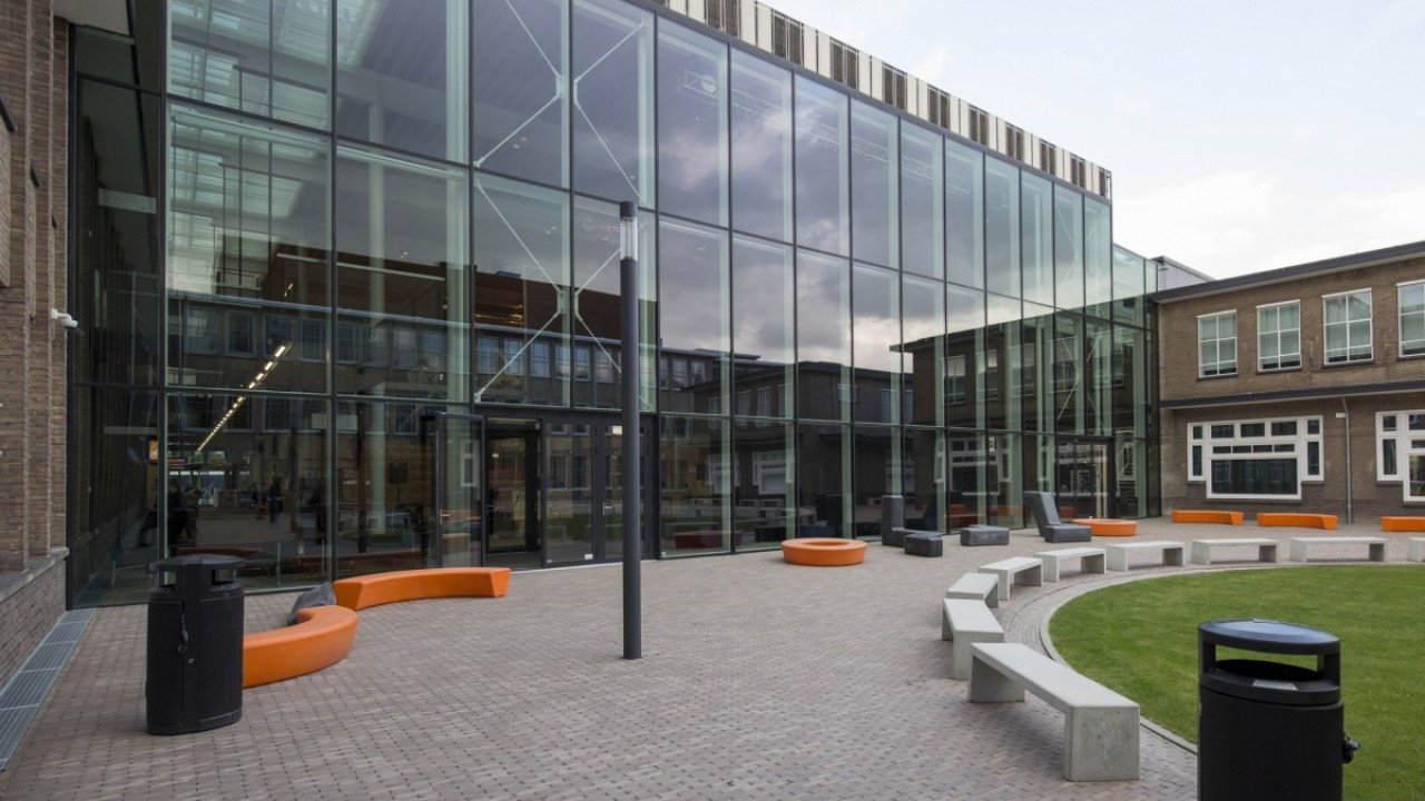 Kliklijsten met geïntegreerde vinnen kaderen de glazen plint rondom in en benadrukken de verticaliteit van de gevel. Plafondhoge glasstroken in de gevels en glazen binnenpuien brengen veel daglicht in de onderwijsruimten in de nieuwbouw.