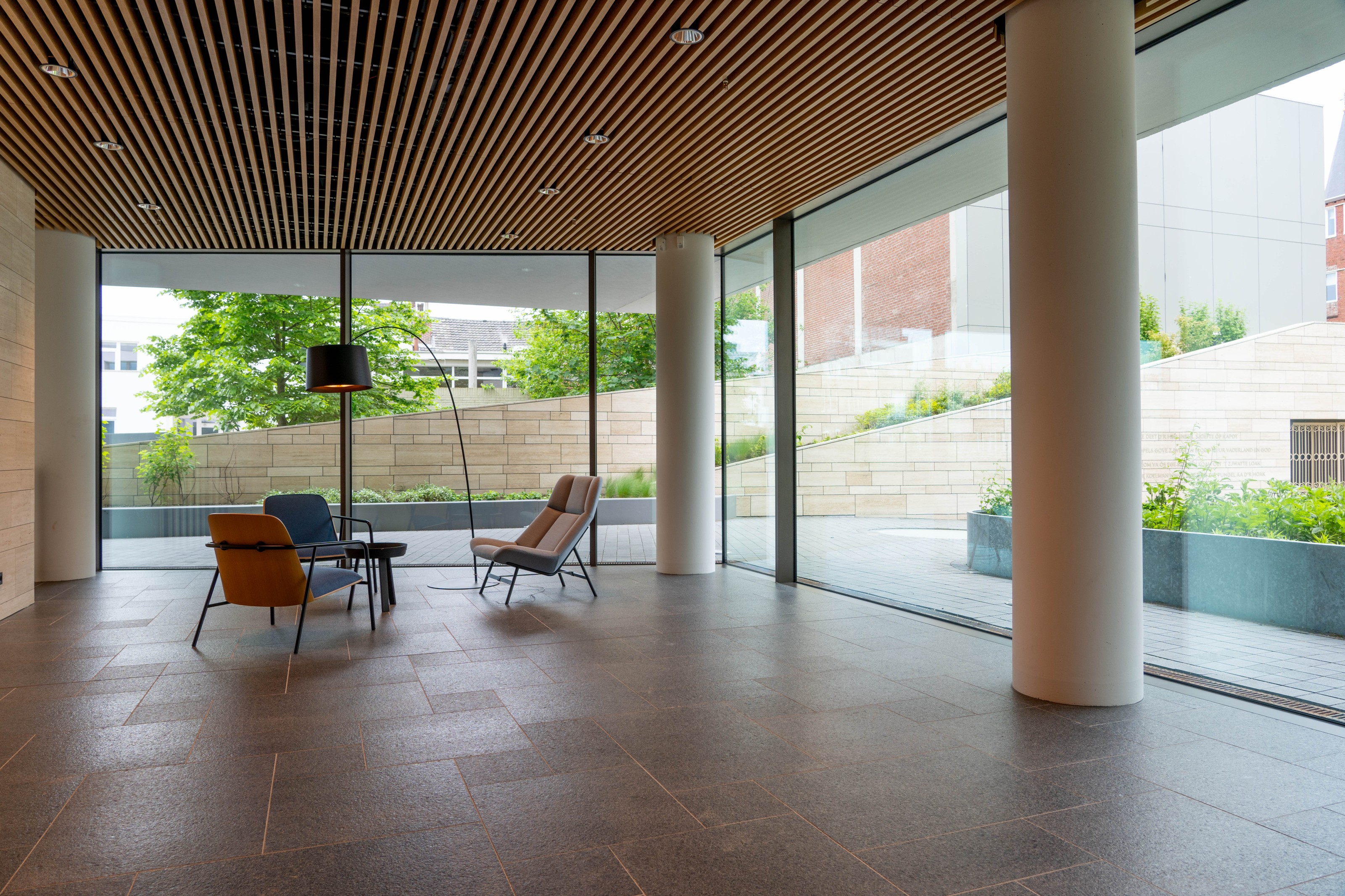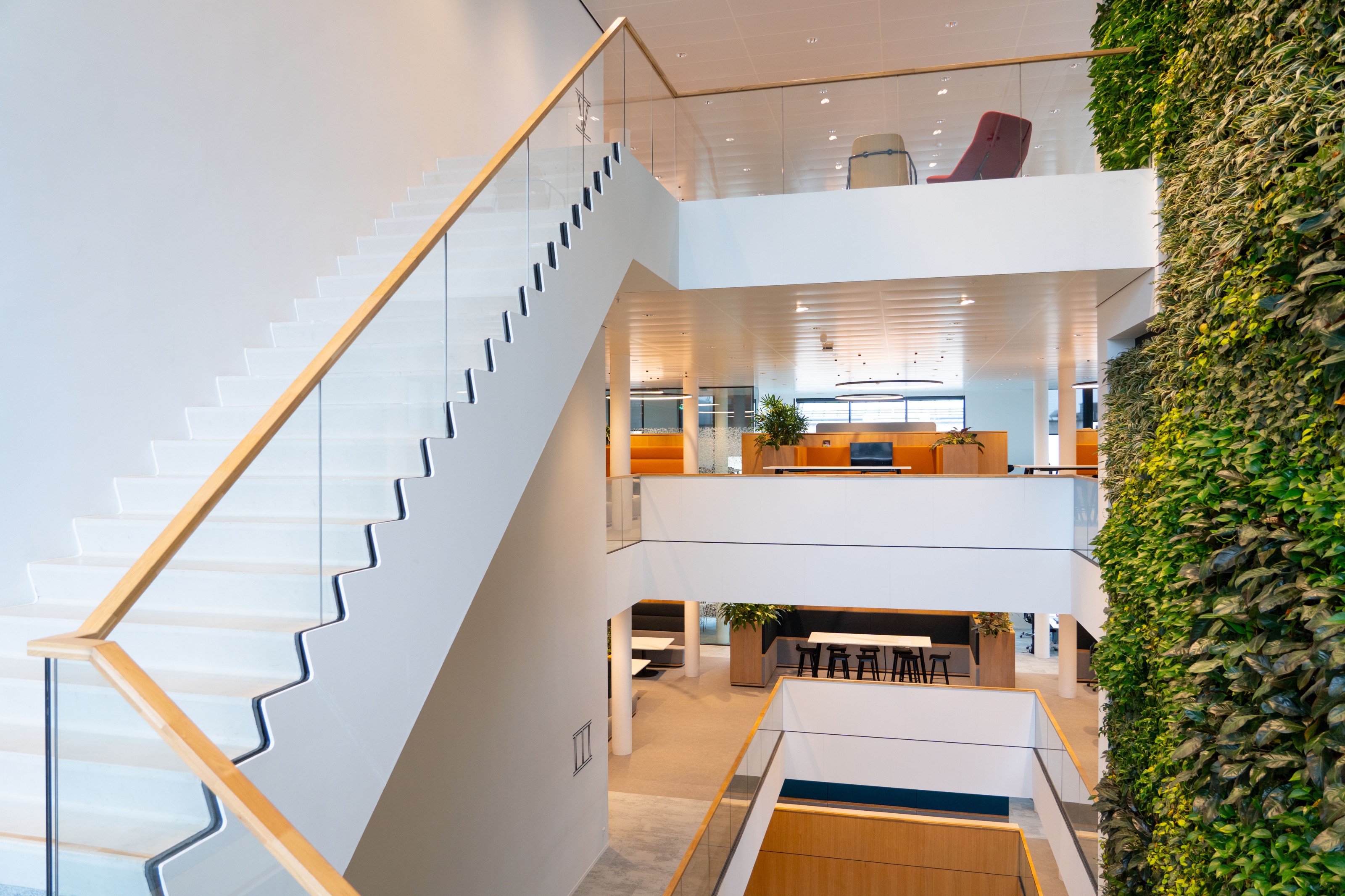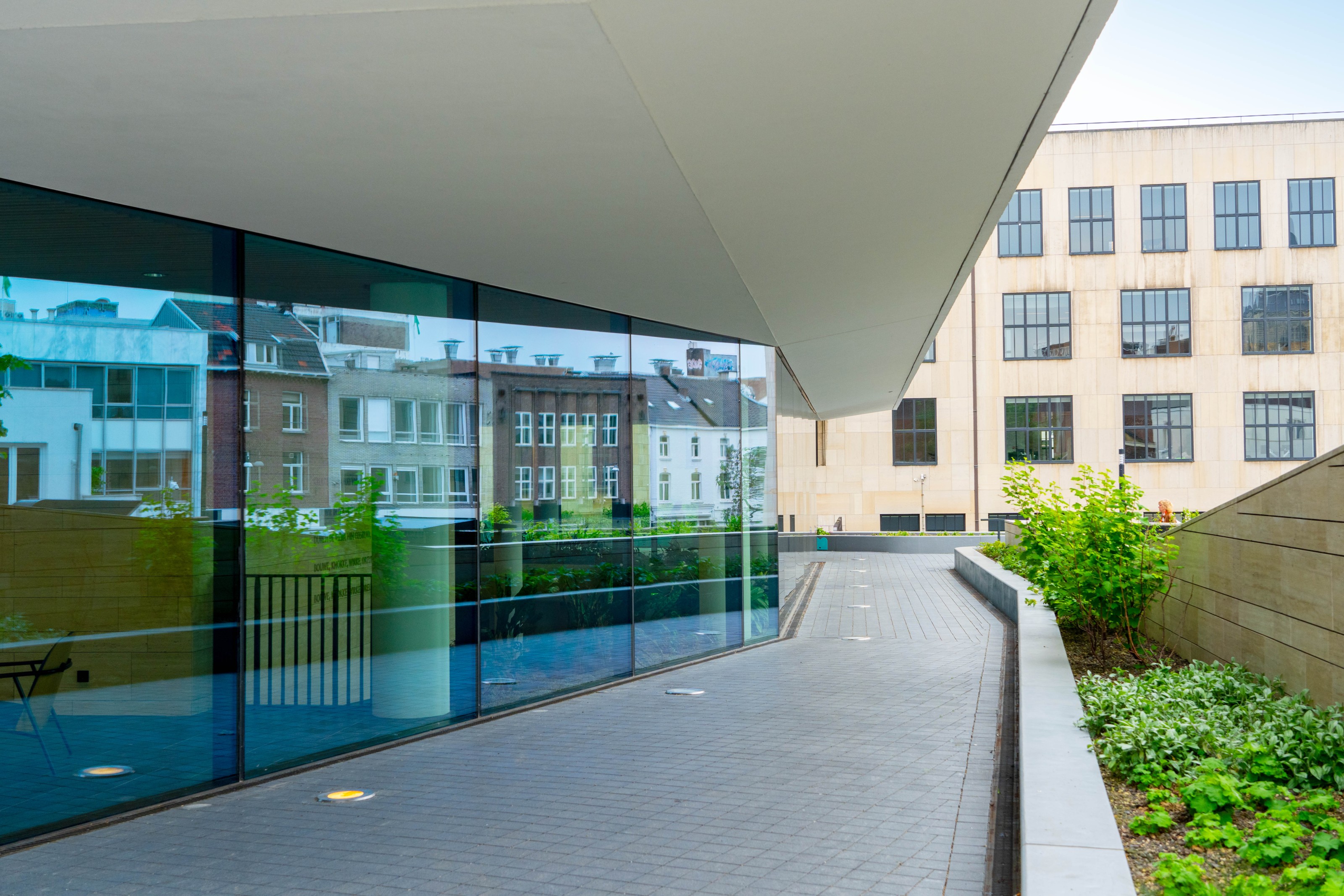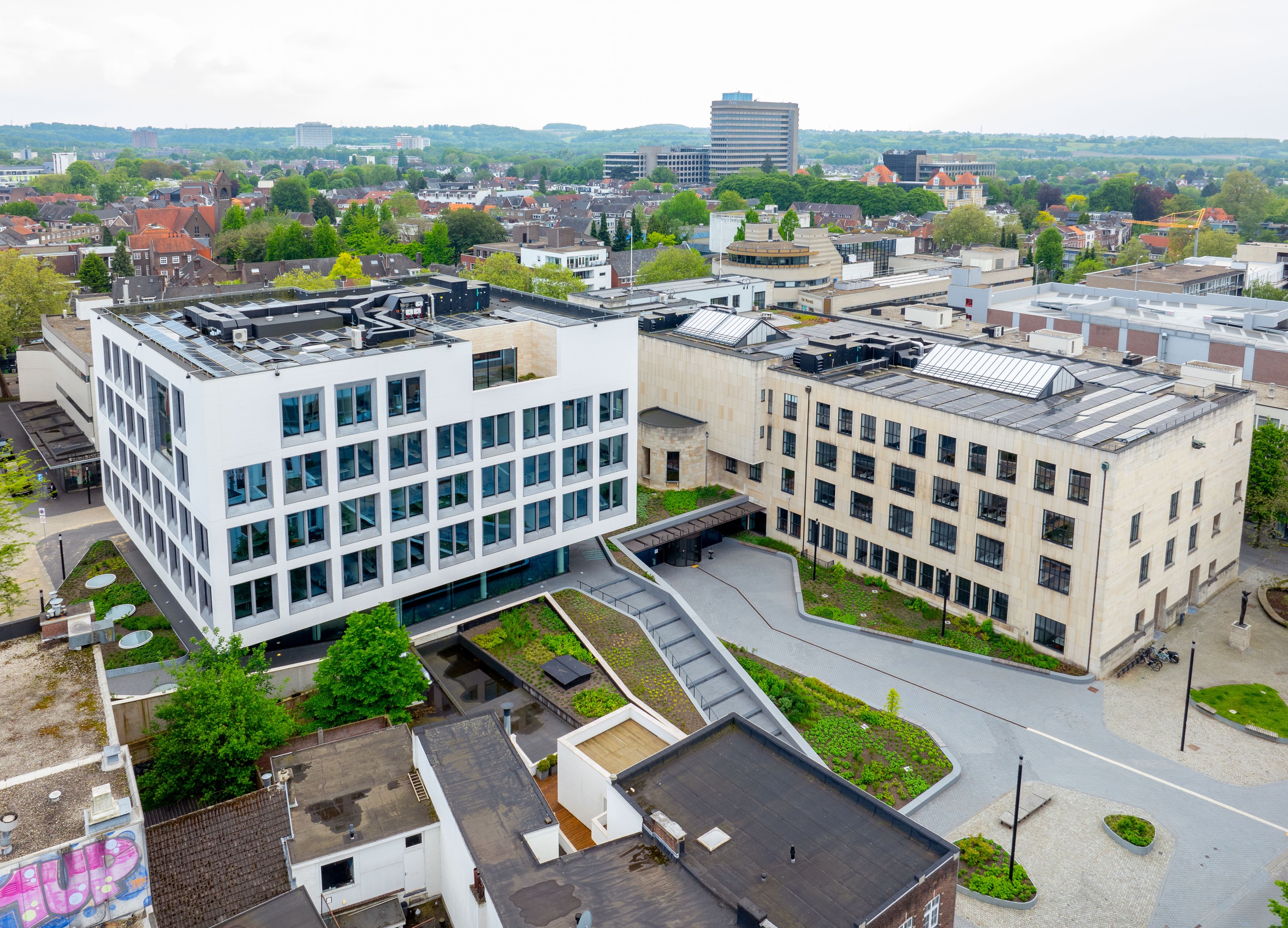 De hoofdentree van Stadskantoor Heerlen bevindt zich aan de Geleenstraat. Logischerwijs ontwierpen Van Wijlick en zijn team de publieke functies van de publiekshal op de begane grond. Het programma omvatte daarnaast een callcenter, kantoren, een vergadercentrum, een ondernemershuis en samenwerkingsruimtes. De kantoren zijn gevestigd vanaf de tweede verdieping door middel van een vide verbonden met het publieke gebied. Het ontwerp benut de niveauverschillen in het terrein. Een deel van het gewenste volume is ondergebracht in de kelder van het voormalige stadskantoor en langs de verbindende as met het oude Raadhuis. Het stoeien met de volumes bleek een lastige legpuzzel. De gouden ingeving kwam na het bestuderen van een oud boekwerk van Peutz. “Bij ons op kantoor lag een zeldzaam naslagwerk. Toen wij het doorbladerden, stuitten wij op schetsen van een oude gedachteniskapel op dezelfde locatie als de nieuwbouw. Opeens zagen we op die schets hoe het Raadhuis tot zijn recht kwam. Door simpelweg een lager volume te gebruiken dan de gemeente voorschreef. Dat was een eyeopener. De schets die hieruit voortvloeide, werd het uiteindelijke ontwerp.”
