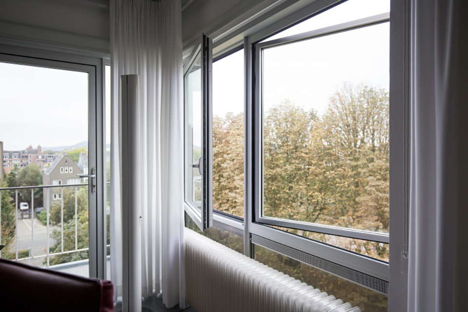 Architect Vandenboorn licht zijn ontwerpbeslissingen toe: “De keuze voor aluminium kozijnen was snel gemaakt, aangezien deze er van oorsprong ook al in zaten. Ter plekke van de betonkolommen achter de gevel waren er taatsramen in de kozijnen gezet, zodat deze ook van binnenuit gereinigd konden worden. Ik heb aanvankelijk bekeken of het mogelijk was om aluminium taatskozijnen toe te passen maar een bevredigend kozijn was niet leverbaar. Mijn keuze viel op een kozijn met een even slank profiel als het oorspronkelijke: het renovatiekozijn van Reynaers met een profielbreedte van 5 cm. Als oplossing voor het reinigen van de ramen van binnenuit, zijn ter plekke van de betonkolommen ramen toegepast, die 180 graden naar buiten draaien. Vanuit het naar binnen draaiende raam ernaast, kan de bewoner zo beide ramen wassen. Eigenlijk zou je kunnen stellen dat de taats opgeschoven is.” Er zijn nu alternerend naar buiten en naar binnen draaiende kozijnen toegepast.