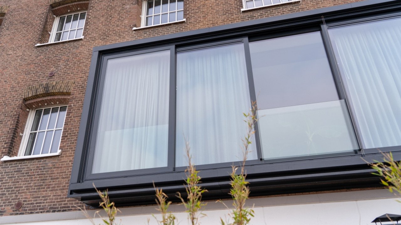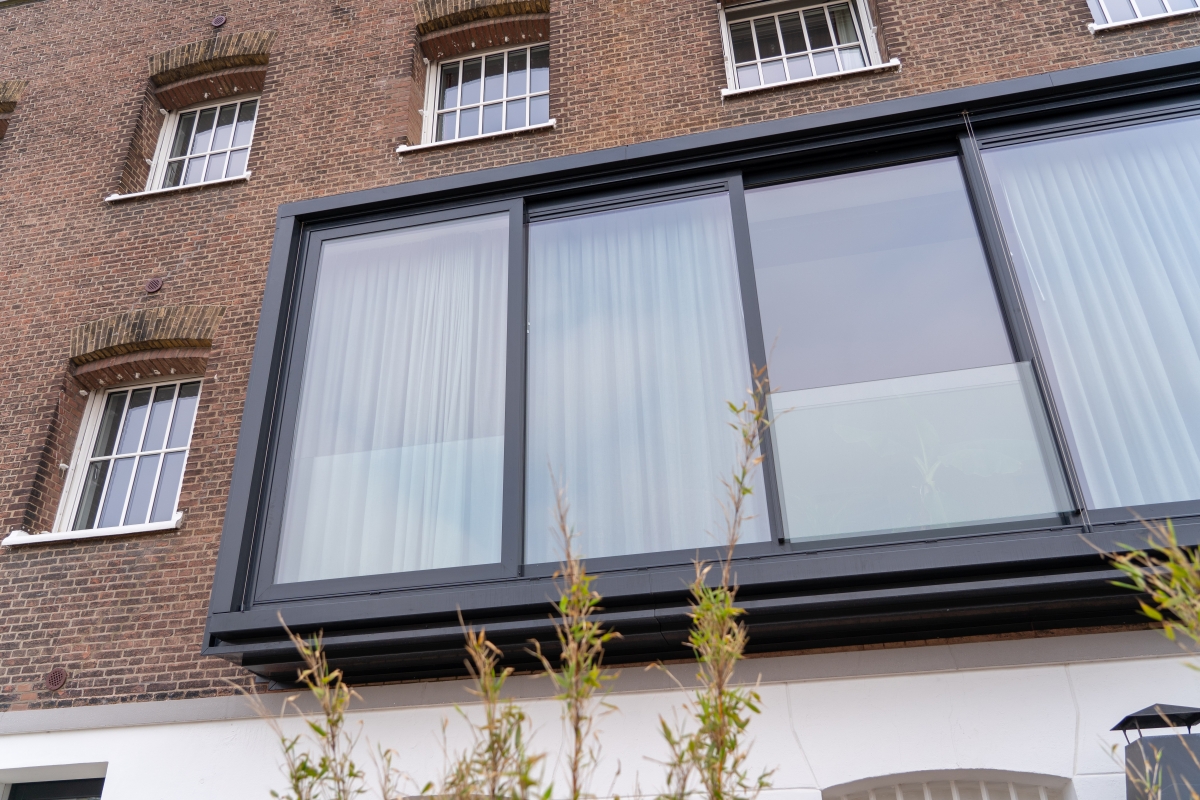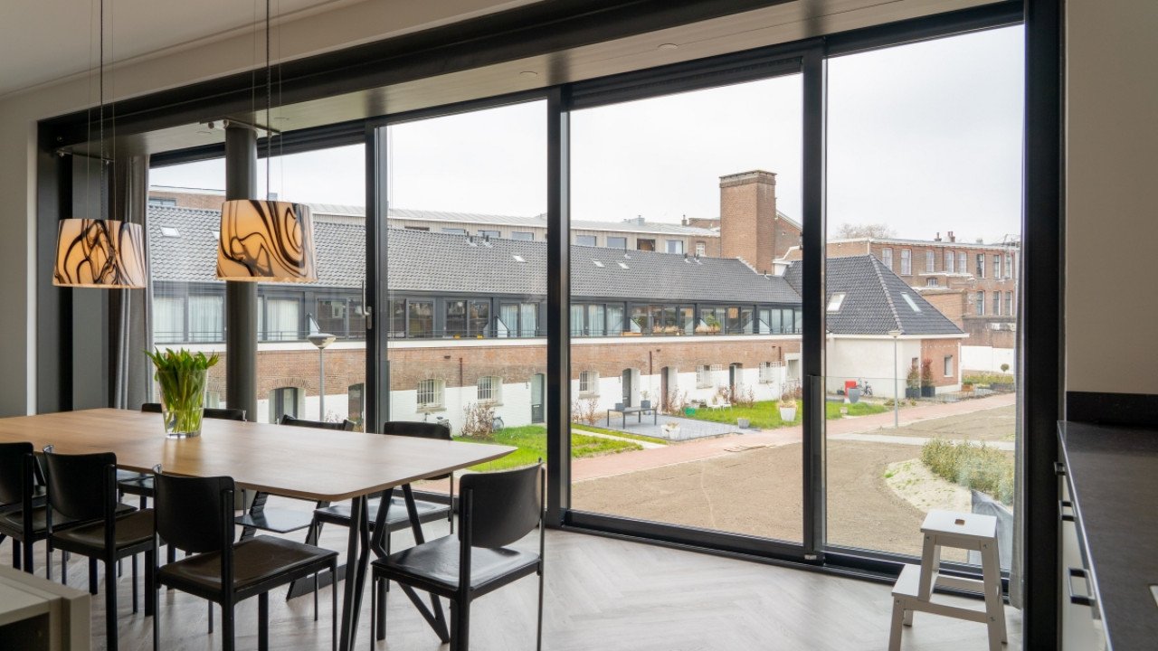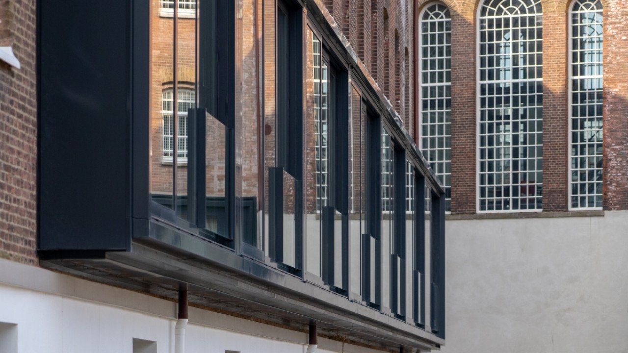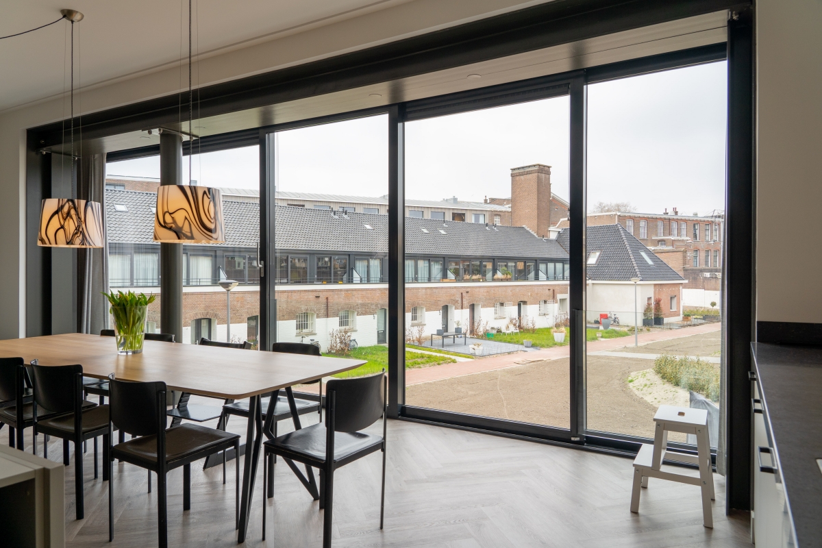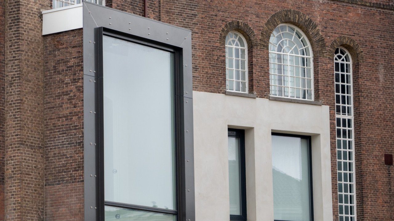De vier cellenvleugels spreiden zich als langgerekte tentakels uit vanuit het centrale Panopticum. Iedere gevel kent een witte plint met daarboven een brede erker met schuifpuien die als een zwarte band over de gevel loopt. Nelissen legt deze keuze uit: “De witte plint hebben we bewust zo gelaten. Dit zorgde er in de oude gevangenistijd voor dat je bij een eventuele ontsnapping silhouetten beter kon zien. Een subtiele verwijzing naar het verleden dus. De brede zwarte schuifpuien zorgen voor een collectief gebaar. Hiervoor hebben we de gevel opengebroken en een staalconstructie met aluminium schuifpuien geplaatst. Dit om per woning in één keer met een grote ingreep daglicht en uitzicht te bieden en de strenge ritmiek van de celramen te doorbreken. Uiteindelijk was Reynaers Aluminium de enige partij die een vijfdelige schuifpui van 8 meter breed en 3 meter hoog kon leveren. Daarnaast hebben ze ook de kozijnen met tralielook geleverd. Dankzij de hulp van gevelbouwers Facedo, VPG Aluminium en Stalku Geveltechniek hebben we deze klus succesvol kunnen klaren. Die elementen zijn echt beeldbepalend als je dit gebouw vanaf de straatkant bekijkt.”
