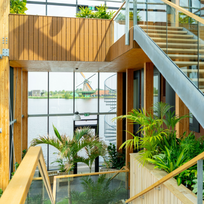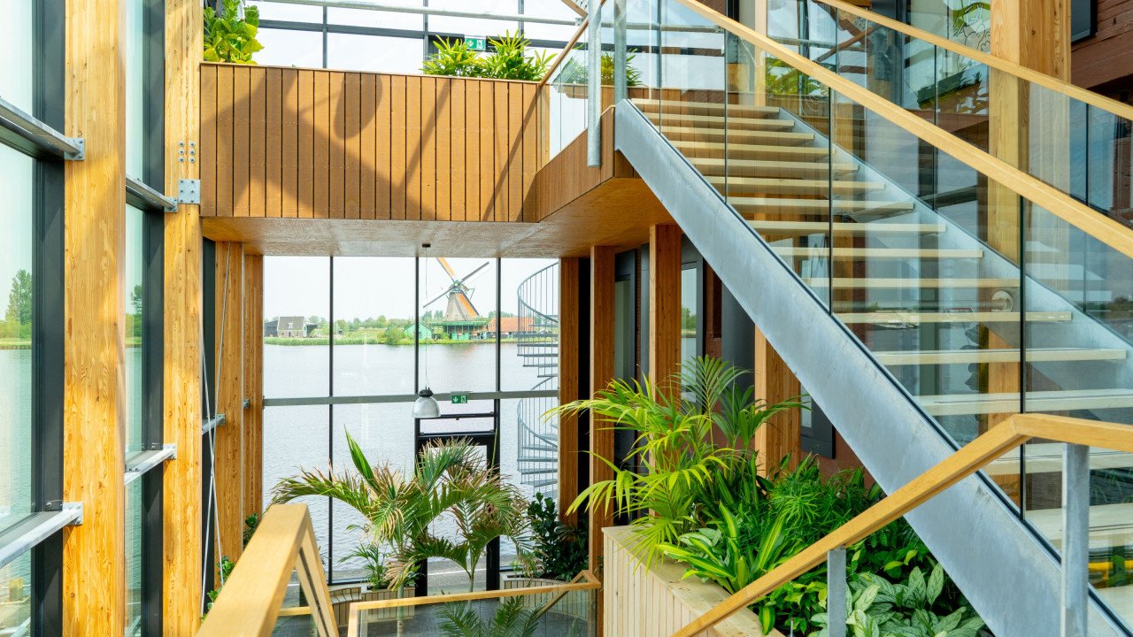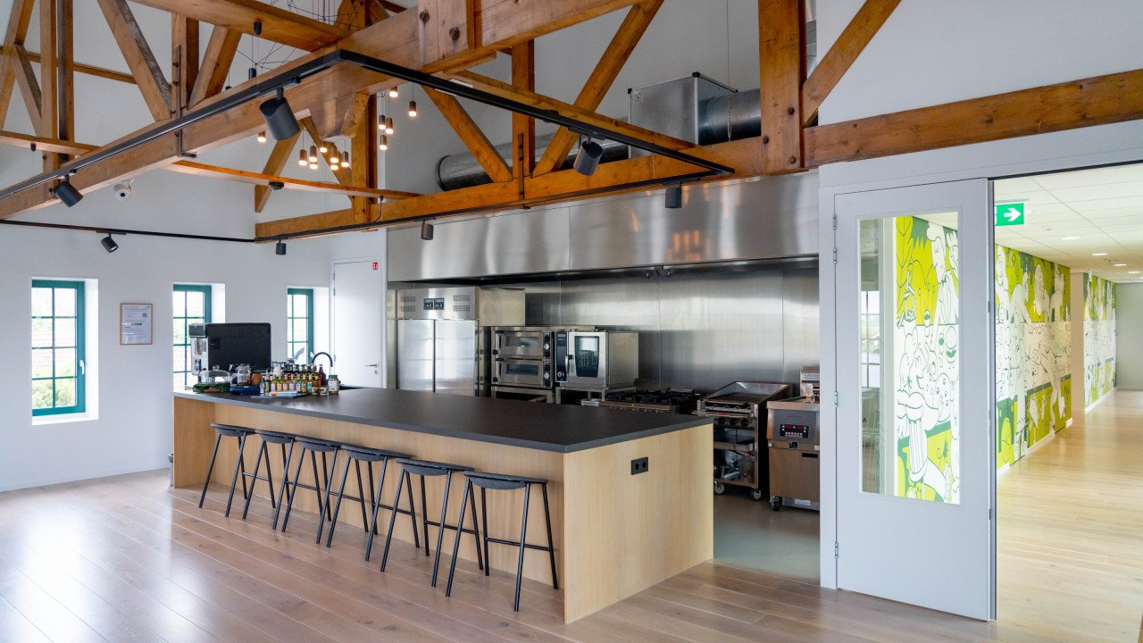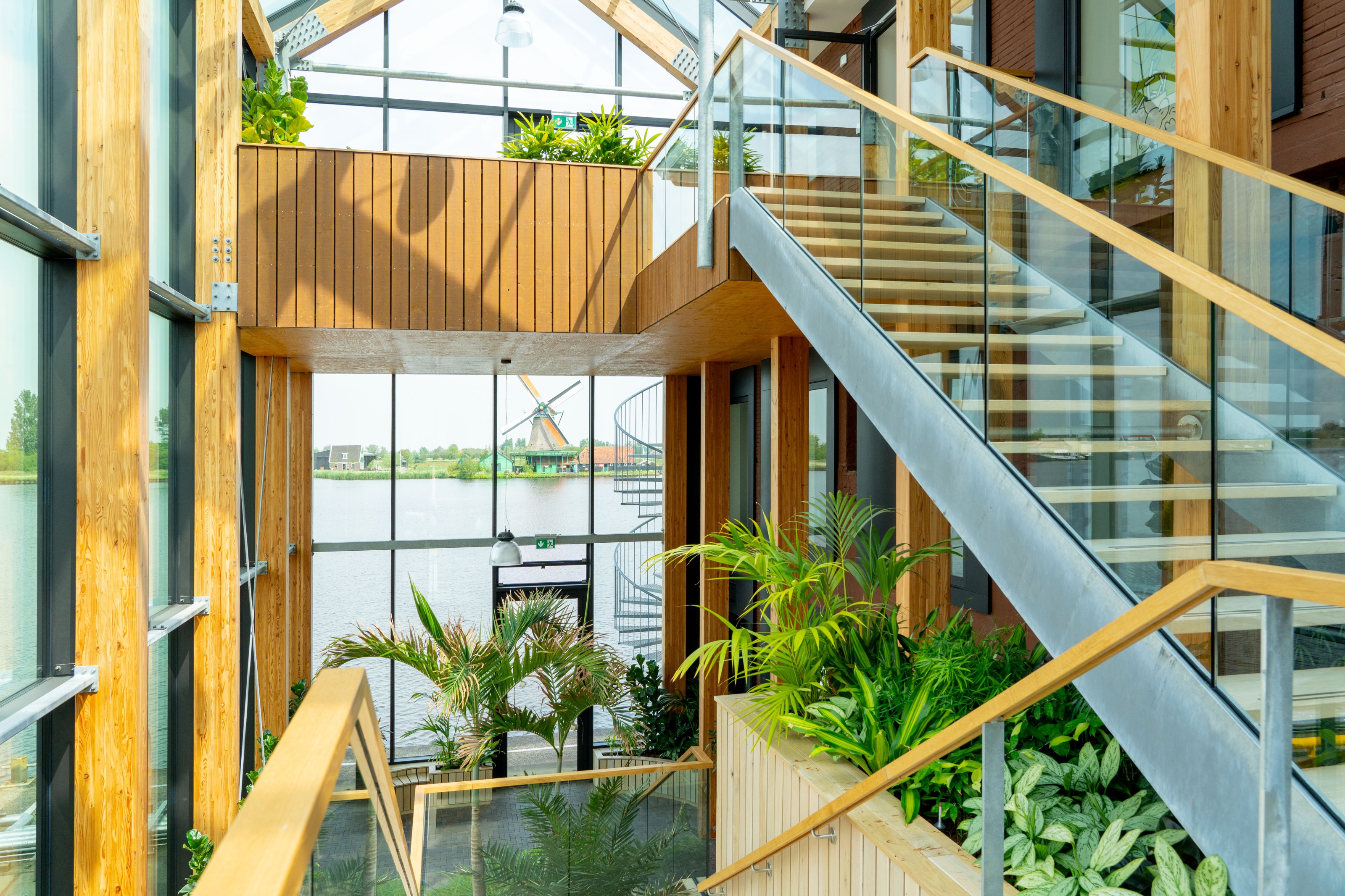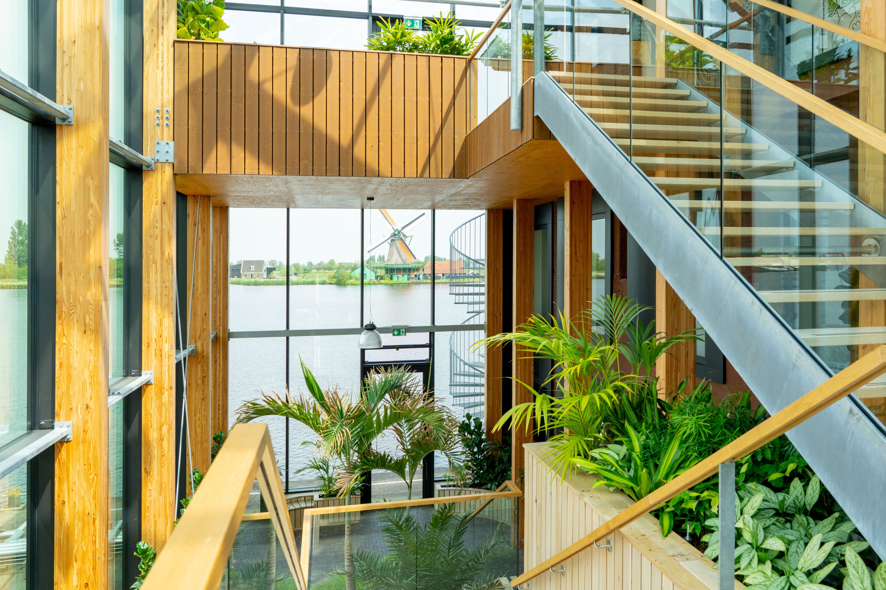 “Hollandser dan dit kan bijna niet,” vertelt Marta Roy, senior architect bij RAU. Staand vanaf de bovenste verdieping van het Plant Based Center of Excellence, kijken bezoekers uit over de meanderende rivier de Zaan, geflankeerd door een rij molens. RAU kreeg de opdracht om de oude loods te transformeren tot een innovatie- en bezoekerscentrum waar de laatste technieken op het gebied van de plantaardige voedselindustrie te zien zijn. Bovendien moest het een uitnodigende plek worden waar bezoekers van over de hele wereld overtuigt raken van de AAK-producten. Een complex vraagstuk. Roy vertelt: “Als grote industriële speler was AAK echt op zoek naar een toplocatie. Niet alleen ligt de productiefabriek pal naast het innovatiecentrum. Aan de achterzijde grenst het aan de Zaan met een subliem uitzicht over de Zaanse Schans. Het moest een plek worden waar bezoekers echt mee op reis gaan door de wereld van AAK. Een paradepaardje waar je lezingen kunt houden, kookdemonstraties kunt geven en video-opnames kunt maken. Die klantreis was een belangrijk uitgangspunt voor het uiteindelijke ontwerp.”