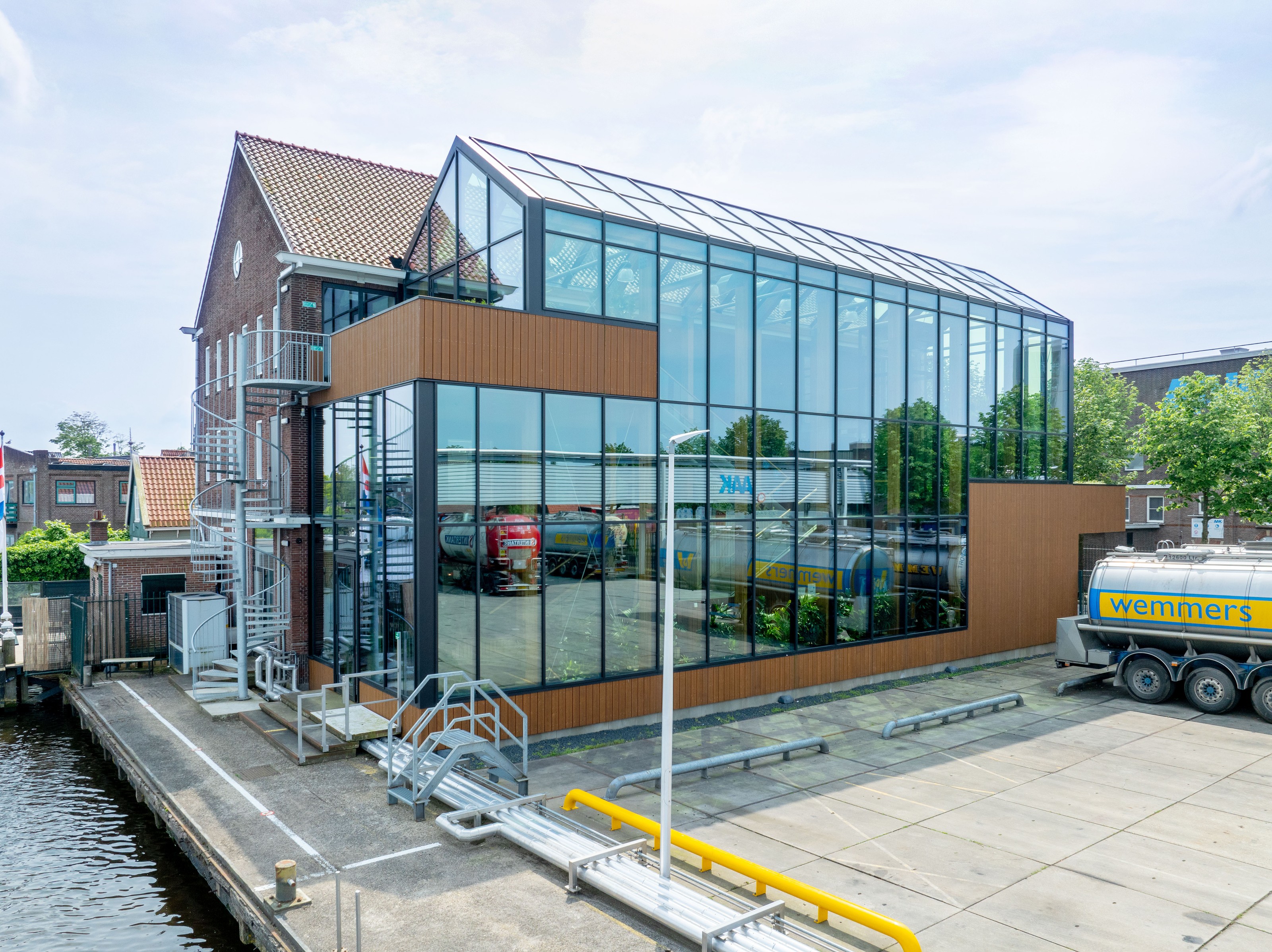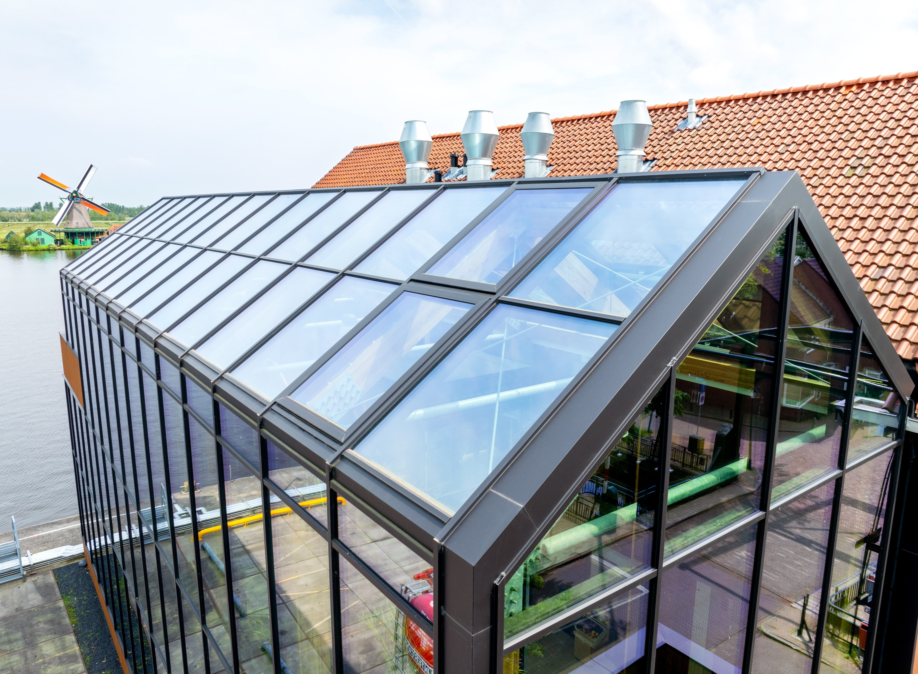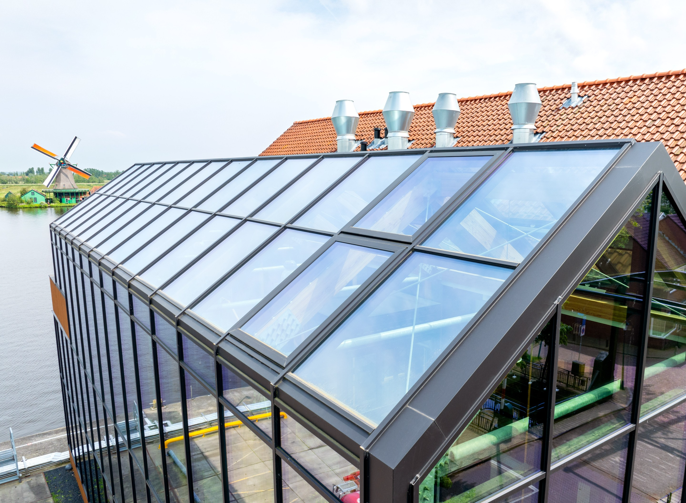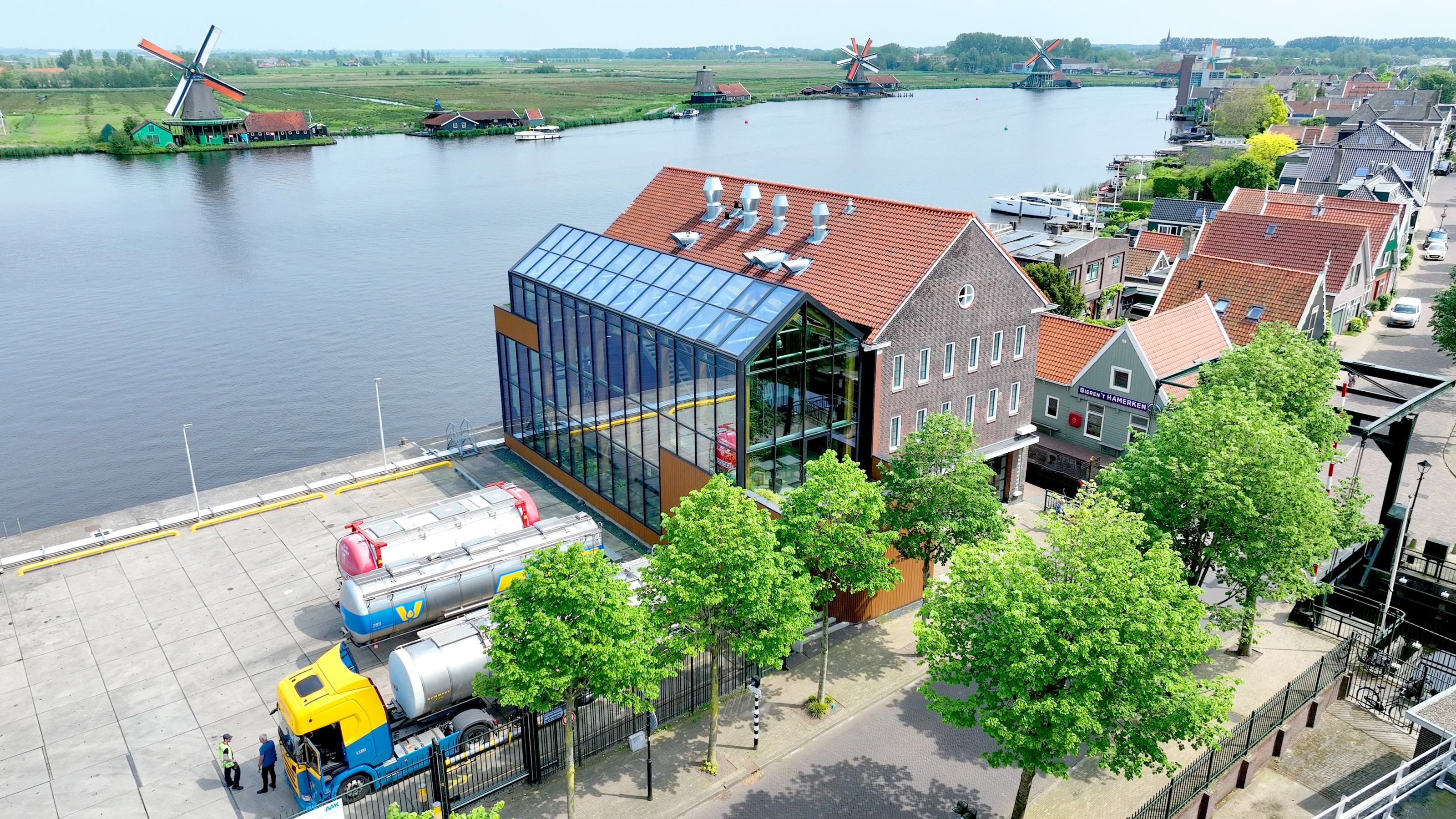 “Hollandser dan dit kan bijna niet,” vertelt Marta Roy, senior architect bij RAU. Staand vanaf de bovenste verdieping van het Plant Based Center of Excellence, kijken bezoekers uit over de meanderende rivier de Zaan, geflankeerd door een rij molens. RAU kreeg de opdracht om de oude loods te transformeren tot een innovatie- en bezoekerscentrum waar de laatste technieken op het gebied van de plantaardige voedselindustrie te zien zijn. Bovendien moest het een uitnodigende plek worden waar bezoekers van over de hele wereld overtuigt raken van de AAK-producten. Een complex vraagstuk. Roy vertelt: “Als grote industriële speler was AAK echt op zoek naar een toplocatie. Niet alleen ligt de productiefabriek pal naast het innovatiecentrum. Aan de achterzijde grenst het aan de Zaan met een subliem uitzicht over de Zaanse Schans. Het moest een plek worden waar bezoekers echt mee op reis gaan door de wereld van AAK. Een paradepaardje waar je lezingen kunt houden, kookdemonstraties kunt geven en video-opnames kunt maken. Die klantreis was een belangrijk uitgangspunt voor het uiteindelijke ontwerp.”