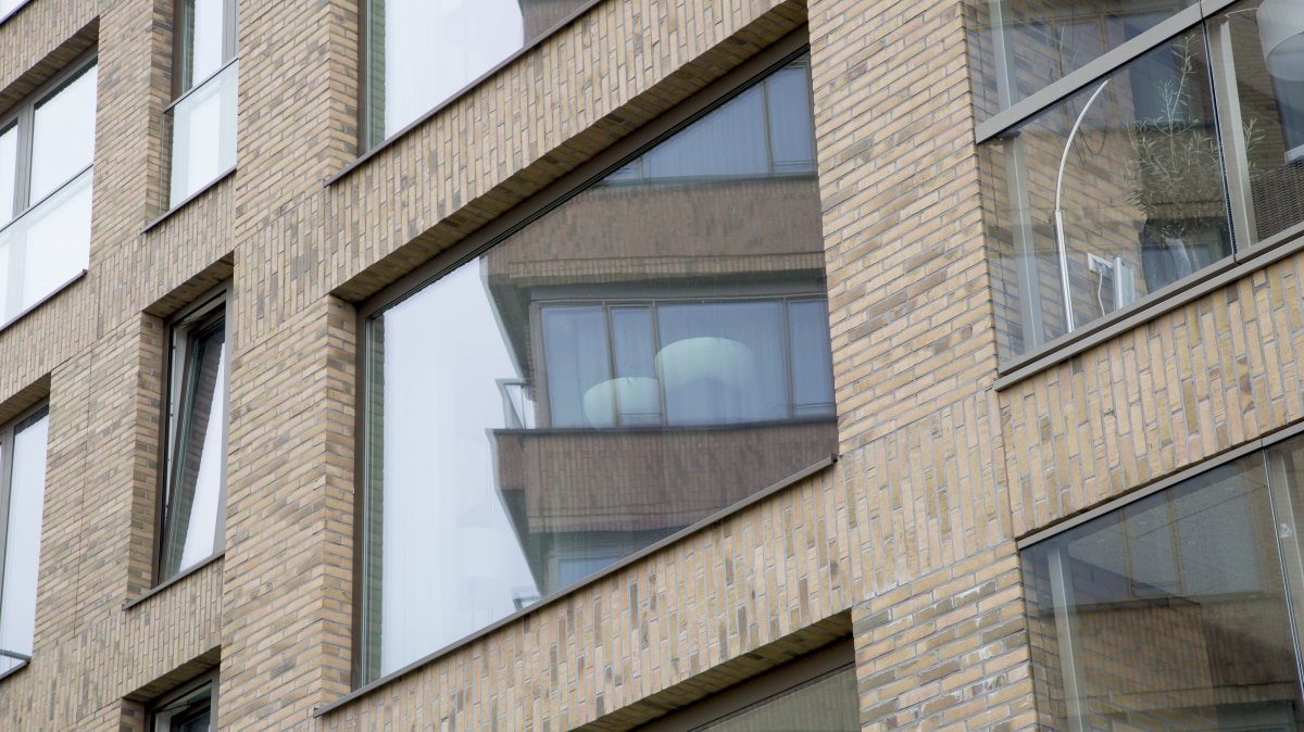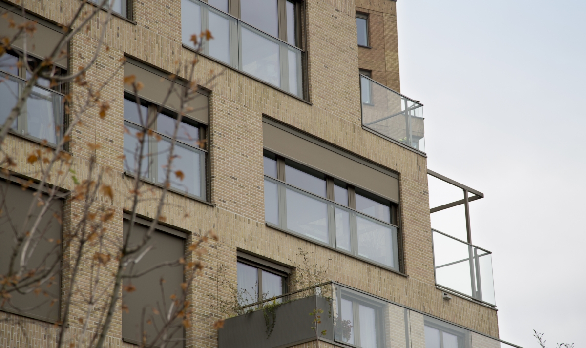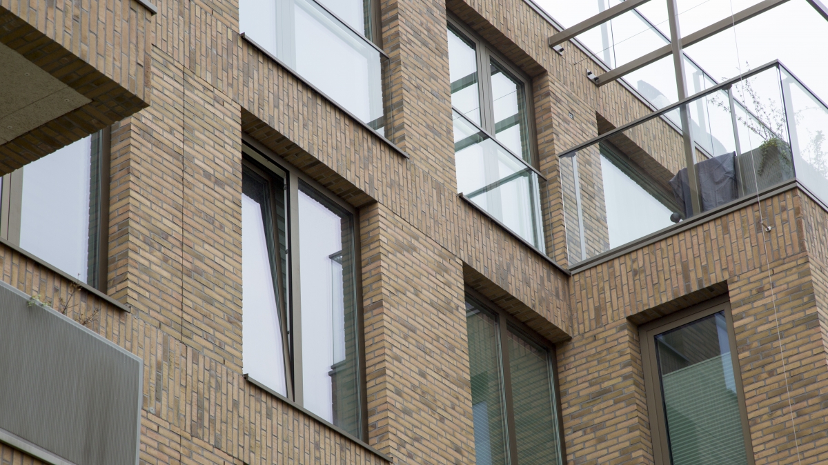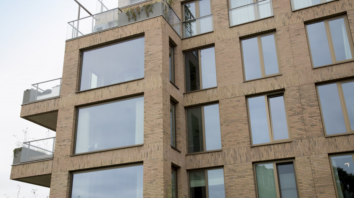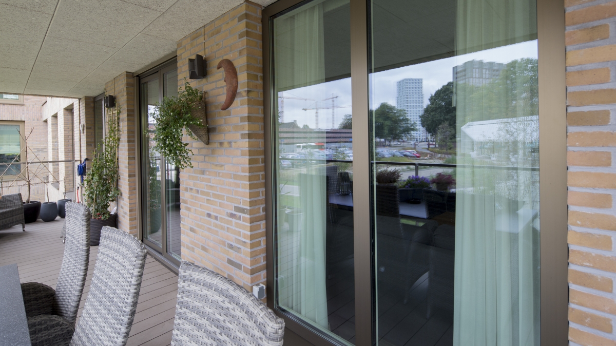 “De appartementen op de bovenste twee lagen zijn daar, waar geen terrassen of balkons zijn, voorzien van kozijnen met brede dubbele draaikiepramen, zodat bewassing van de ramen geheel van binnenuit mogelijk is. De draai(kiep)ramen voor de bewassing hebben ook grote afmetingen, passend bij de overige grote ramen, precies wat we wilden”, verzekert de architect.