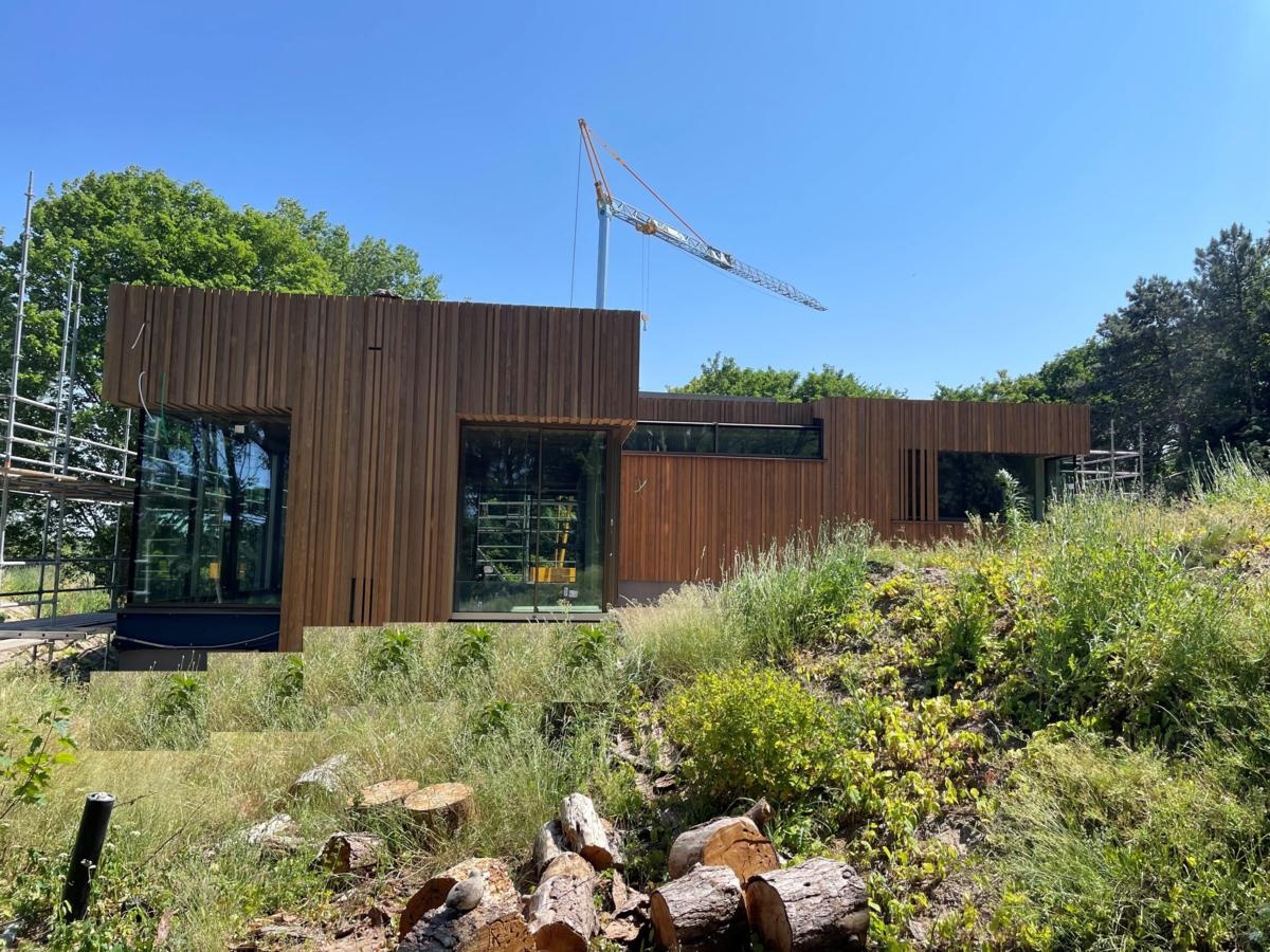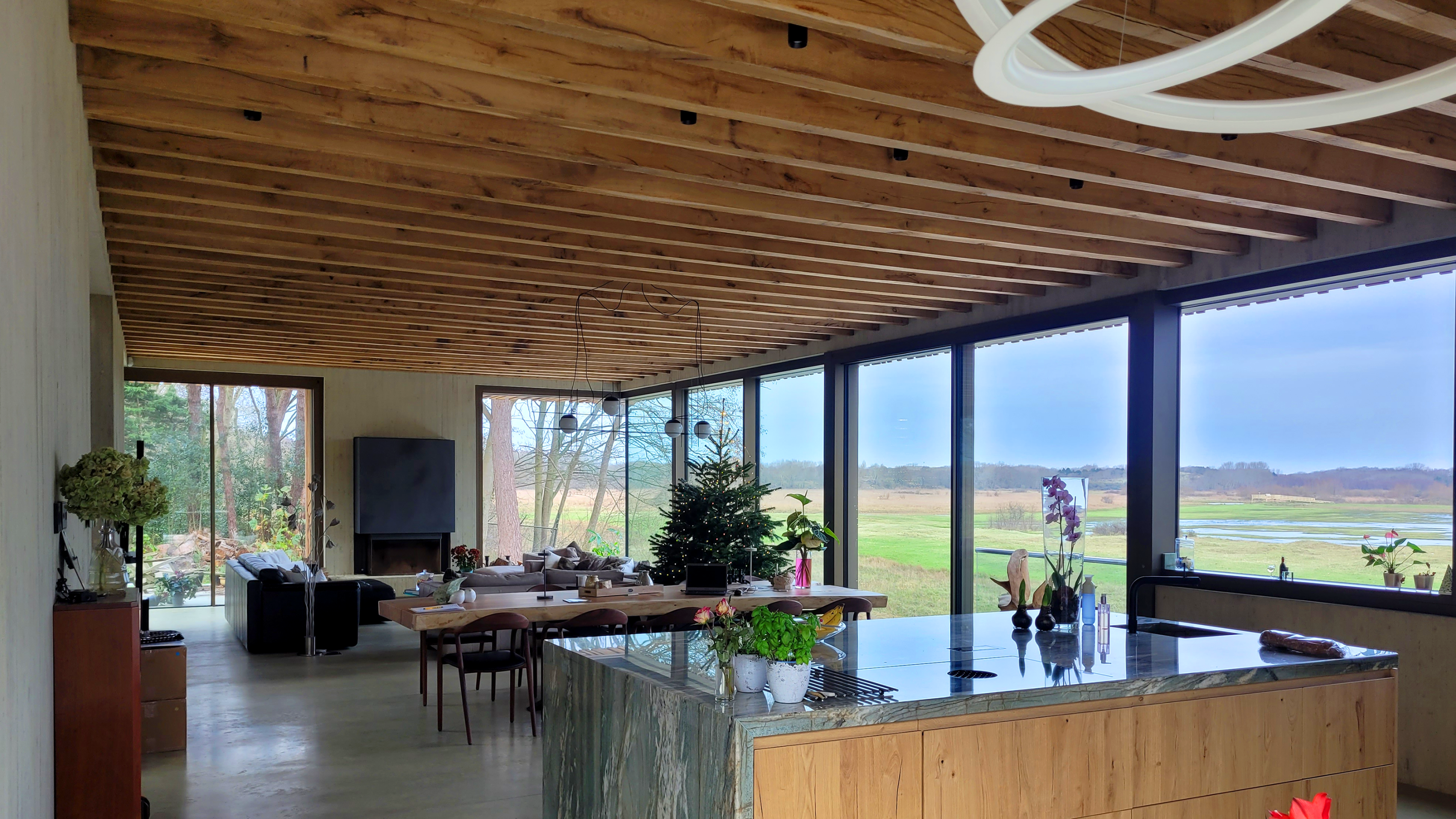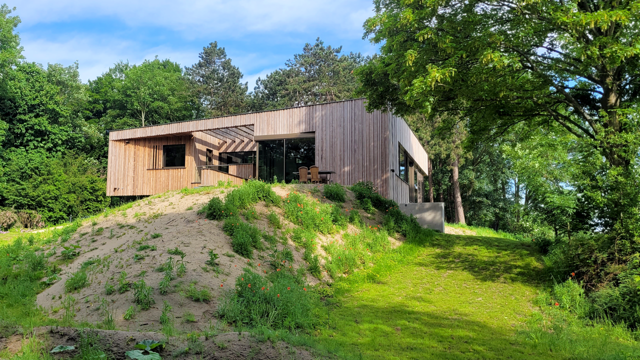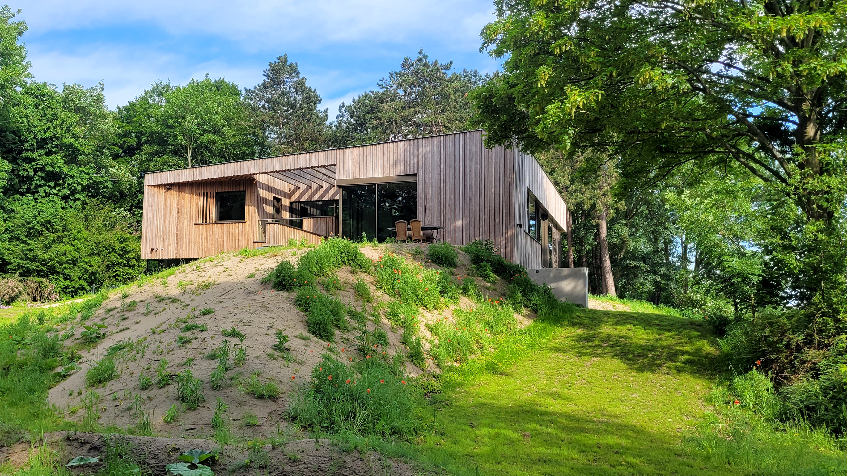 Deze ingetogen villa is deels ingegraven in de duinen en kijkt uit over een natuurgebied. De materialen, zoals inlands eiken, Fraké, beton en geanodiseerd aluminium tonen hun ware aard. De kozijnen met grote glasoppervlaktes, ook in het dak, verzorgen een mooie lichtval.