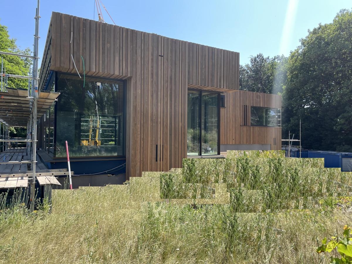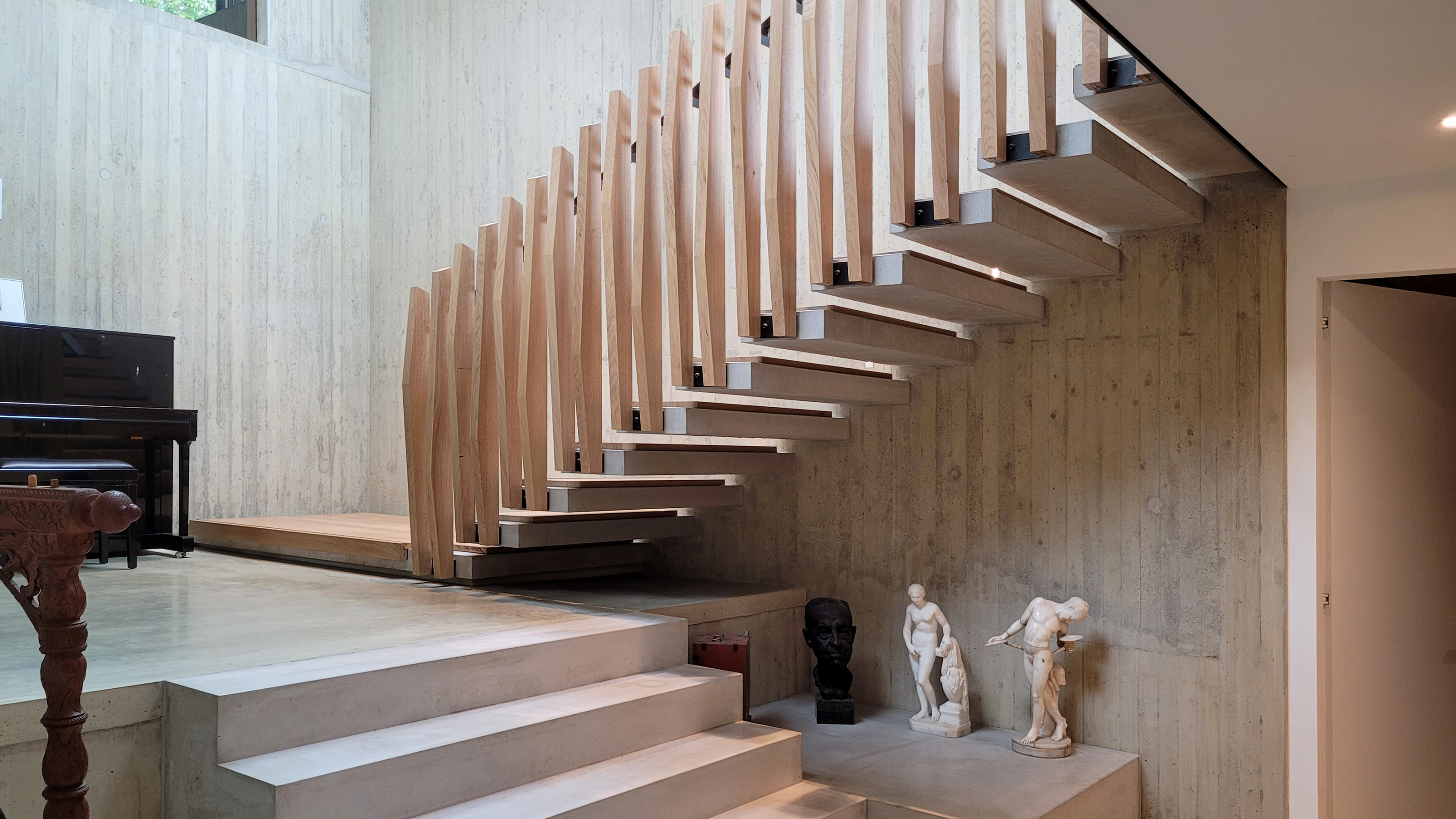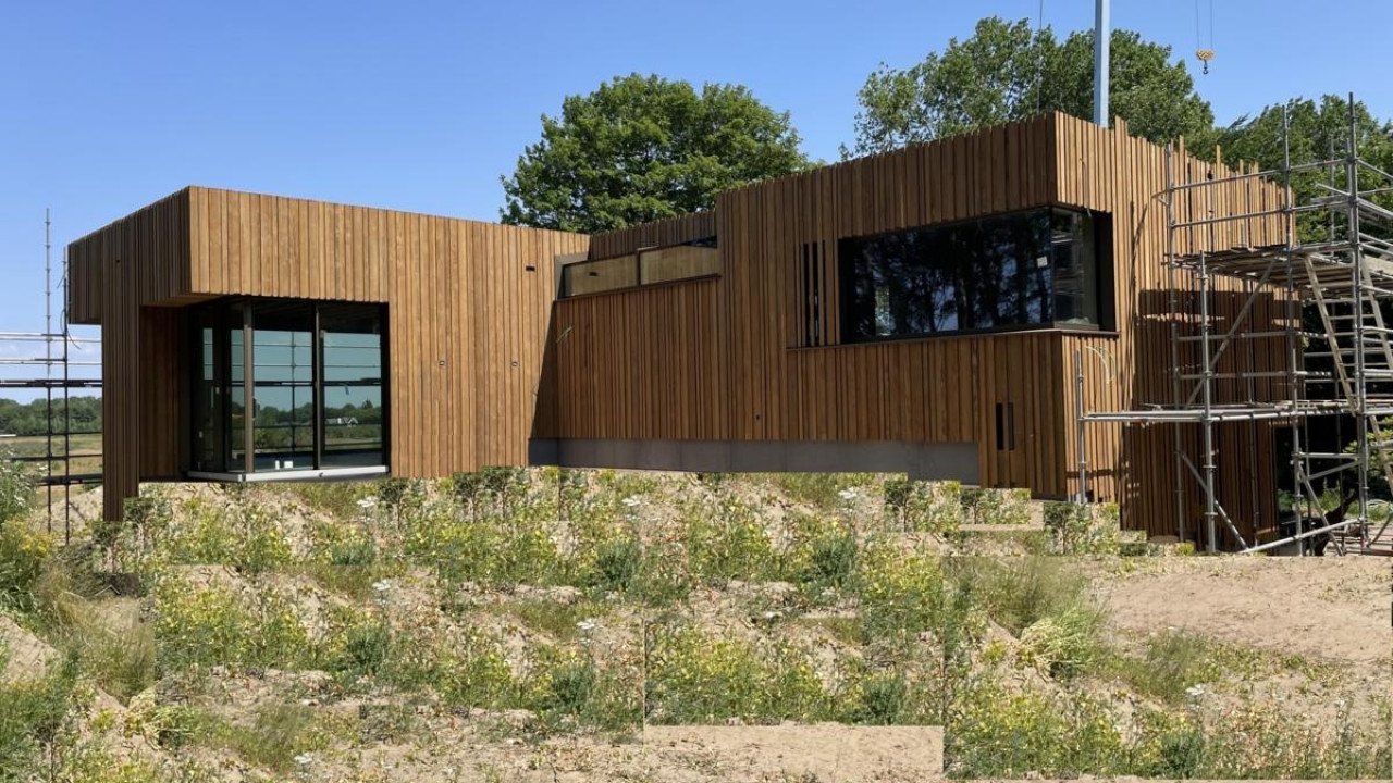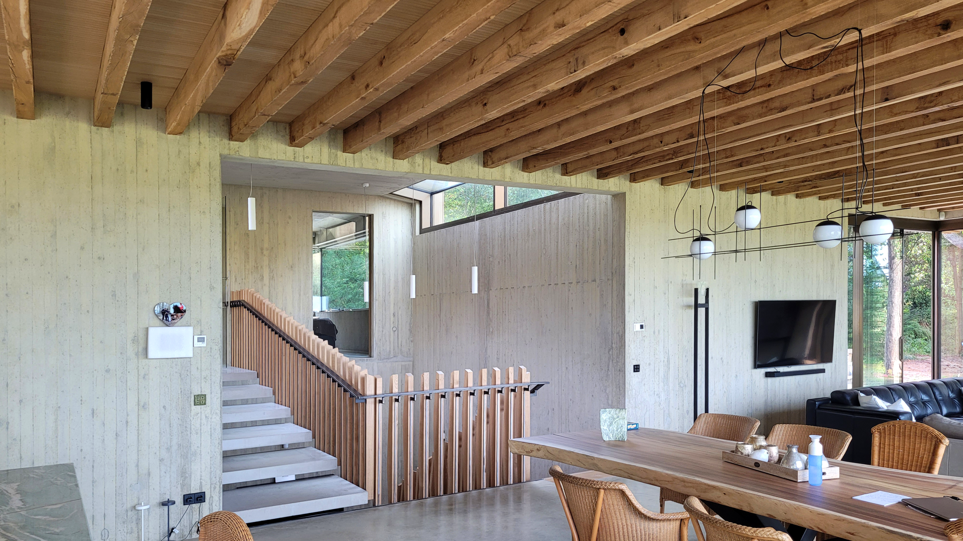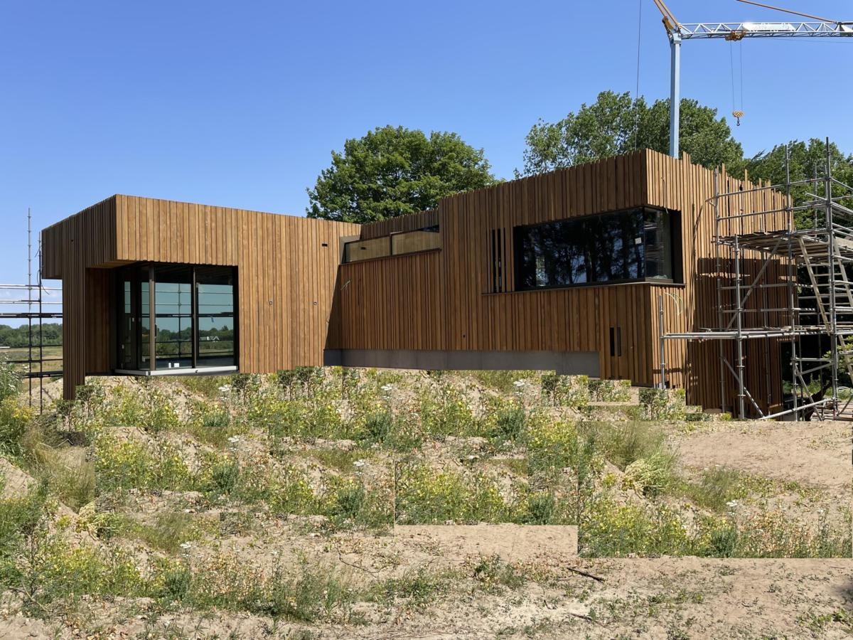 Deze ingetogen villa is deels ingegraven in de duinen en kijkt uit over een natuurgebied. De materialen, zoals inlands eiken, Fraké, beton en geanodiseerd aluminium tonen hun ware aard. De kozijnen met grote glasoppervlaktes, ook in het dak, verzorgen een mooie lichtval.