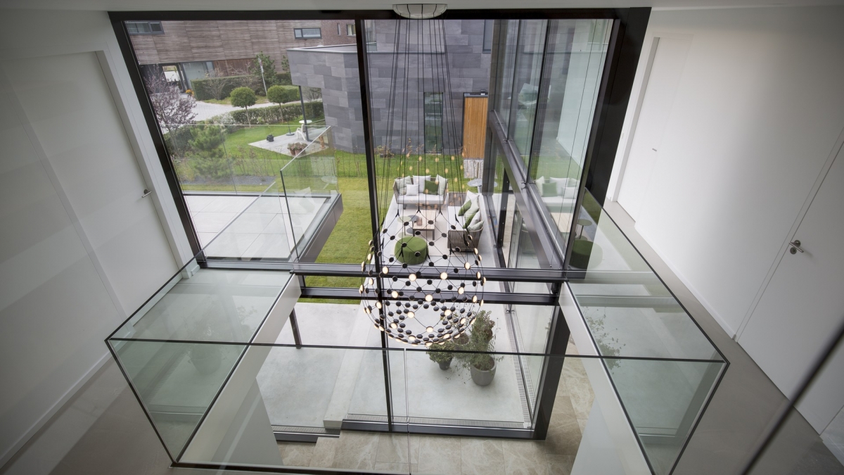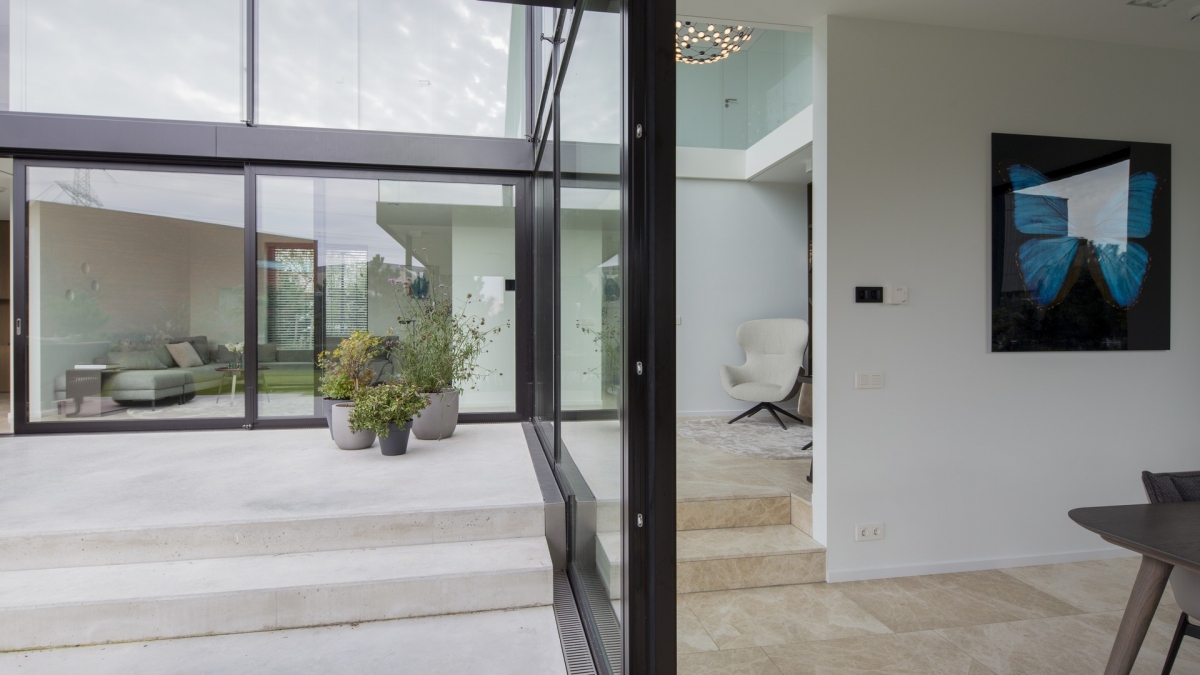 Hetzelfde principe is toegepast op het balkon en het dakterras. “Die samensmelting van binnen en buiten heb ik nog versterkt door het kleine niveauverschil op de begane grond van twee treden, van het interieur door te laten lopen in de tuin. Ook de glazen balustrade van de vide binnen loopt door in de balustrade van het balkon op de eerste verdieping. Zulke details vind ik erg belangrijk”.