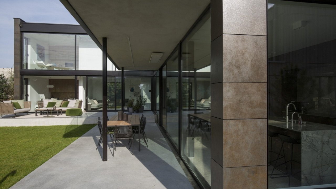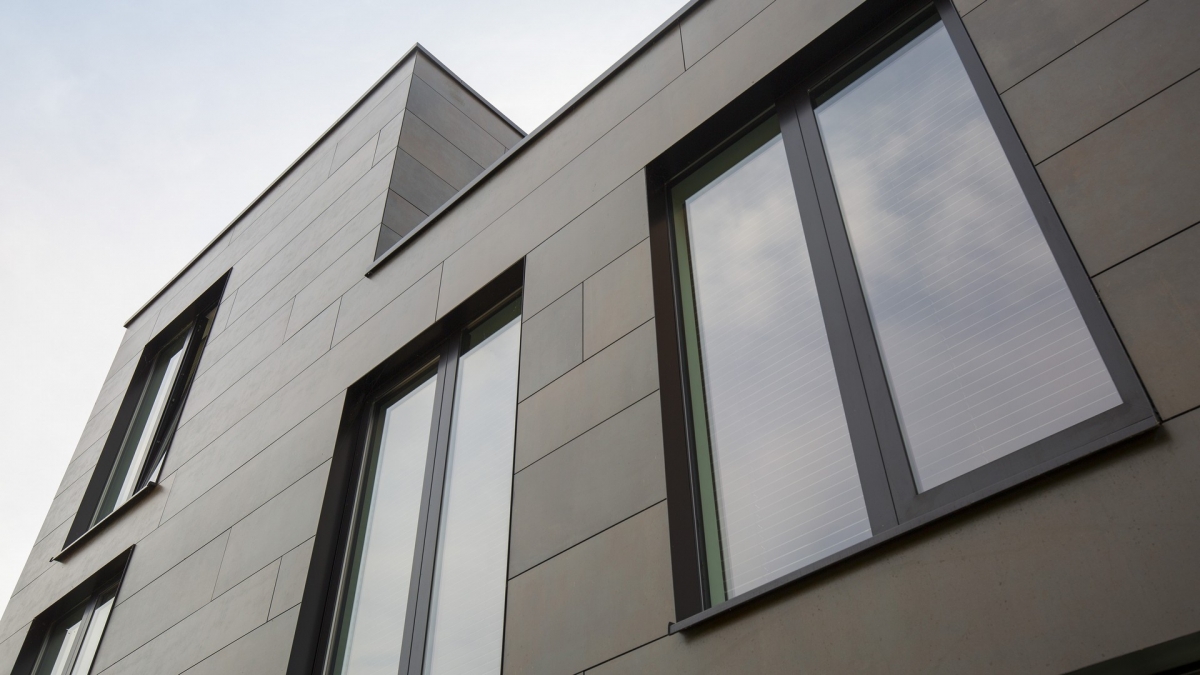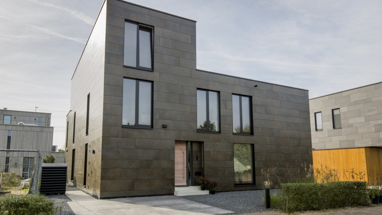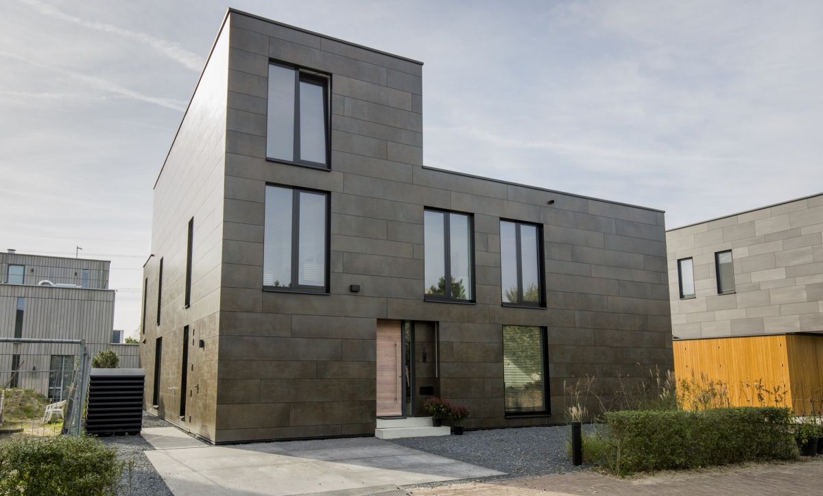 Die ideale indeling bestaat uit twee vleugels in een L-vorm, die de tuin omarmen. De gevels zijn open en transparant naar de tuin, en gesloten naar andere zijden. Aan de straatzijde heeft de woning een ingetogen karakter en is bekleed met grote keramische gevelplaten. In verband met de donkere kleur van de panelen – bruin met kleurnuances - is de gevel geventileerd, om al te grote opwarming en uitzetting in de zon te voorkomen.