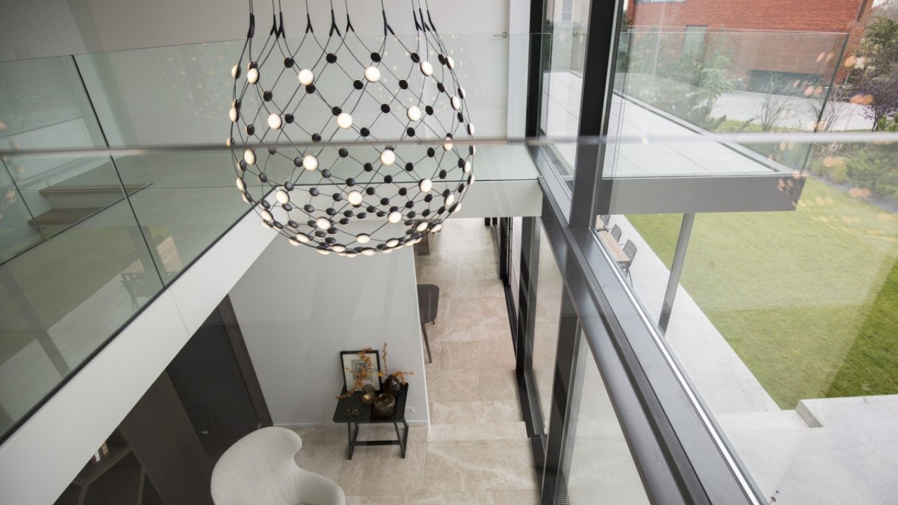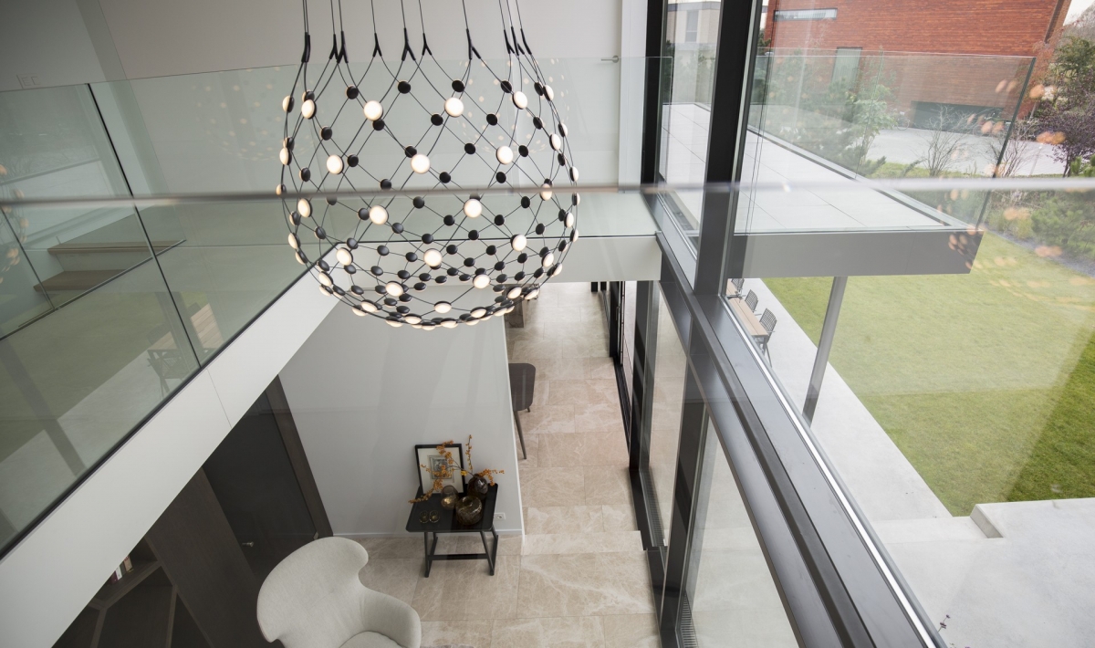 Ook op de verdieping vormt de vide het hart, met rondom een glazen balustrade en in het midden een moderne kroonluchter. Op deze verdieping zijn wel enkele ruimten met wanden gesloten. Naast een open speelkamer in de straatvleugel zijn twee kinderslaapkamers en een badkamer gesloten. In de andere vleugel grenst aan de ouderslaapkamer annex badkamer een groot balkon. “Dat balkon dient voornamelijk als beschutting voor het terras eronder, verder gebruiken we het niet.”