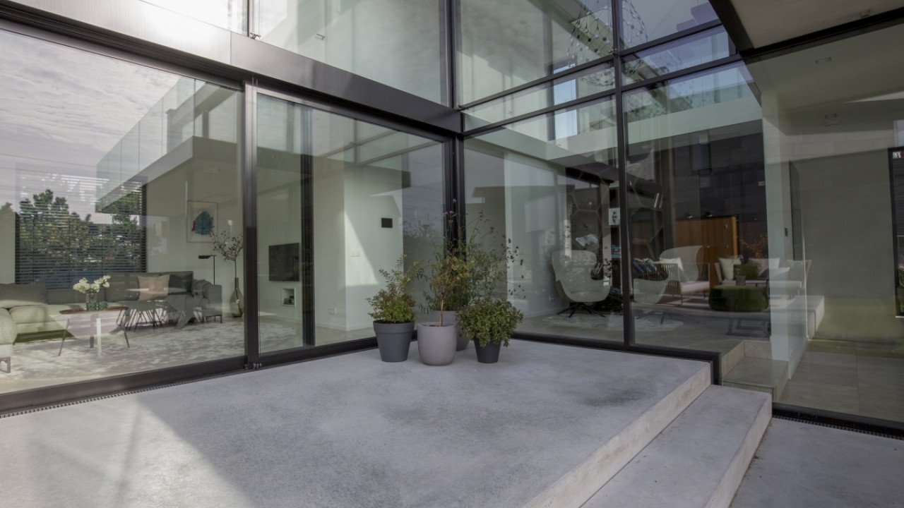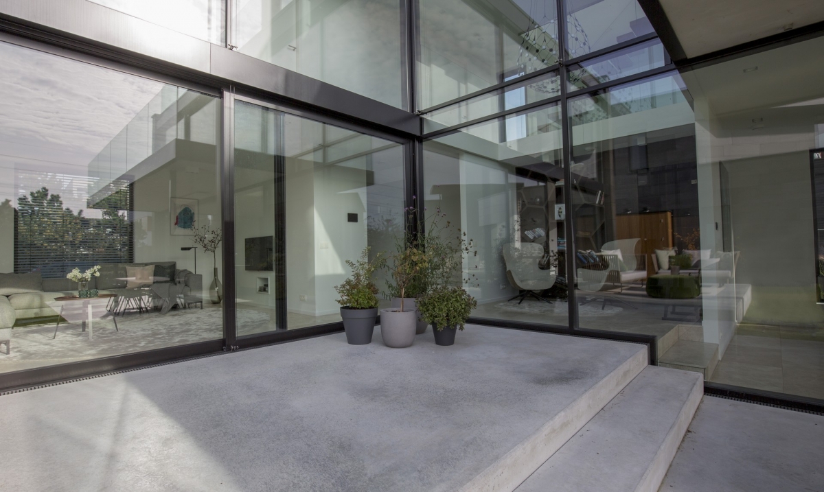 De tuin en de binnenruimte zijn door de glaspuien visueel verbonden. Wanneer de grote schuifpuien open staan, wordt de tuin echt een buitenkamer. De betonnen vloeren van het terras liggen op precies hetzelfde niveau als de natuurstenen vloeren binnen.