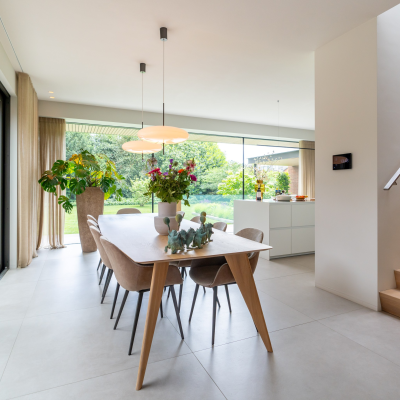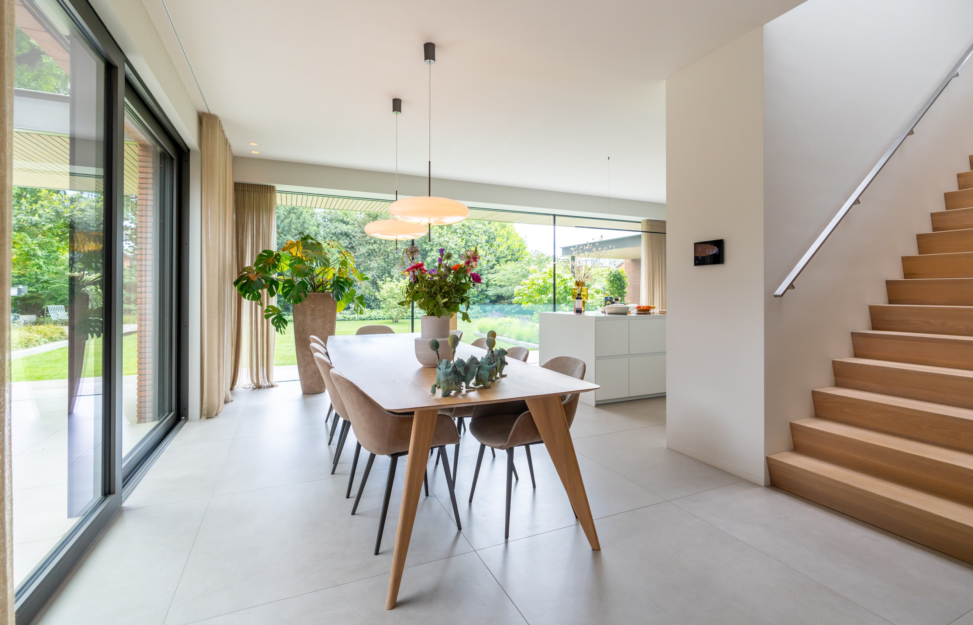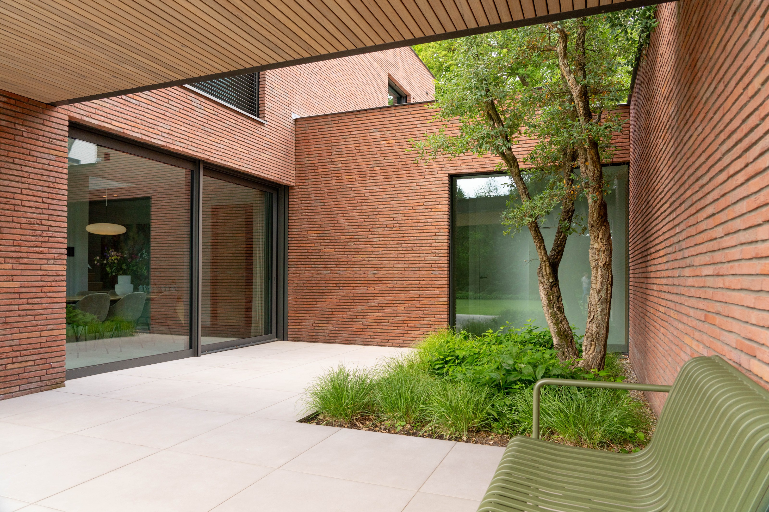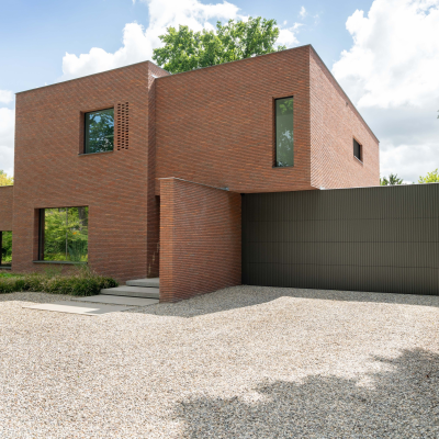 De Bredaseweg is geen blanco canvas. De laan gold als pleisterplek voor de Tilburgse notabelen. Anno 2025 wordt de straat gekenmerkt door grote jaren ’30-woningen. Soms verouderd, soms vervangen door schaalvergrotingen met weinig gevoel voor context. Villa BW zoekt bewust aansluiting bij die geschiedenis. Niet door stijlherhaling, maar door interpretatie. Bekkers verduidelijkt: “We namen het idee van de jaren ’30-woning als uitgangspunt: een rechthoekig volume dat verrijkt wordt met erkers, insnijdingen en aanbouwen. Dat principe vertaalden we naar een eigentijdse compositie van orthogonale volumes. Het resultaat is een plastisch geheel van geschakelde vertrekken, waarin elk volume een eigen functie heeft. Door het gebruik van donkerrood metselwerk sluit de villa aan bij de oorspronkelijke bebouwing, terwijl het ontbreken van een kap en de abstracte gevelcompositie een hedendaagse draai geven.”