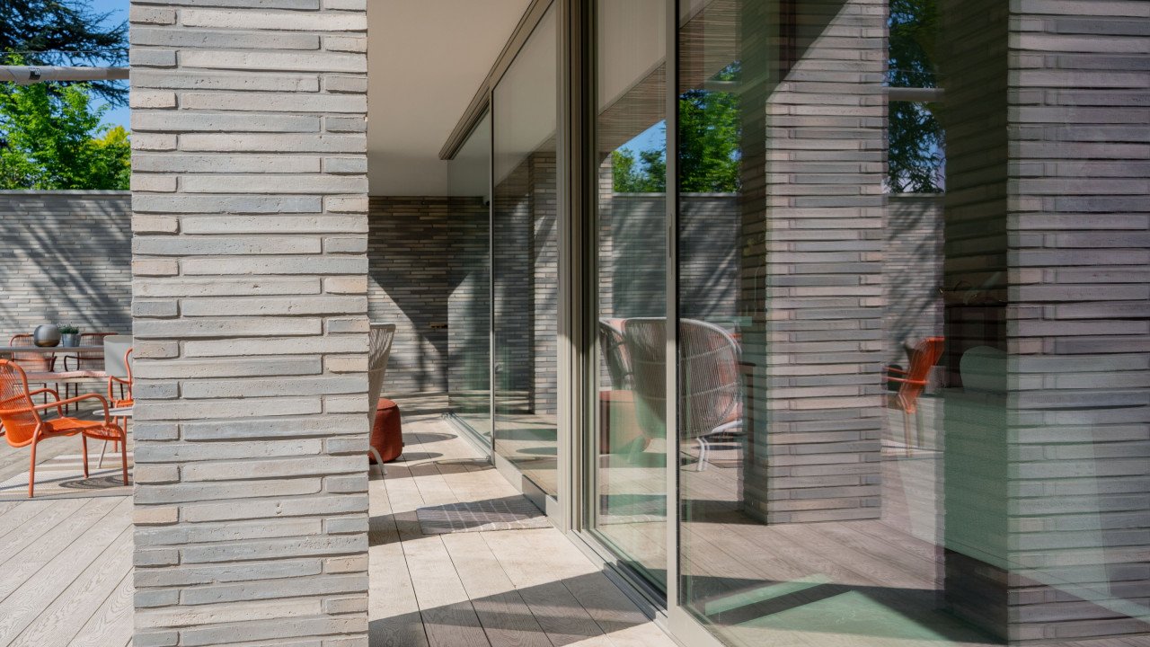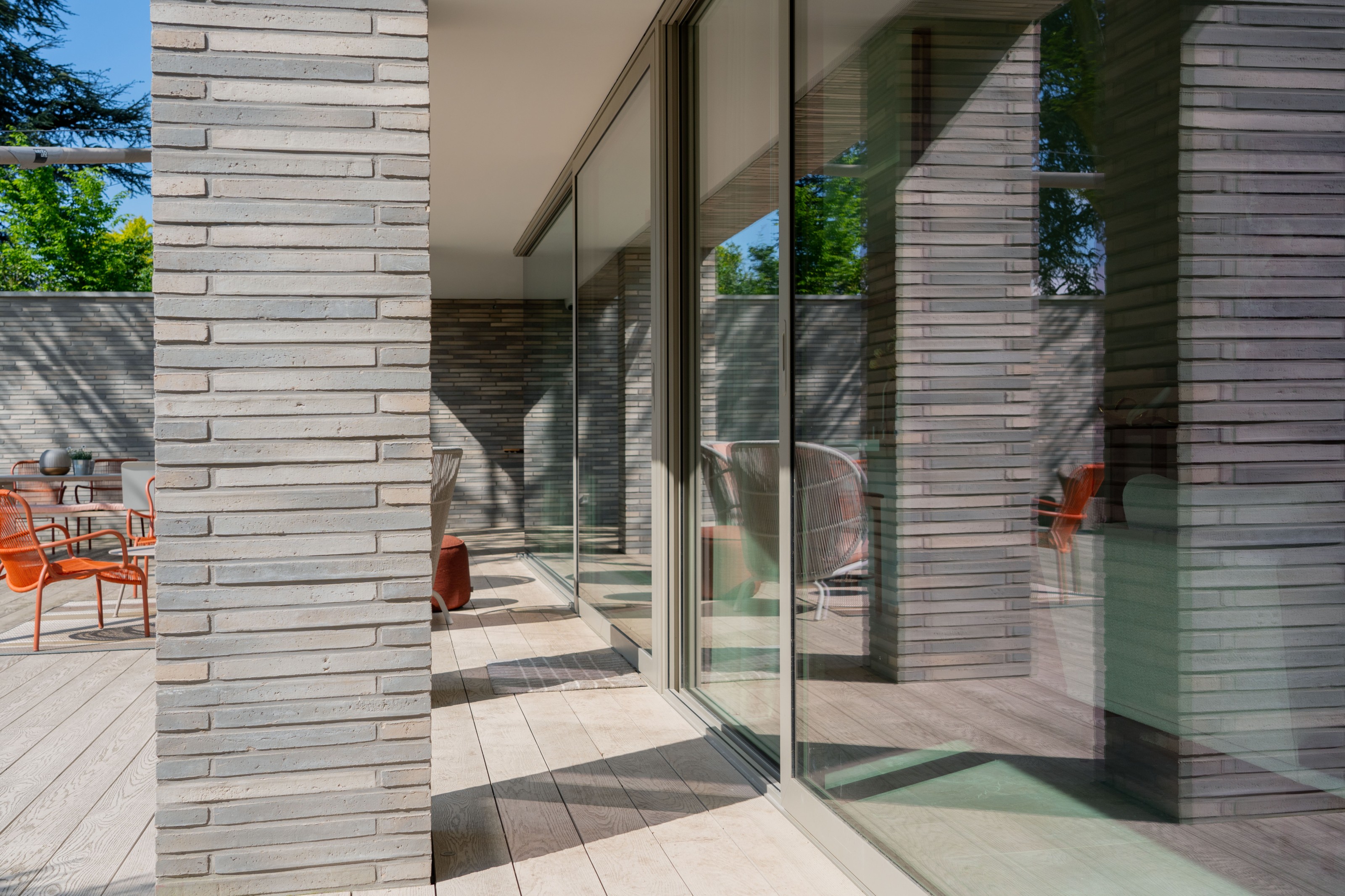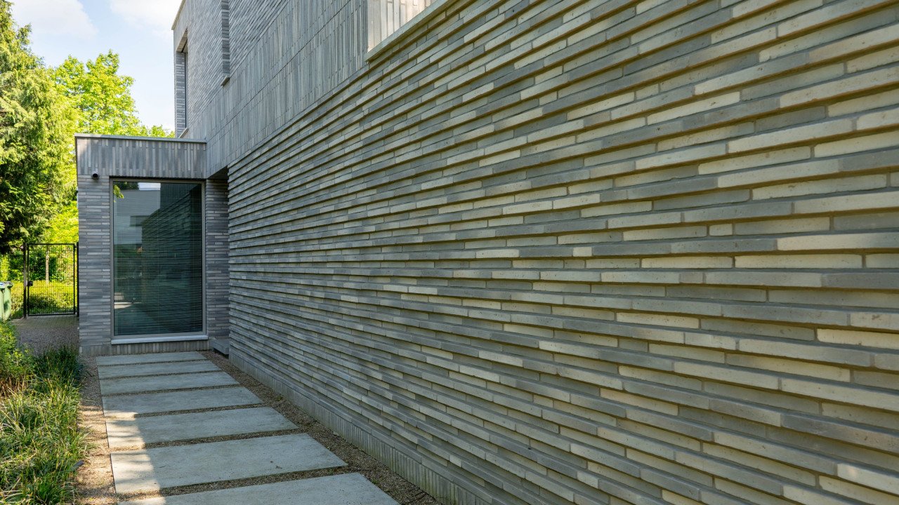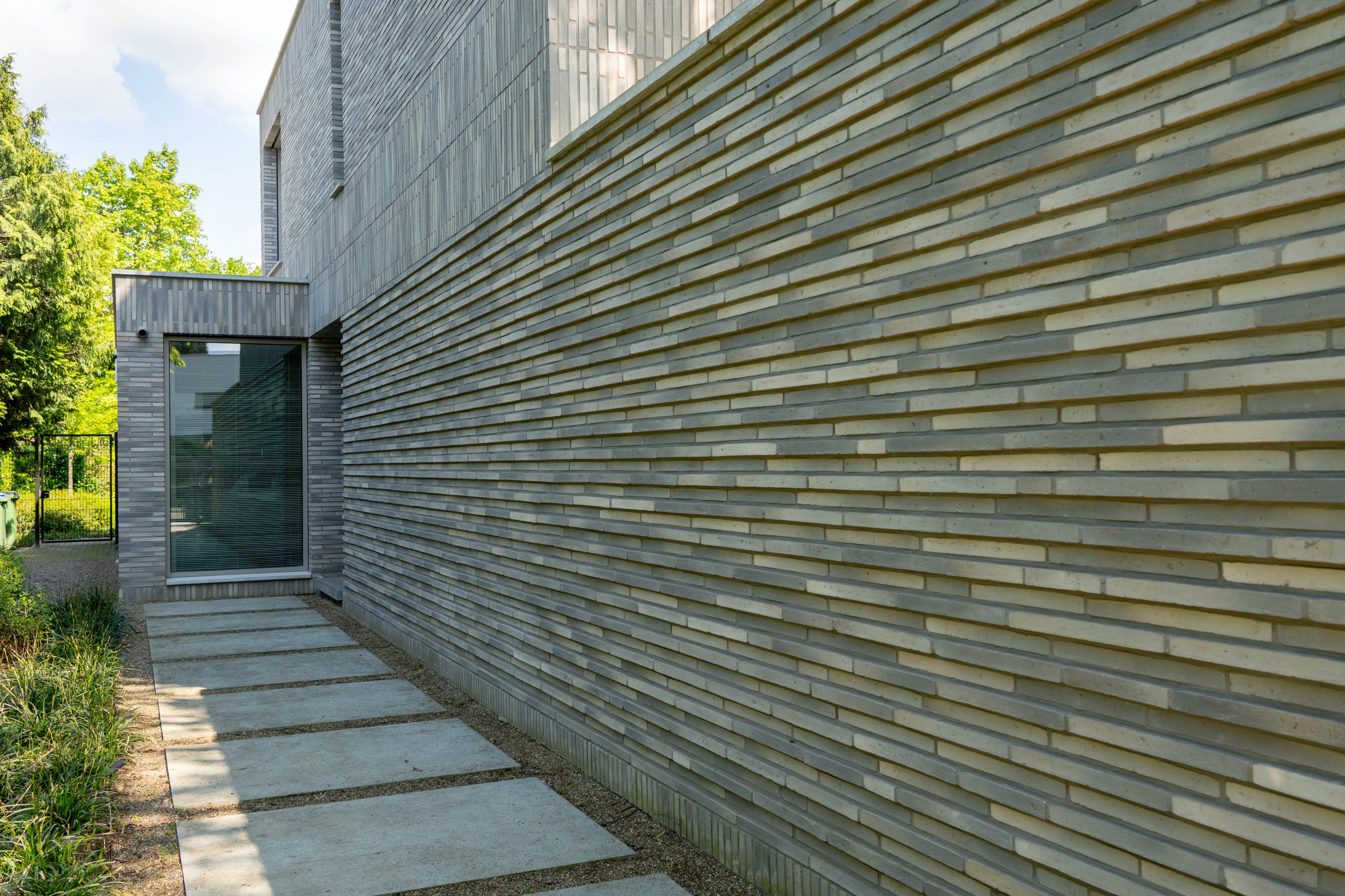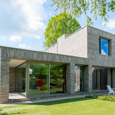 De villawijk schurkt tegen het Bredase Mastbos aan. Een locatie waar abstracte witte villa’s met houtaccenten het straatbeeld domineren. Voor Bekkers was de historische context van de omgeving een belangrijk uitgangspunt bij het ontwerp. “Je ziet dat in de jaren zeventig gebouwde villa’s hier steeds vaker omgeturnd zijn tot witte blokkendozen. Ik wilde iets maken dat afwijkt van die eenheidsworst. Het ontwerp grijpt terug naar de oorspronkelijke jaren 70-bouwstijl maar dan met een hedendaagse invulling. Het metselwerk vormde meteen ook de grootste uitdaging. Er is gespeeld met horizontale en verticale metselverbanden die precies moesten uitlijnen met prefab betonlateien. Als dit niet tot in de details klopt, sla je de plank volledig mis. Je moet dan wel met een aannemer en metselaars werken die voelen wat dit ontwerp nodig heeft. Wij hadden dat geluk.”