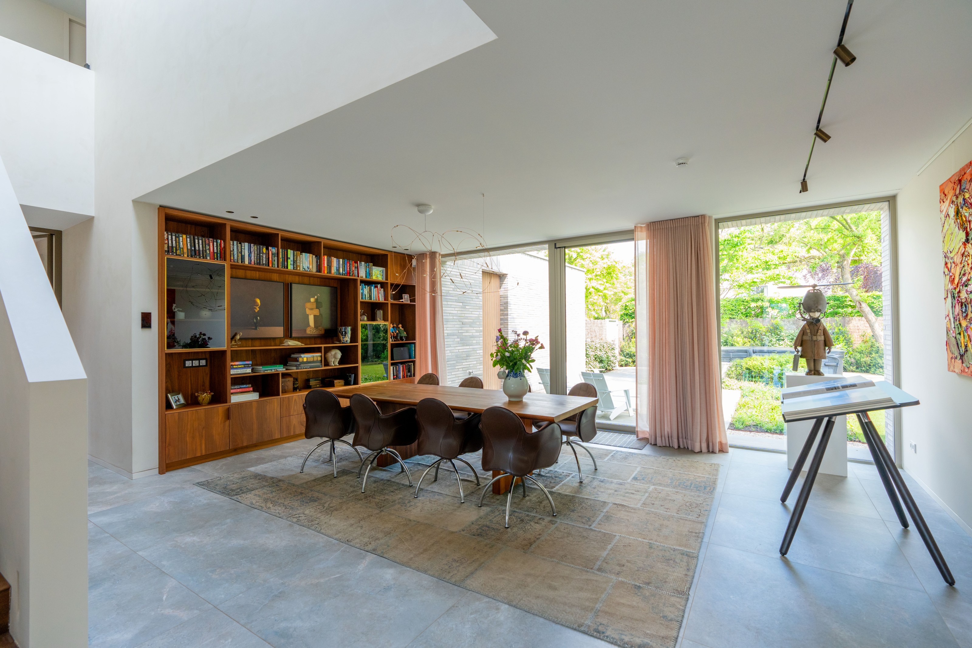 We creëerden een compact volume door de leefruimtes in een kruismotief te ontwerpen. De glasgevel aan de voorzijde ligt verdiept waardoor er een mooie overgang tussen binnen en buiten ontstaat.