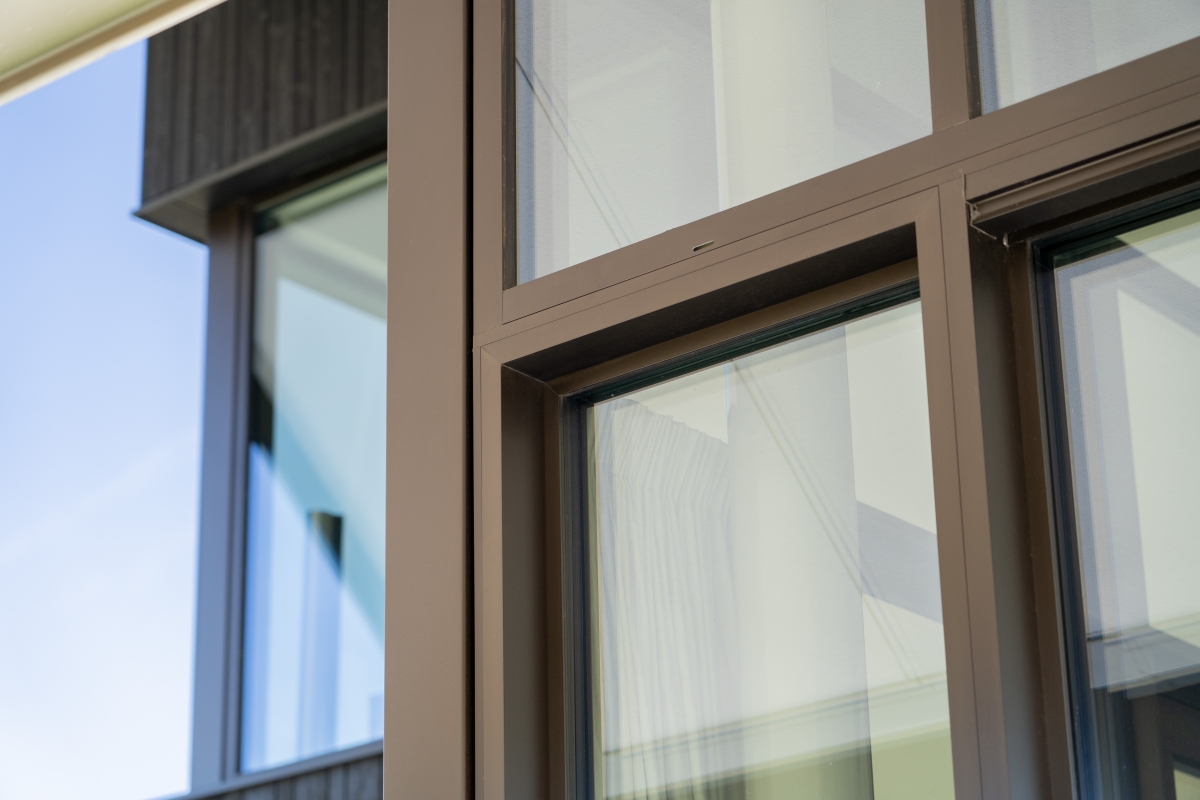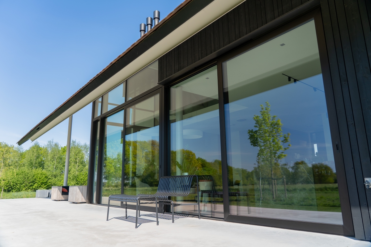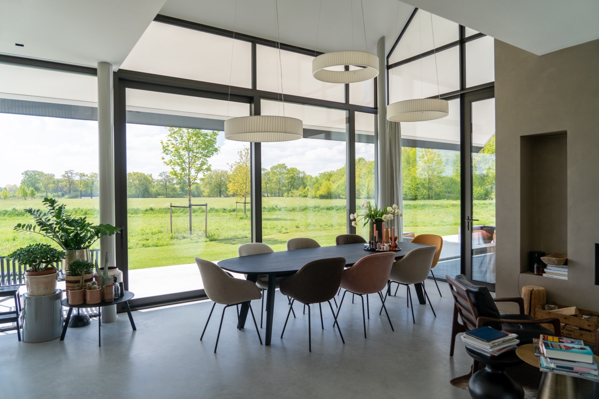 Op de hoek van het huis werd de glazen wand 6 meter hoog. Er werd een drievoudige haard gemaakt in de hoek van de wand. Hilberink legt uit: “Het is prettig dat de opdrachtgever ook een esthetische agenda heeft. De bewoners wilden niet dat er verspreid over het dak verschillende rookafvoeren zichtbaar zouden zijn. Daarom hebben we drie haarden rondom één centraal punt geconcentreerd. Een buitenhaard op de kopse kant, een haard in de woonkamer en een kachel in de zithoek.” HILBERINKBOSCH Architecten beschouwt het als een voorrecht om een huis te kunnen ontwerpen op een dergelijke locatie. Toch waren er ook uitdagingen. Het oppervlak van het huis bijvoorbeeld. “Het is een ruim huis. Toch wilden we niet dat de bewoners zouden verdwalen in hun woning. Door de grote raampartijen over de breedte en hoge kozijnen aan de kopse kant voelt het heel ruimtelijk. Terwijl het vloeroppervlak niet overdreven groot is. Dankzij de slanke profielen van Reynaers Aluminium ervaar je de omgeving optimaal. Zo heb je bijvoorbeeld vrij zicht op het Brabants provinciehuis. Deze kozijnen werden geplaatst door Aluminiumbouw d’n Boeij.”