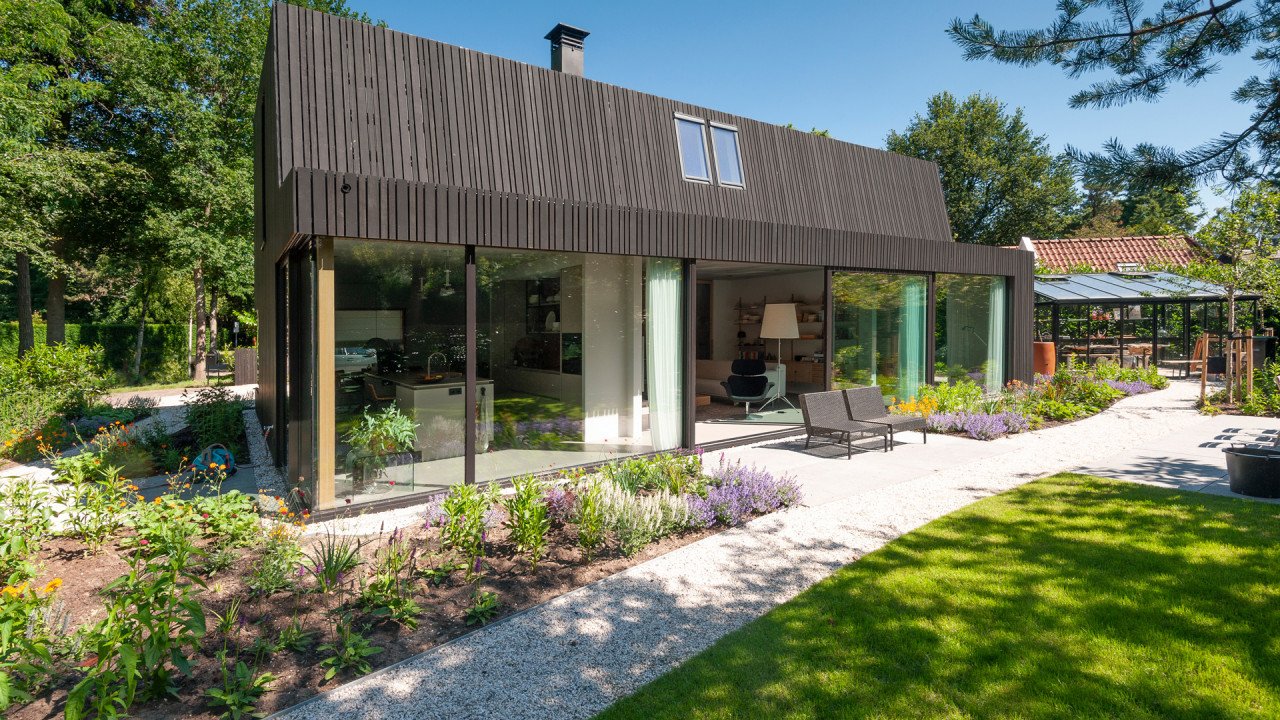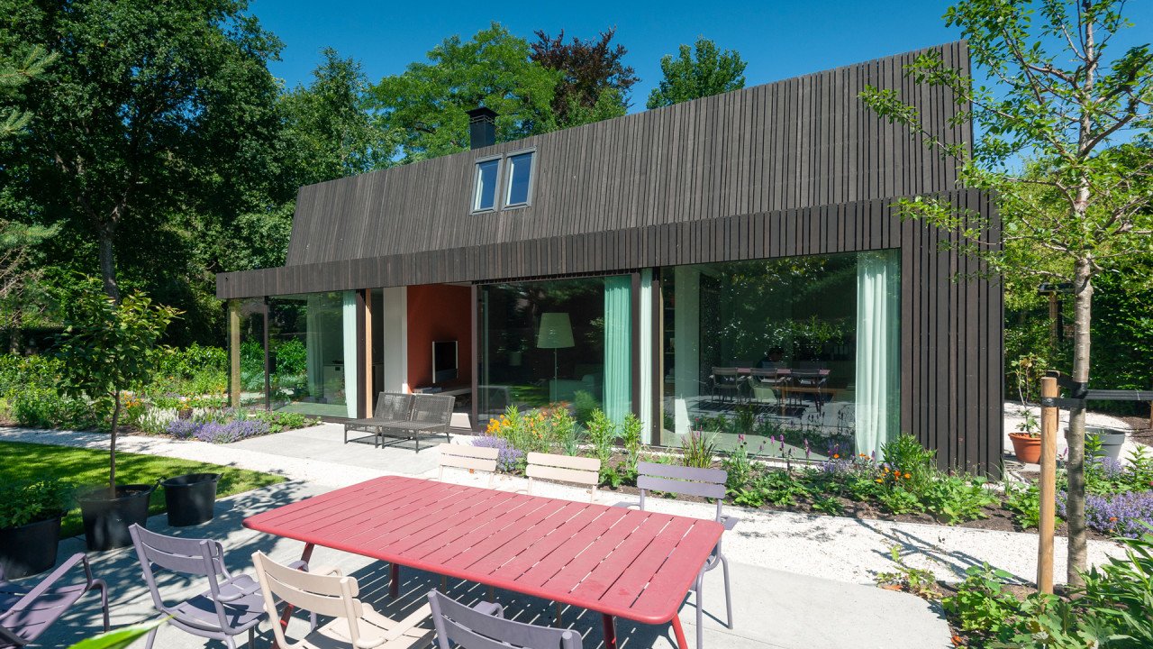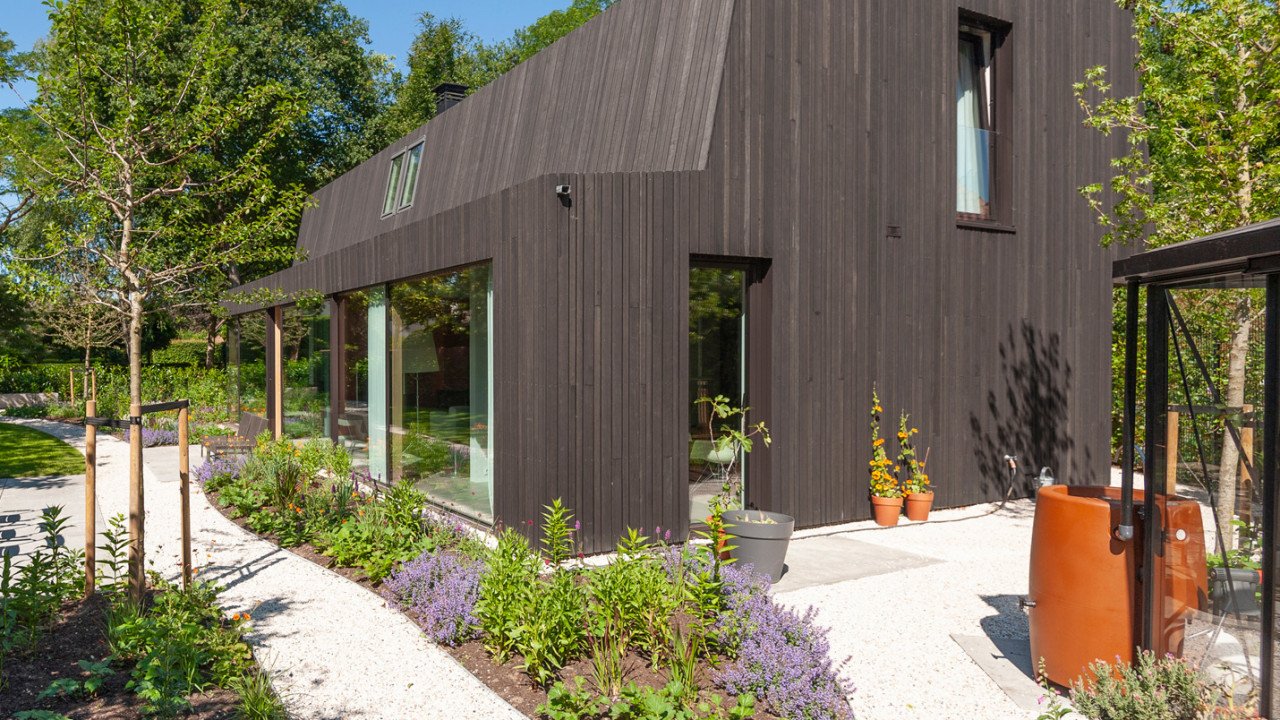 Het huis voorziet met 30 zonnepanelen en een bodemwarmtepomp volledig in de eigen energiebehoefte.