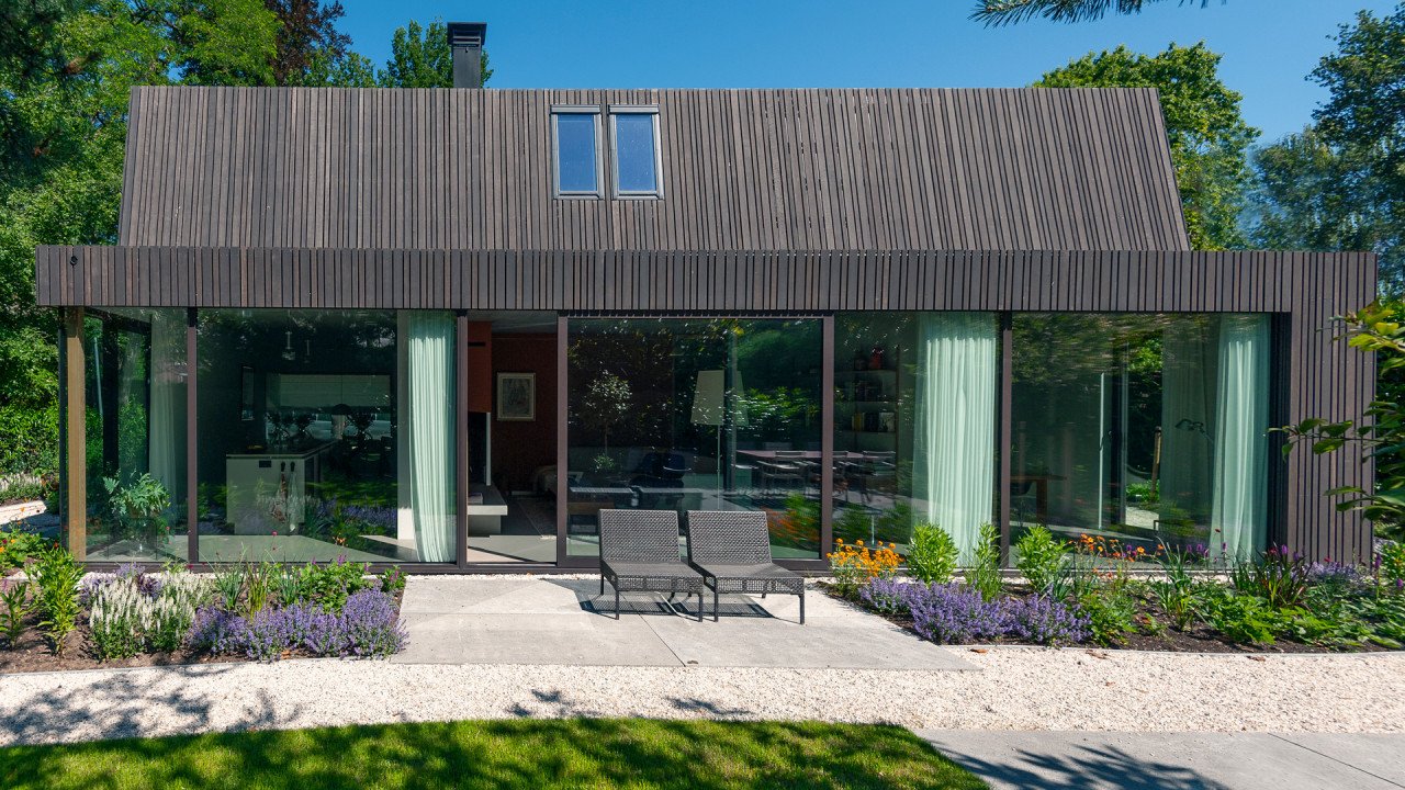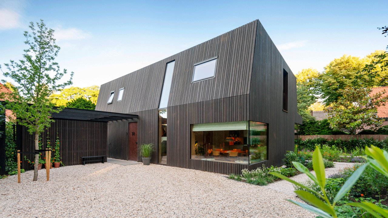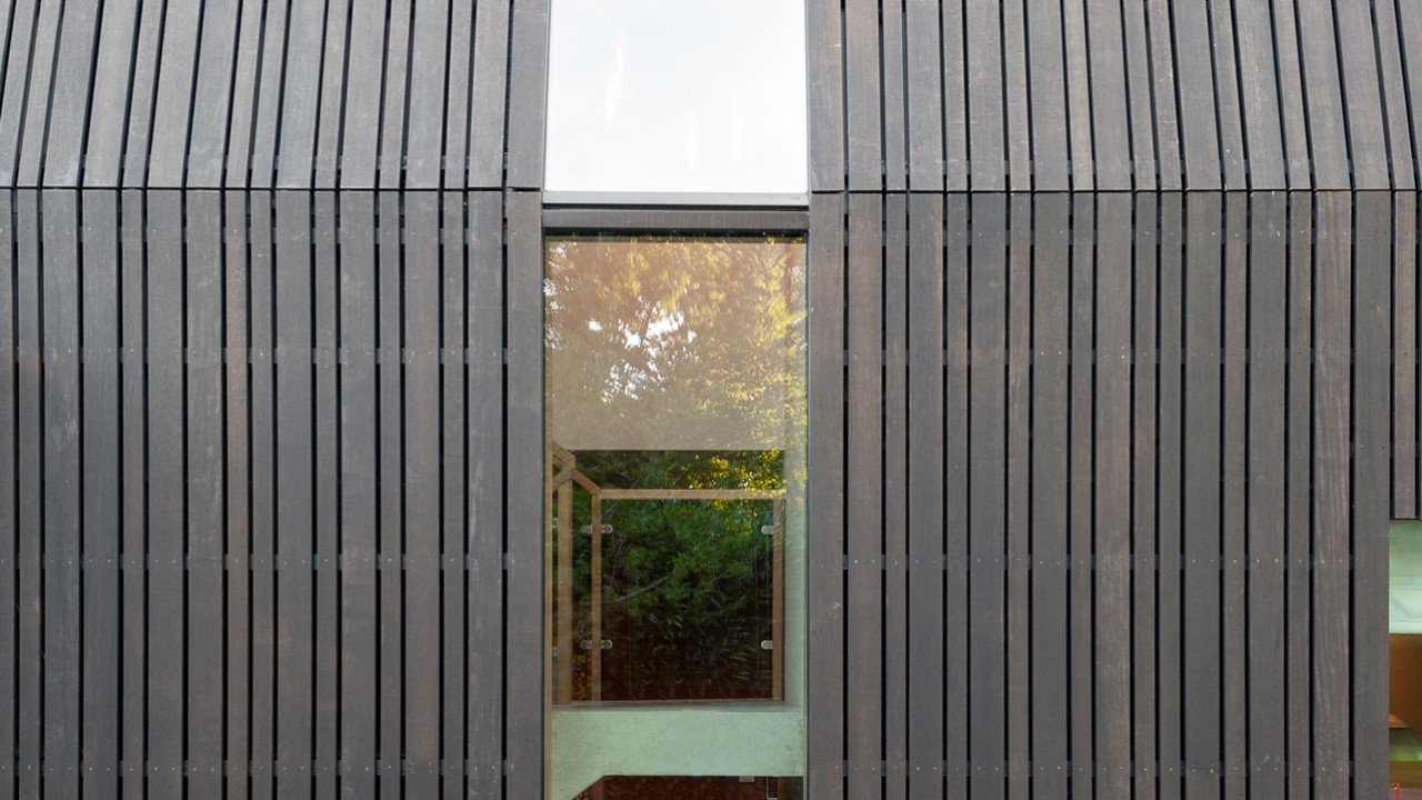 Gevel en dak zijn afgewerkt met zwart geolied hout. De alzijdige afwerking creëert een monolithisch volume. Glasopeningen zijn zuivere uitsnedes, waarbij de kozijnen zo veel mogelijk uit het zicht zijn gedetailleerd. De donkere kleur maakt dat de woning zich bescheiden opstelt en meedoet in de schaduw van de bomen. De houten latten zijn in twee verschillende breedtes, schijnbaar willekeurig aangebracht en met brede schaduwvoegen.