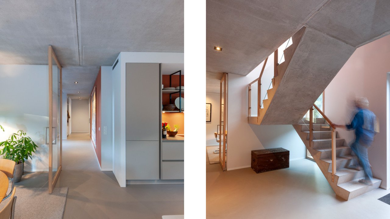 De leefruimte is niet één grote loft, maar een aaneenschakeling van verschillende verblijfsruimten die langs de grote aaneengesloten pui met elkaar verbonden worden. Aan de noordkant van het huis worden de ruimtes ook via de entreehal met elkaar verbonden. Je kunt dus oneindig rondjes lopen, wat een heel fijn gevoel van ruimte geeft. De centrale hal is ruim en dubbelhoog. Een stevige betonnen trap leidt naar de verdieping, waarbij de hoogte nog eens benadrukt wordt door een lang, smal raam met een knik op goothoogte.