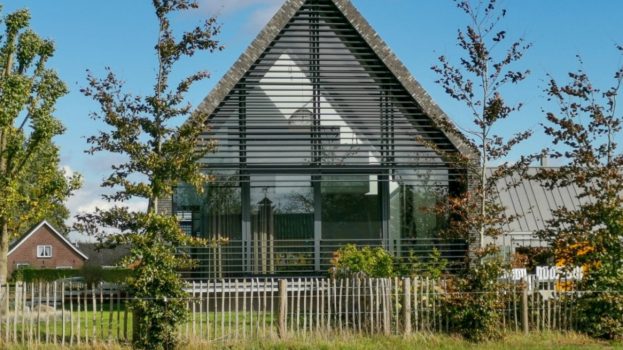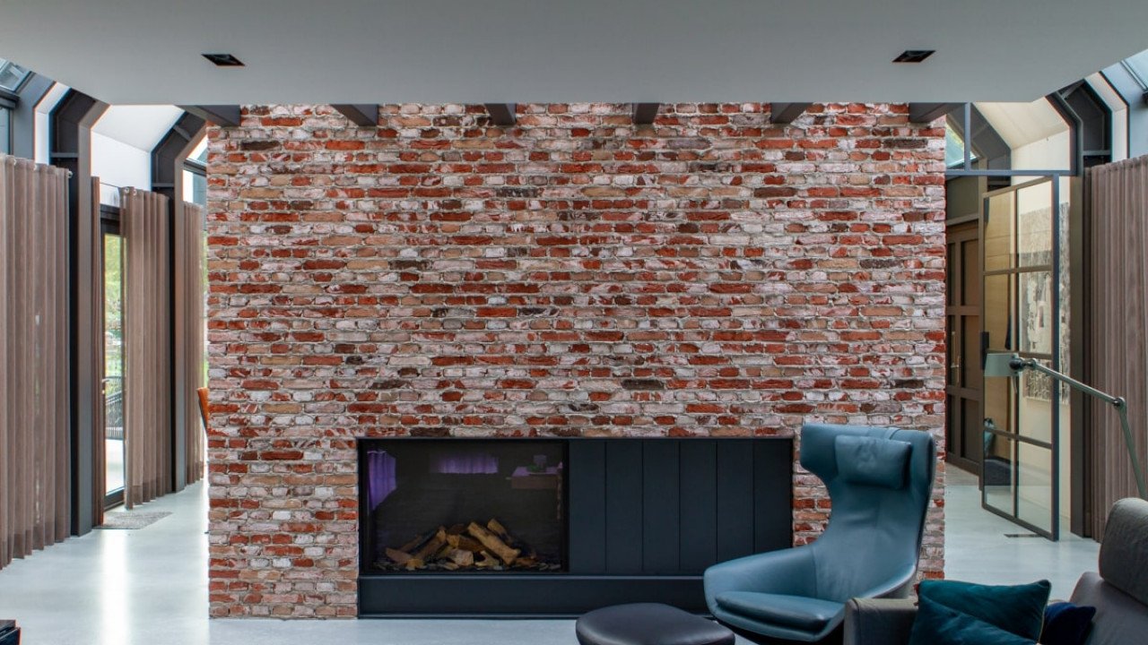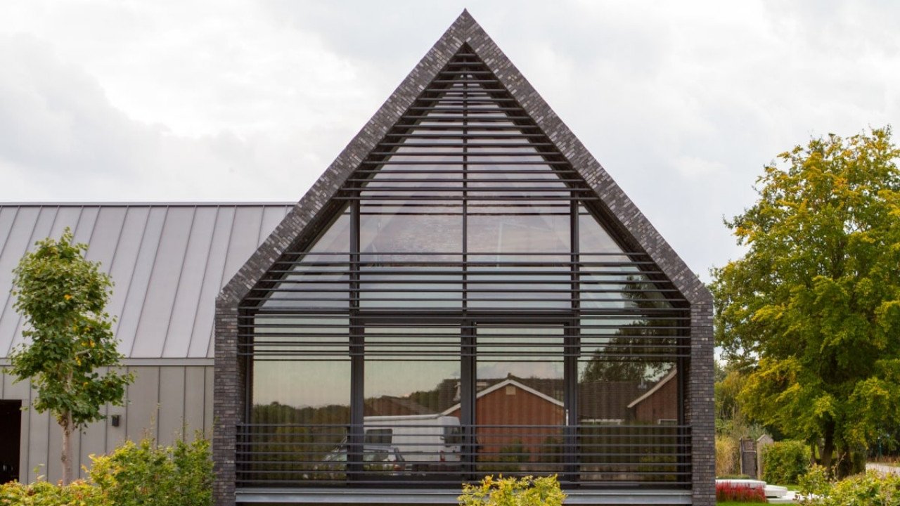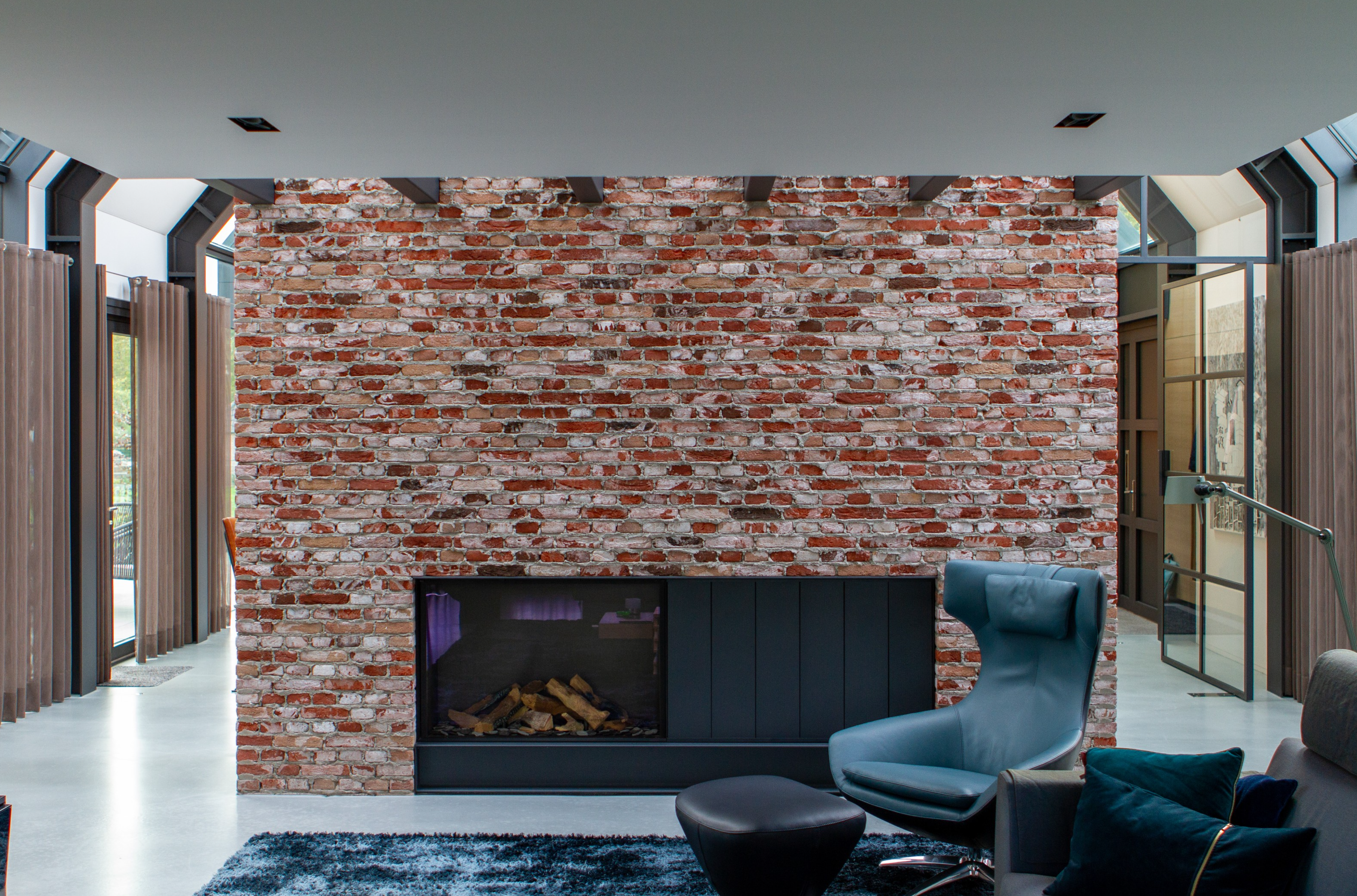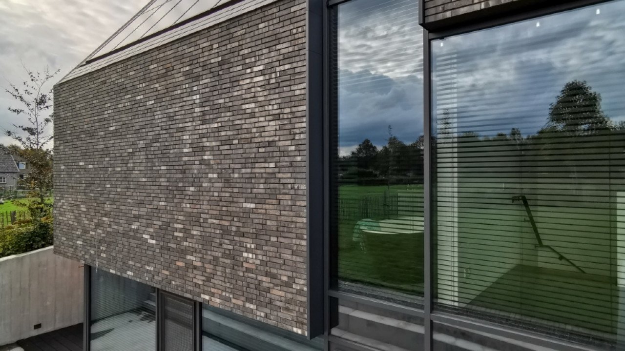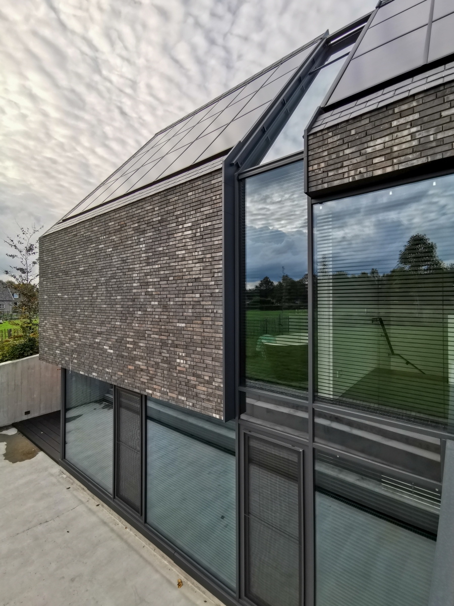Ook de achtergevel, met uitzicht op de weilanden, bestaat bijna geheel uit glas; de ranke aluminium kozijnen versterken het gevoel van transparantie. Dankzij een lichtgewicht schuifpui kunnen binnen en buiten in een handomdraai worden samengevoegd. De beganegrondvloer is ongeveer een meter omhoog gelift, waardoor het souterrain hoog genoeg is voor drie slaapkamers, een badkamer, chill-ruimte en een fitnesszaal.” Bijkomend voordeel: het massieve gebouw lijkt te zweven, doordat ook de baksteengevel ongeveer een meter boven de grond is getild. De kinderslaapkamers zijn in het souterrain ondergebracht en eveneens voorzien van een aluminium schuifpui die uitkomt op een beschutte patio. De patio loopt met getrapte betonnen elementen op tot het maaiveld. “Het idee voor een tribune ontstond als een informele zitplek waar de kinderen kunnen hangen met hun vrienden.”