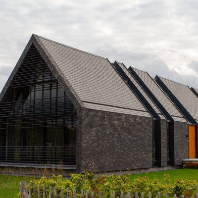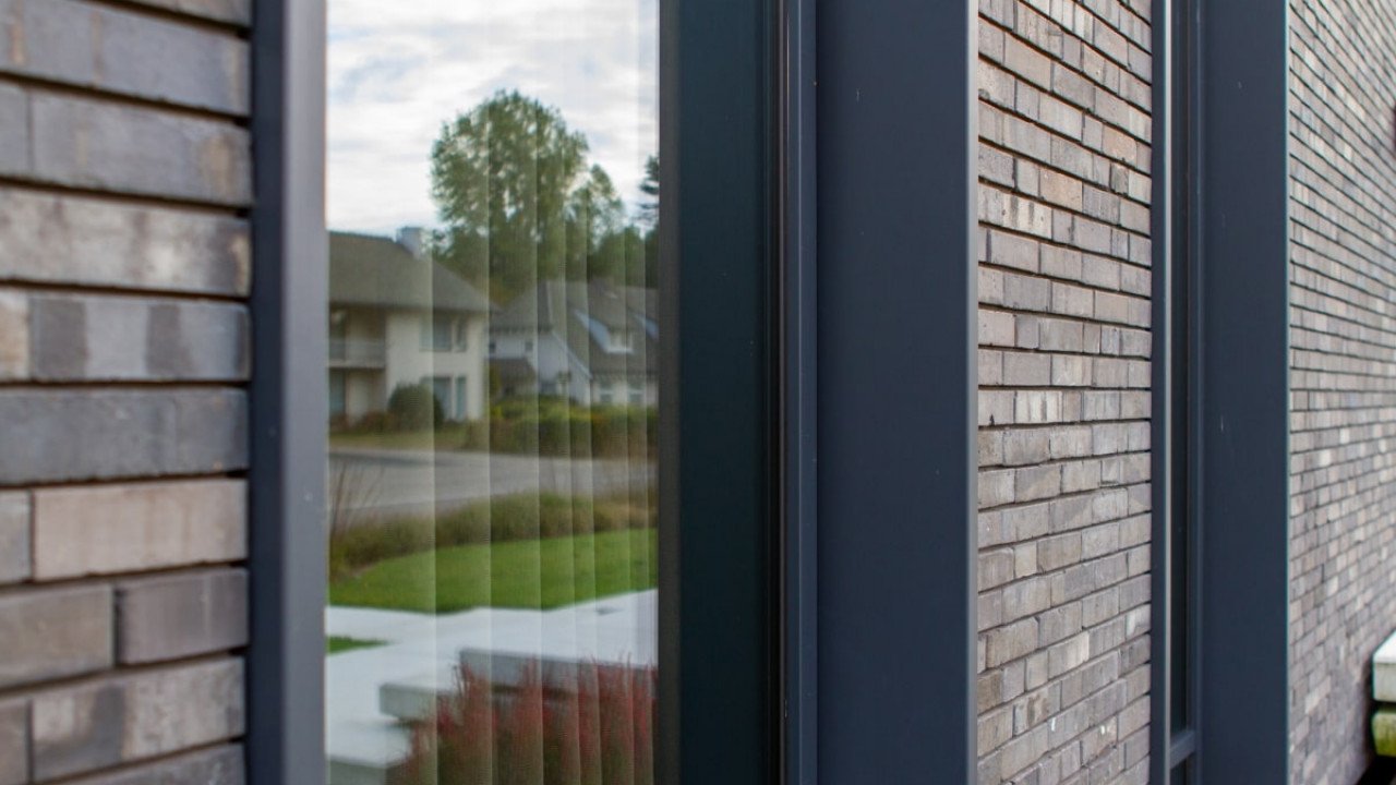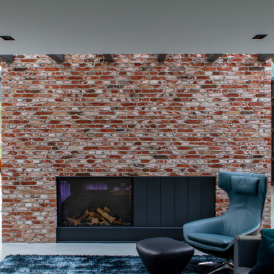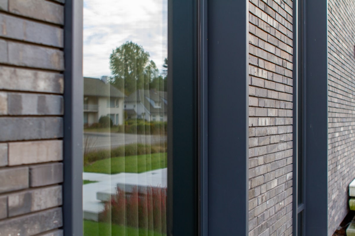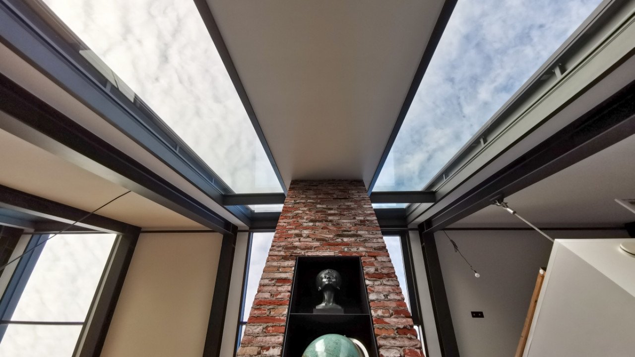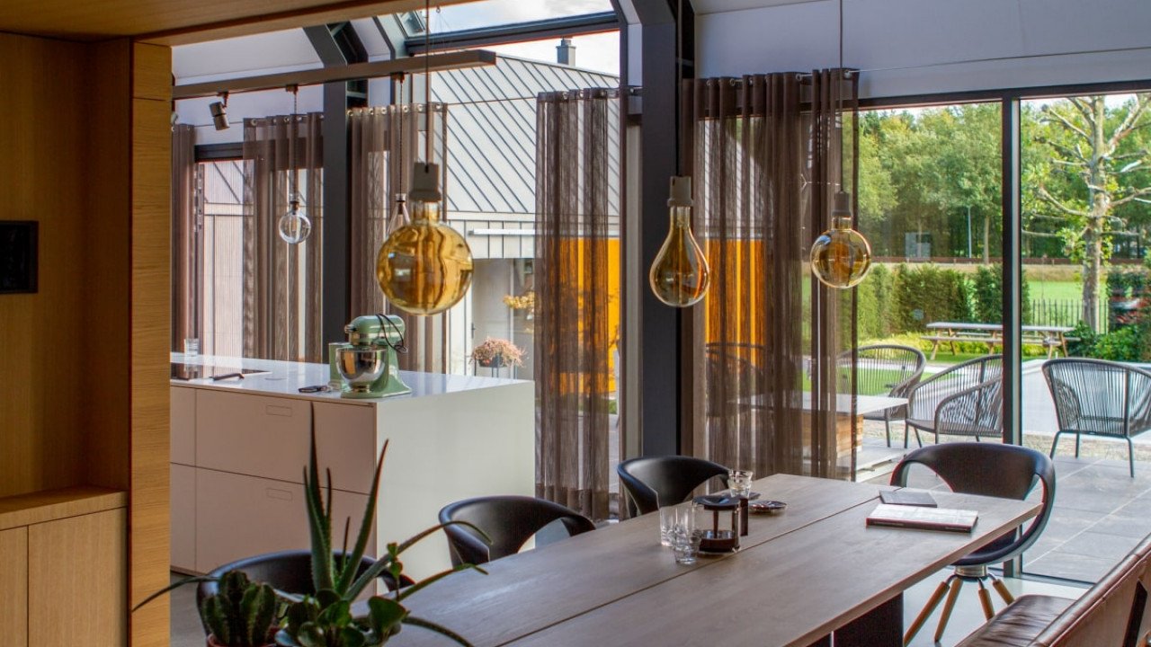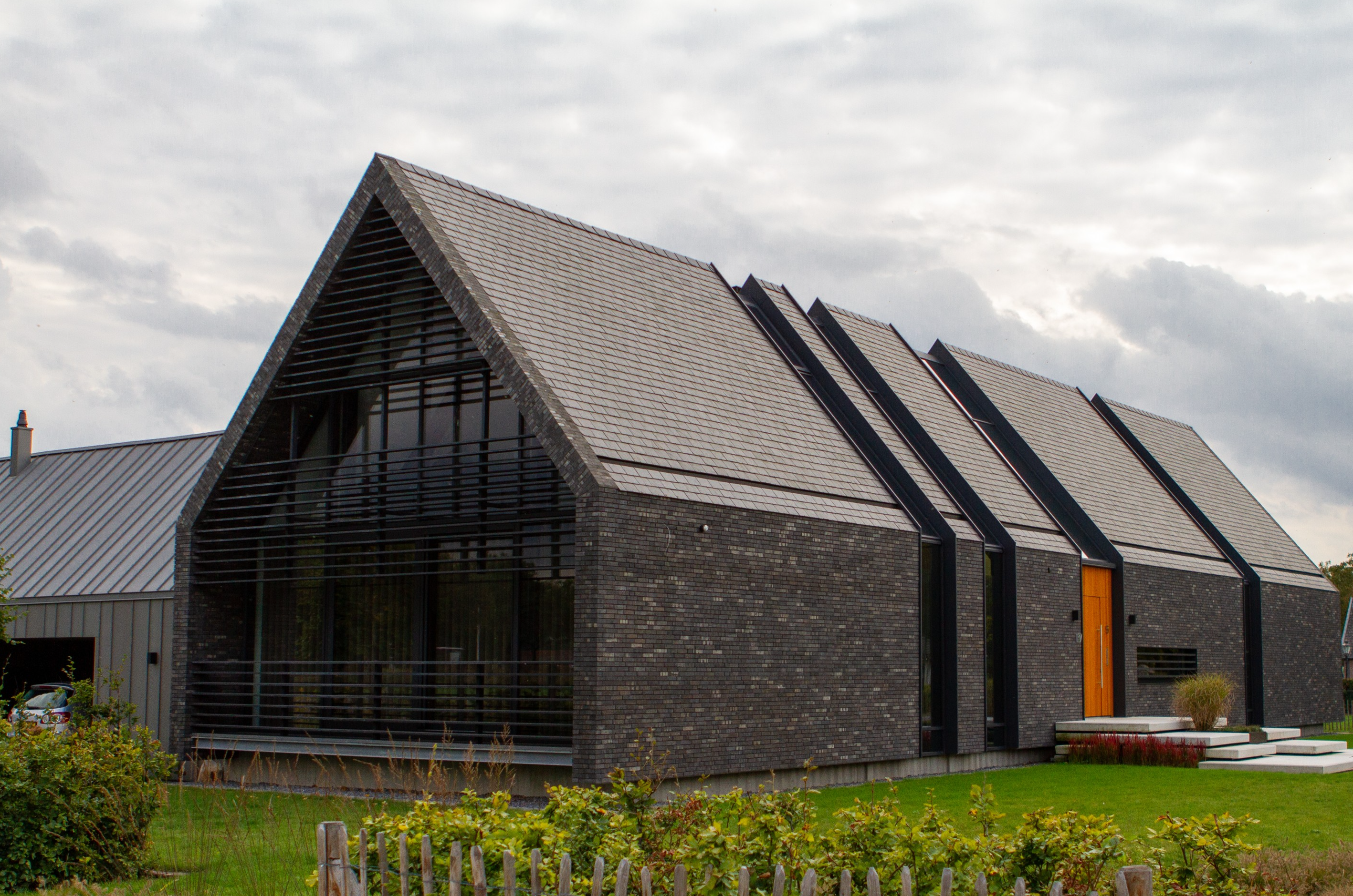 Ook de achtergevel, met uitzicht op de weilanden, bestaat bijna geheel uit glas; de ranke aluminium kozijnen versterken het gevoel van transparantie. Dankzij een lichtgewicht schuifpui kunnen binnen en buiten in een handomdraai worden samengevoegd. De beganegrondvloer is ongeveer een meter omhoog gelift, waardoor het souterrain hoog genoeg is voor drie slaapkamers, een badkamer, chill-ruimte en een fitnesszaal.” Bijkomend voordeel: het massieve gebouw lijkt te zweven, doordat ook de baksteengevel ongeveer een meter boven de grond is getild. De kinderslaapkamers zijn in het souterrain ondergebracht en eveneens voorzien van een aluminium schuifpui die uitkomt op een beschutte patio. De patio loopt met getrapte betonnen elementen op tot het maaiveld. “Het idee voor een tribune ontstond als een informele zitplek waar de kinderen kunnen hangen met hun vrienden.”