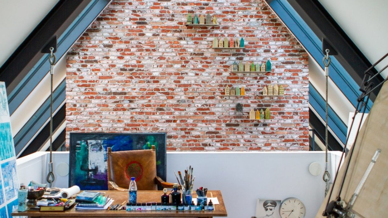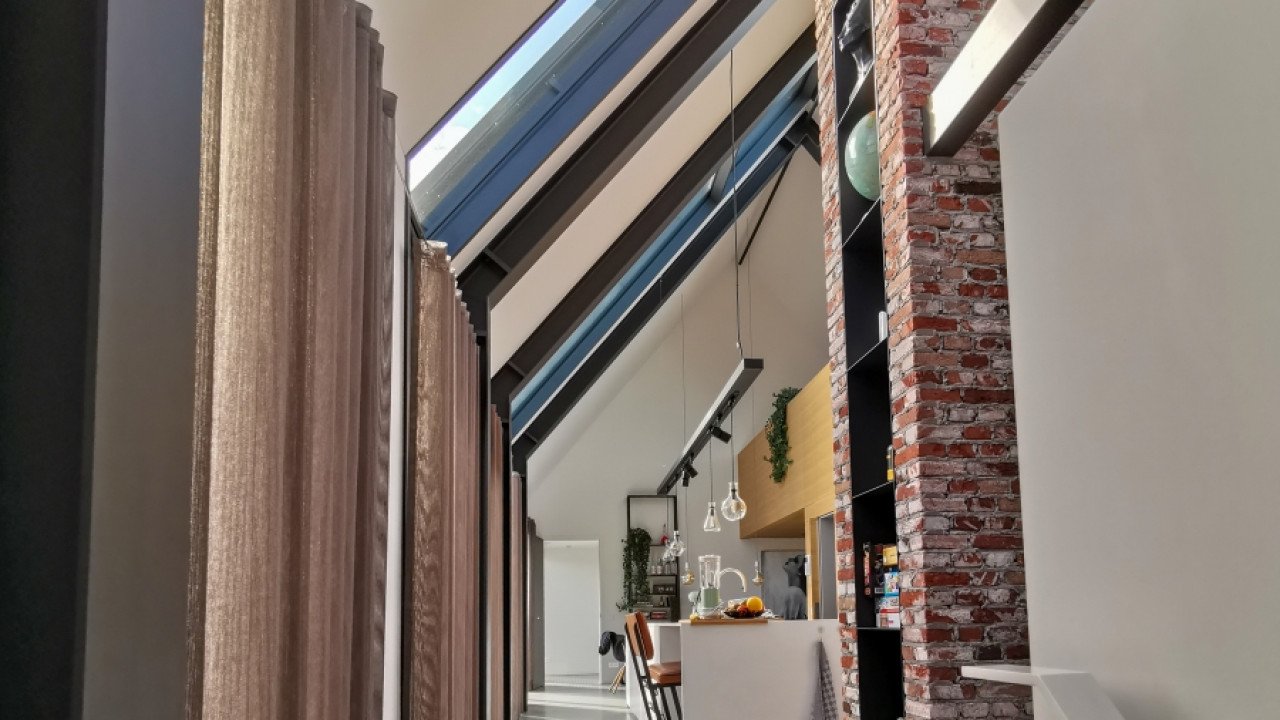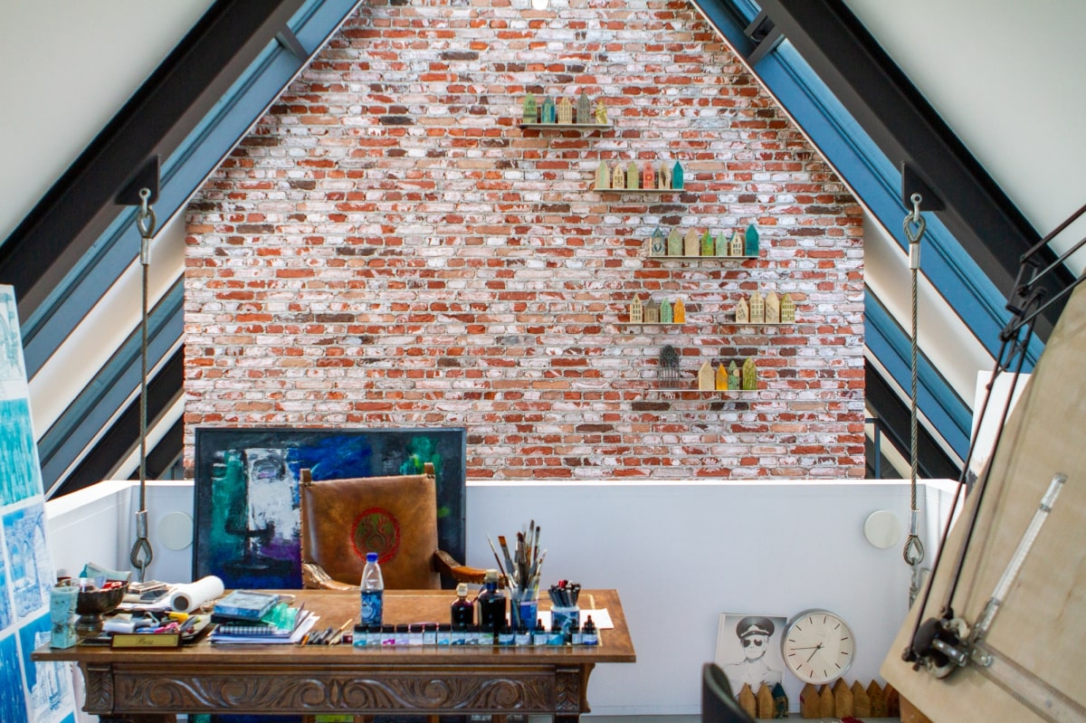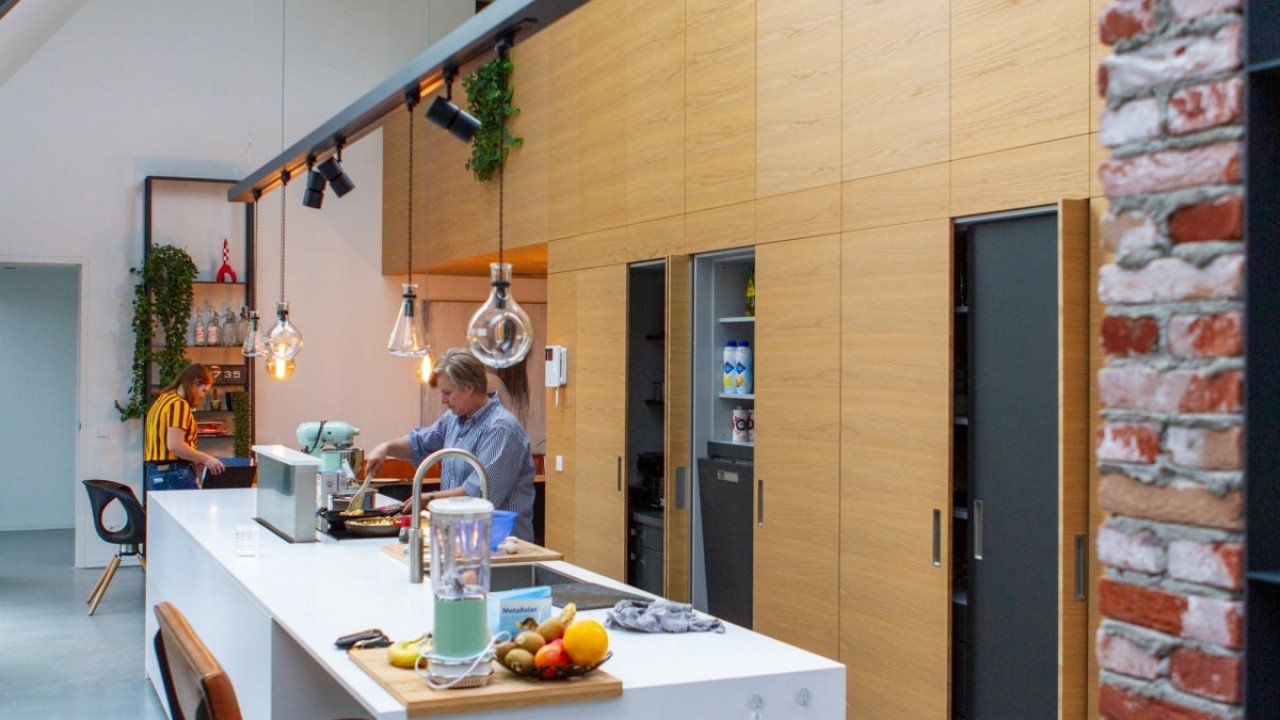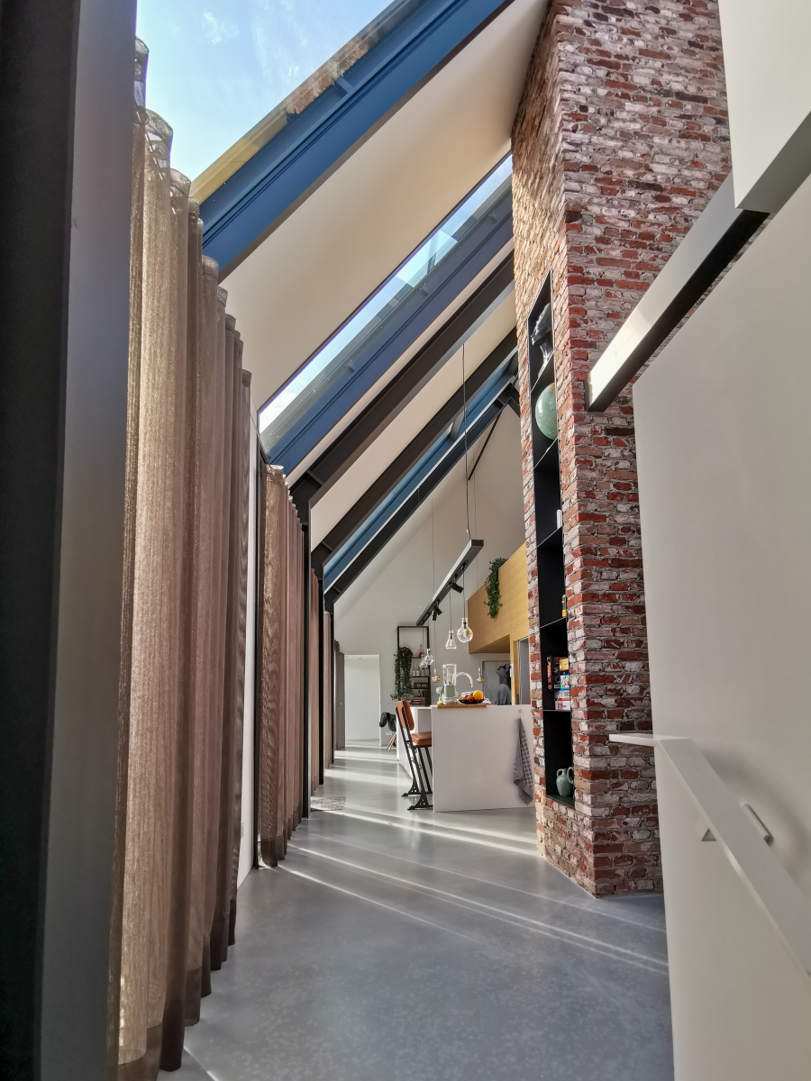 Wat in het interieur meteen opvalt, is de ruimtelijkheid. “De oorspronkelijke boerderijen waren ingevuld met slechts een derde wonen en twee derde stal en opslag. Nu wordt er uitsluitend in gewoond.” De overdaad aan ruimte is door de architect nog eens uitvergroot door een ontwerp zonder etage. In het midden van de open woonruimte is een trapelement gesitueerd waarin ook de open keuken is verwerkt. Deze trap gaat over in een loopbrug naar een open atelierruimte, die aan vier stalen kabels boven de living hangt, de werkplek van de mannelijke hoofdbewoner. Een meer gesloten zitruimte aan de andere kant van de woning, het vrouwelijke domein, is deels gepositioneerd op de badkamer en steekt door in de slaapkamer op de westkop. “Hoewel de woning feitelijk één aaneengesloten ruimte is, biedt deze toch zeer gedifferentieerde woonfuncties.”