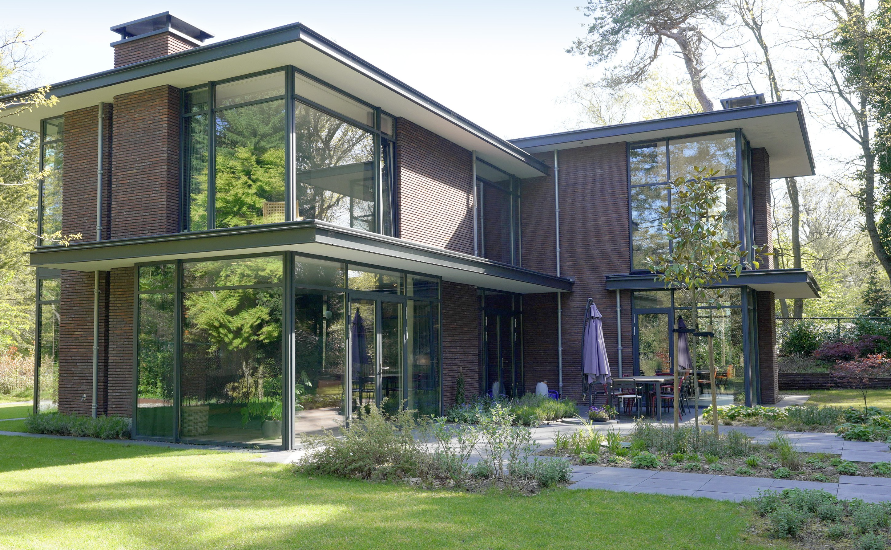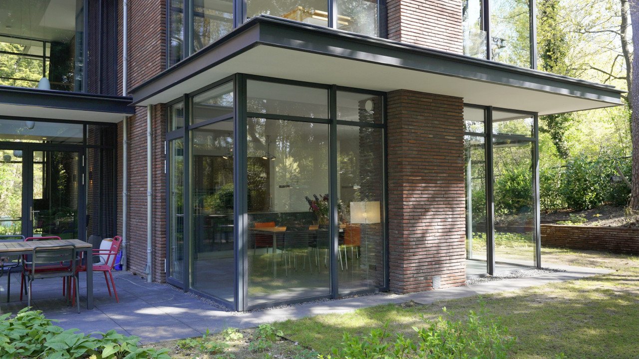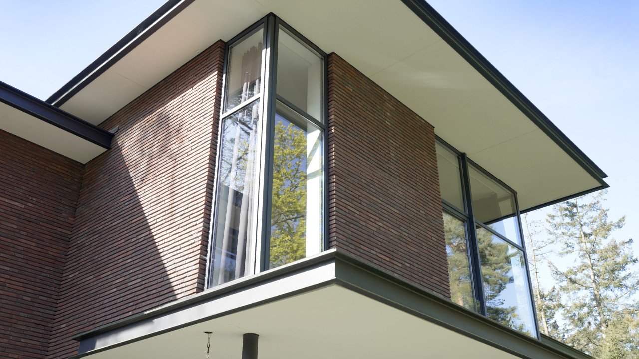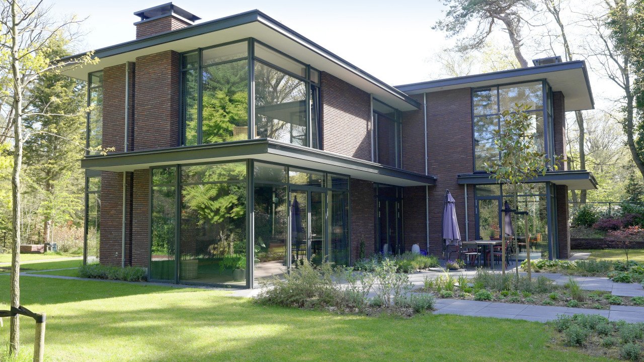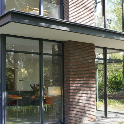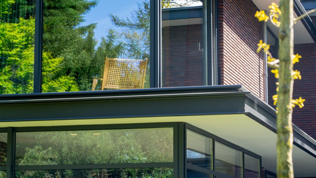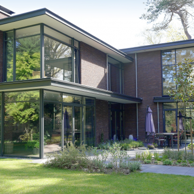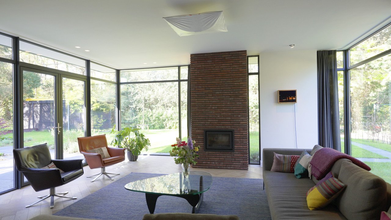 Fase 2 werd al een jaar na oplevering aan de rechterzijde van het eerste bouwdeel gerealiseerd. Hierdoor ontstond een kruisvormige plattegrond. Een vide, met hoge boekenkast als eyecatcher, verbindt de entreehal met de royale tv-kamer. Op de verdieping kwam een mastersuite met inloopkast en badkamer. Op het gebied van esthetiek was er de wens om een elegante, ranke en leesbare woning te maken. Engel vertelt: “Veel moderne villa’s zijn bonkig en robuust met dikke dakranden en wit stucwerk. Wanneer je een standaard dakrand van 40 centimeter halveert, creëer je een veel eleganter beeld. Ik kijk voortdurend waar ik verfijning kan toepassen. Zo waren ook de zichtlijnen van belang. Door op iedere hoek glas te maken, ontstaan er lange, diagonale zichtlijnen over de kavel. Hierdoor krijg je een veel ruimtelijker gevoel en wordt de tuin onderdeel van het huis.”