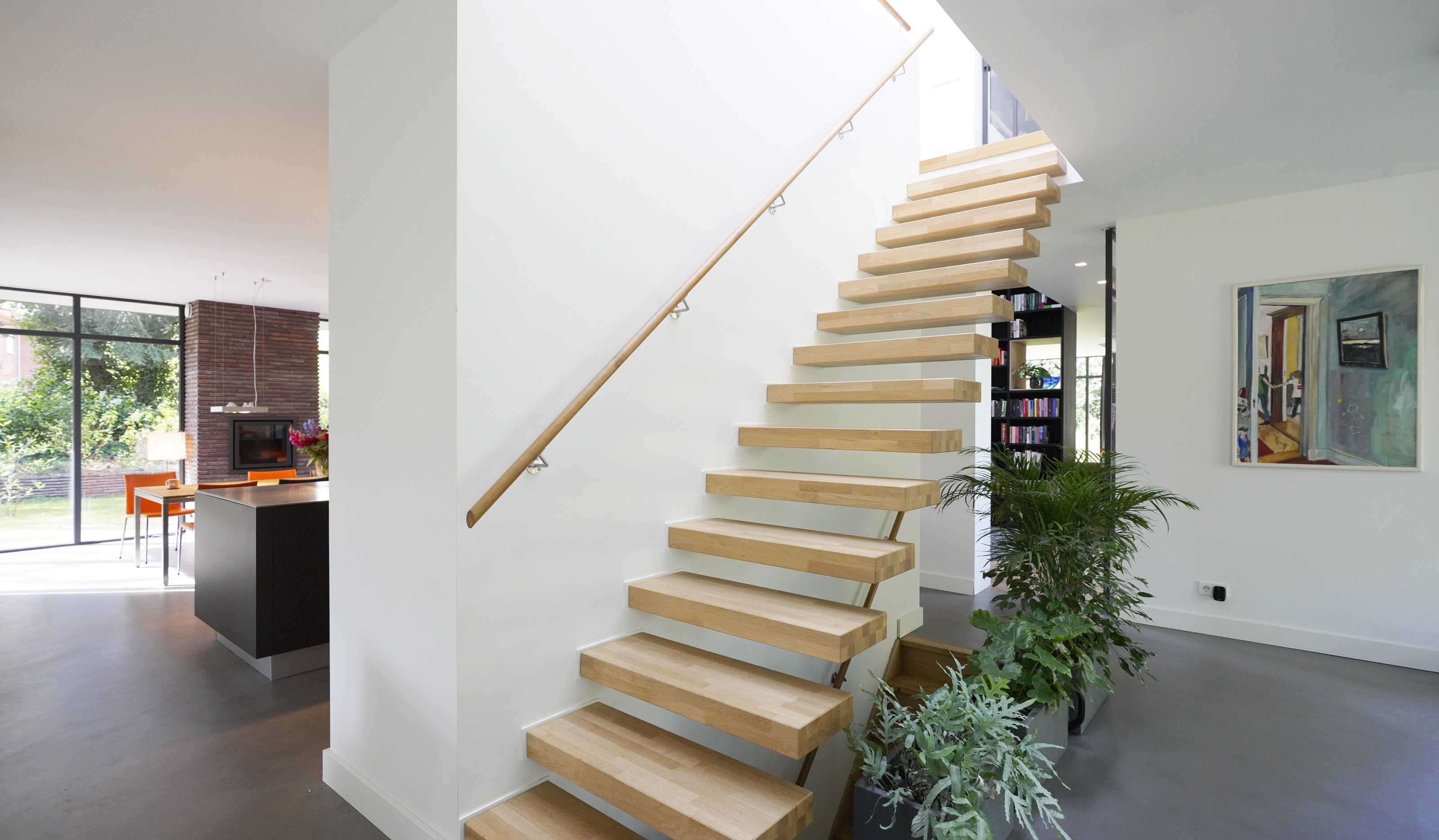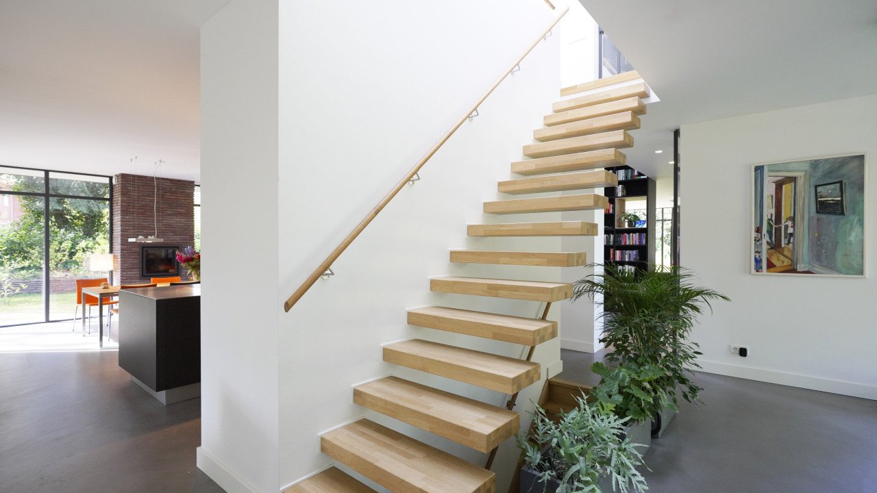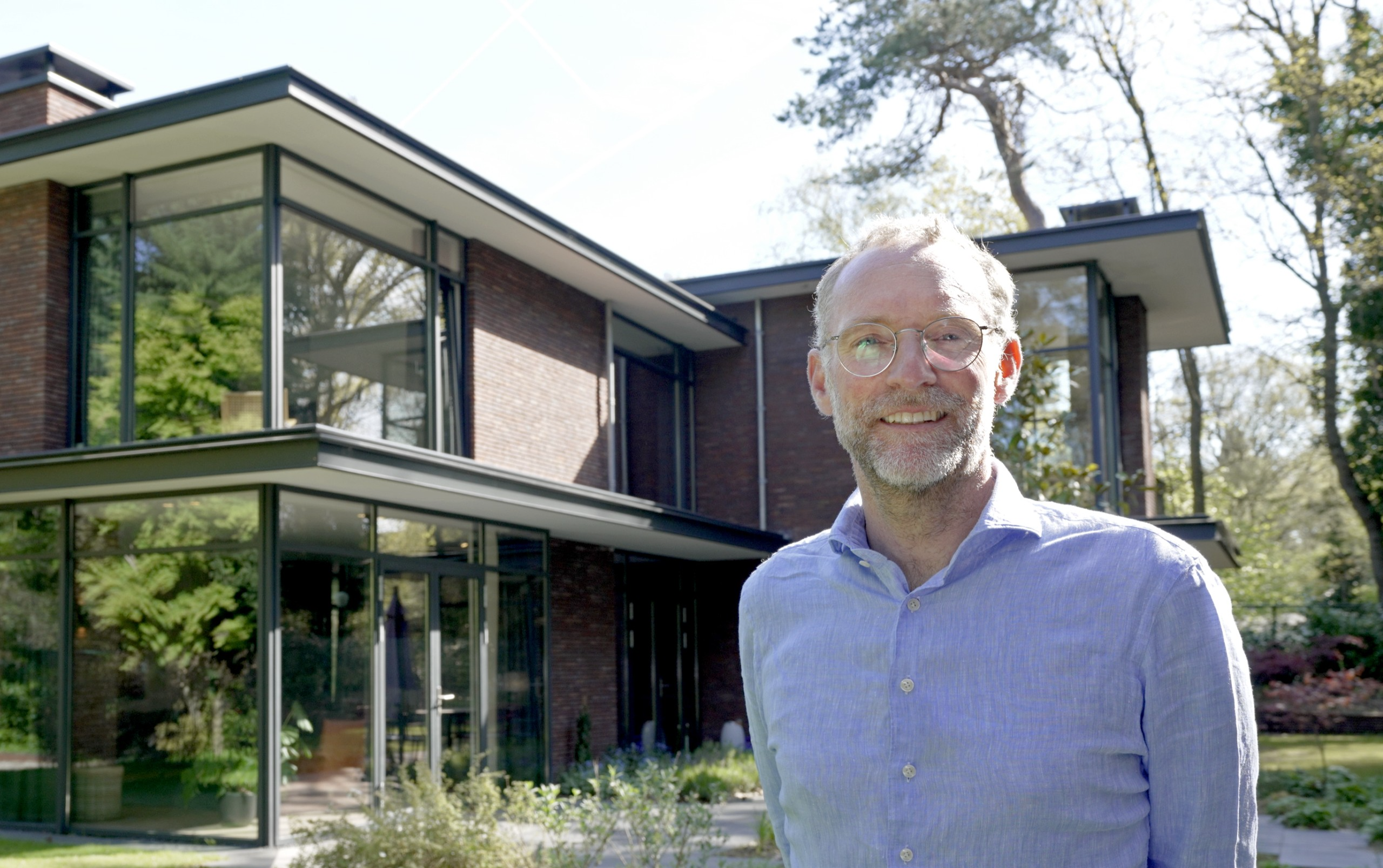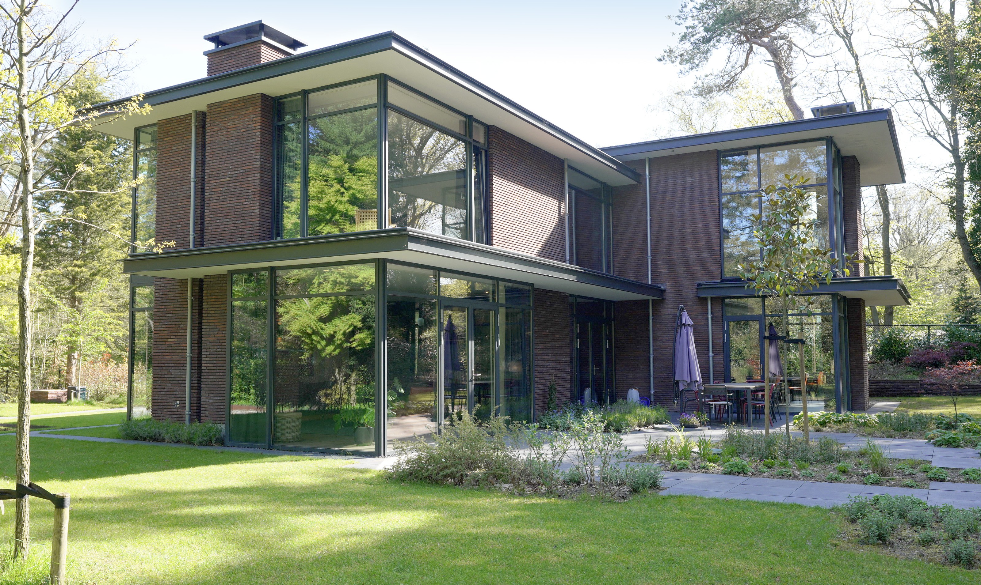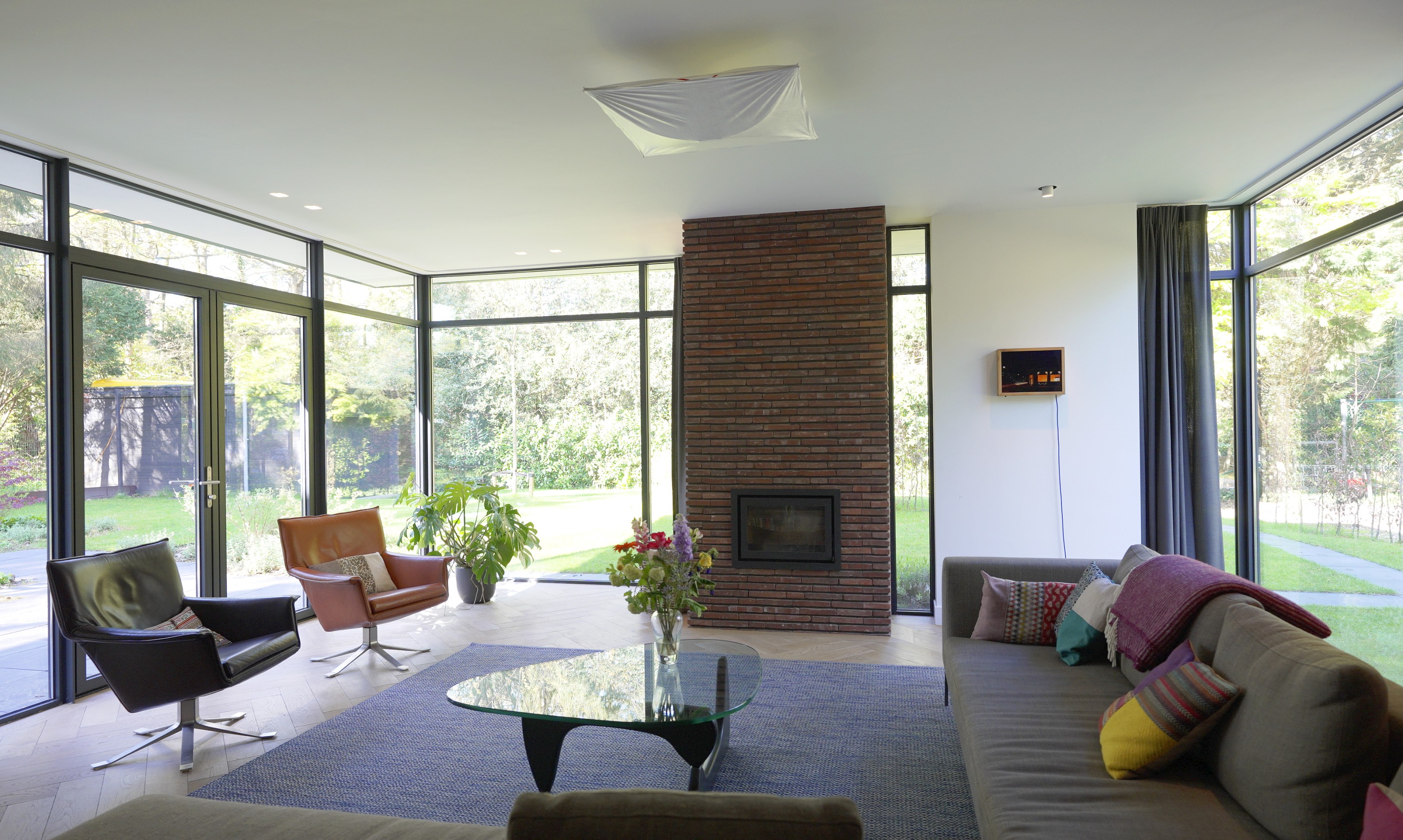 Fase 2 werd al een jaar na oplevering aan de rechterzijde van het eerste bouwdeel gerealiseerd. Hierdoor ontstond een kruisvormige plattegrond. Een vide, met hoge boekenkast als eyecatcher, verbindt de entreehal met de royale tv-kamer. Op de verdieping kwam een mastersuite met inloopkast en badkamer. Op het gebied van esthetiek was er de wens om een elegante, ranke en leesbare woning te maken. Engel vertelt: “Veel moderne villa’s zijn bonkig en robuust met dikke dakranden en wit stucwerk. Wanneer je een standaard dakrand van 40 centimeter halveert, creëer je een veel eleganter beeld. Ik kijk voortdurend waar ik verfijning kan toepassen. Zo waren ook de zichtlijnen van belang. Door op iedere hoek glas te maken, ontstaan er lange, diagonale zichtlijnen over de kavel. Hierdoor krijg je een veel ruimtelijker gevoel en wordt de tuin onderdeel van het huis.”