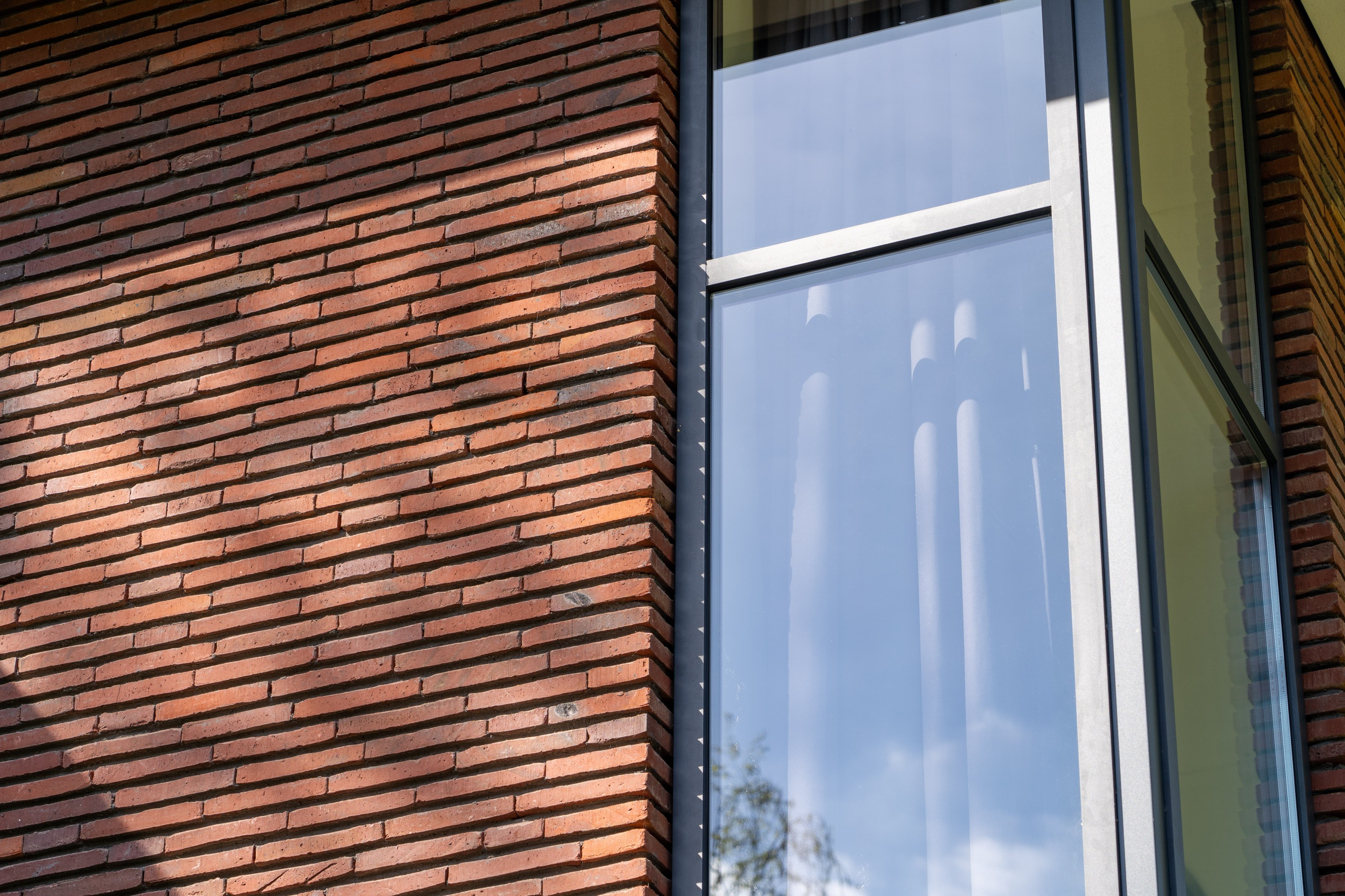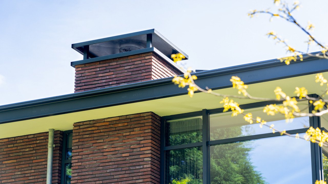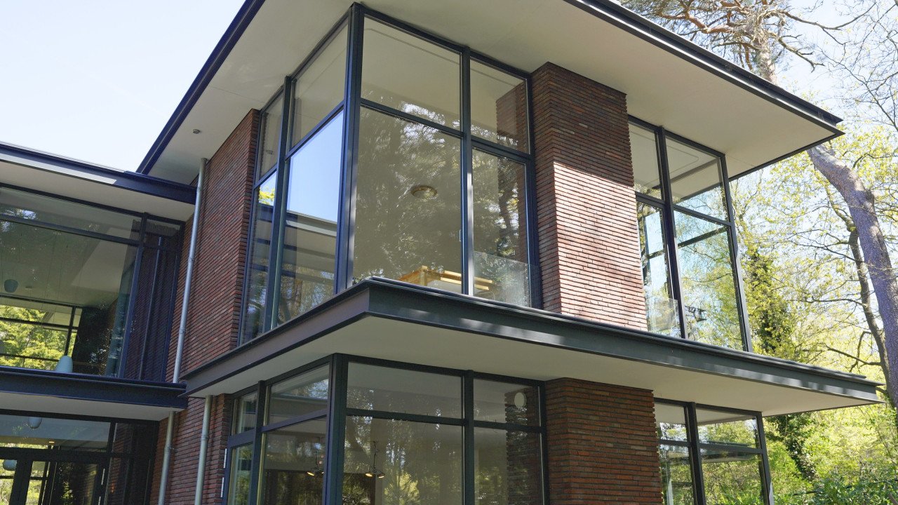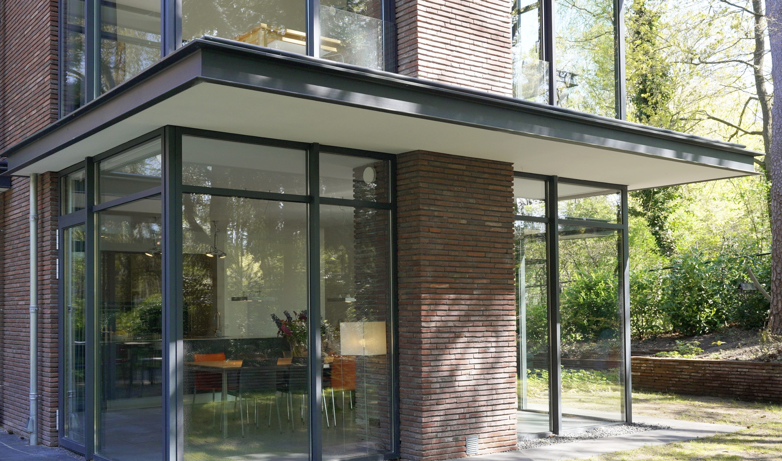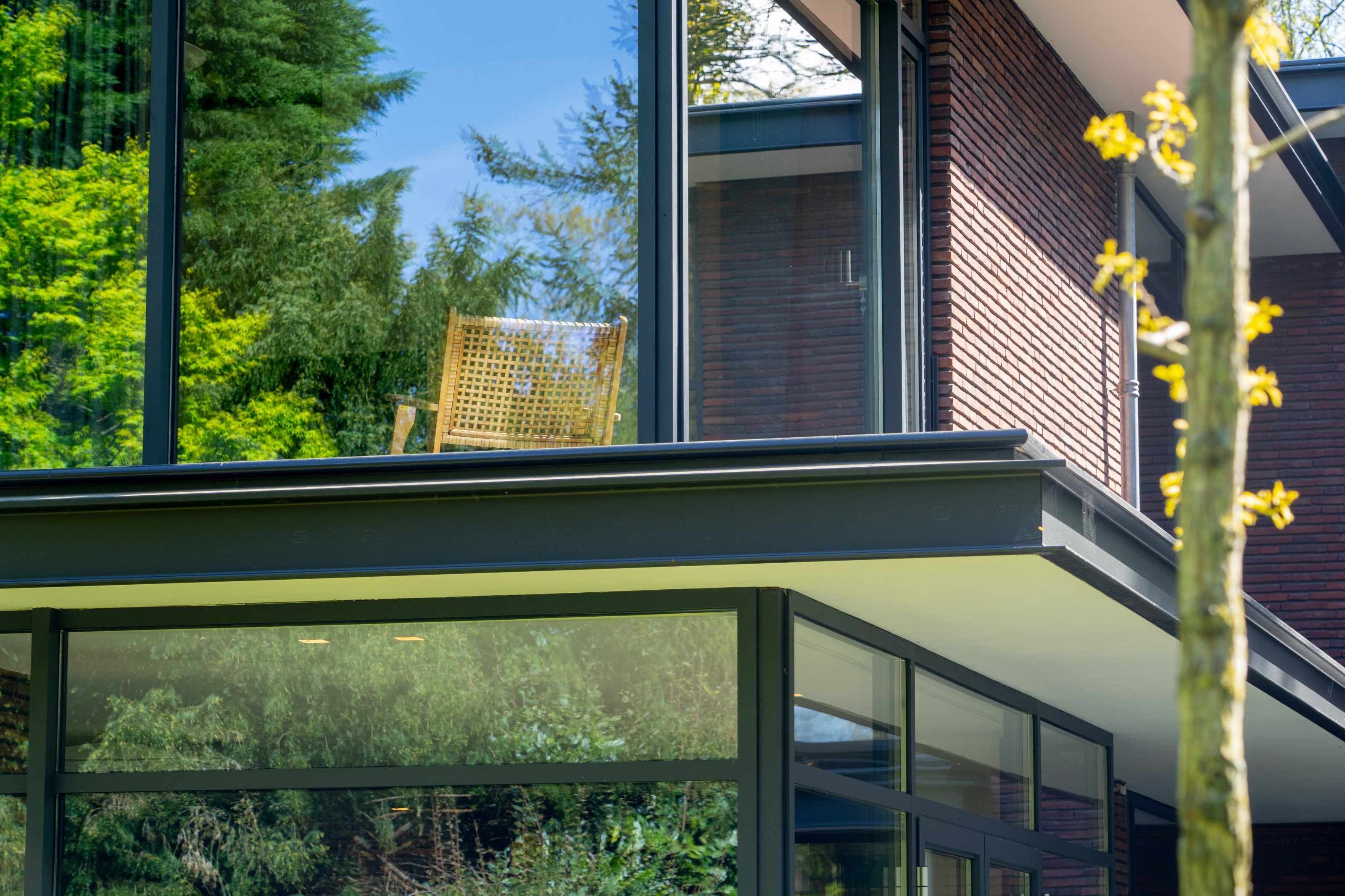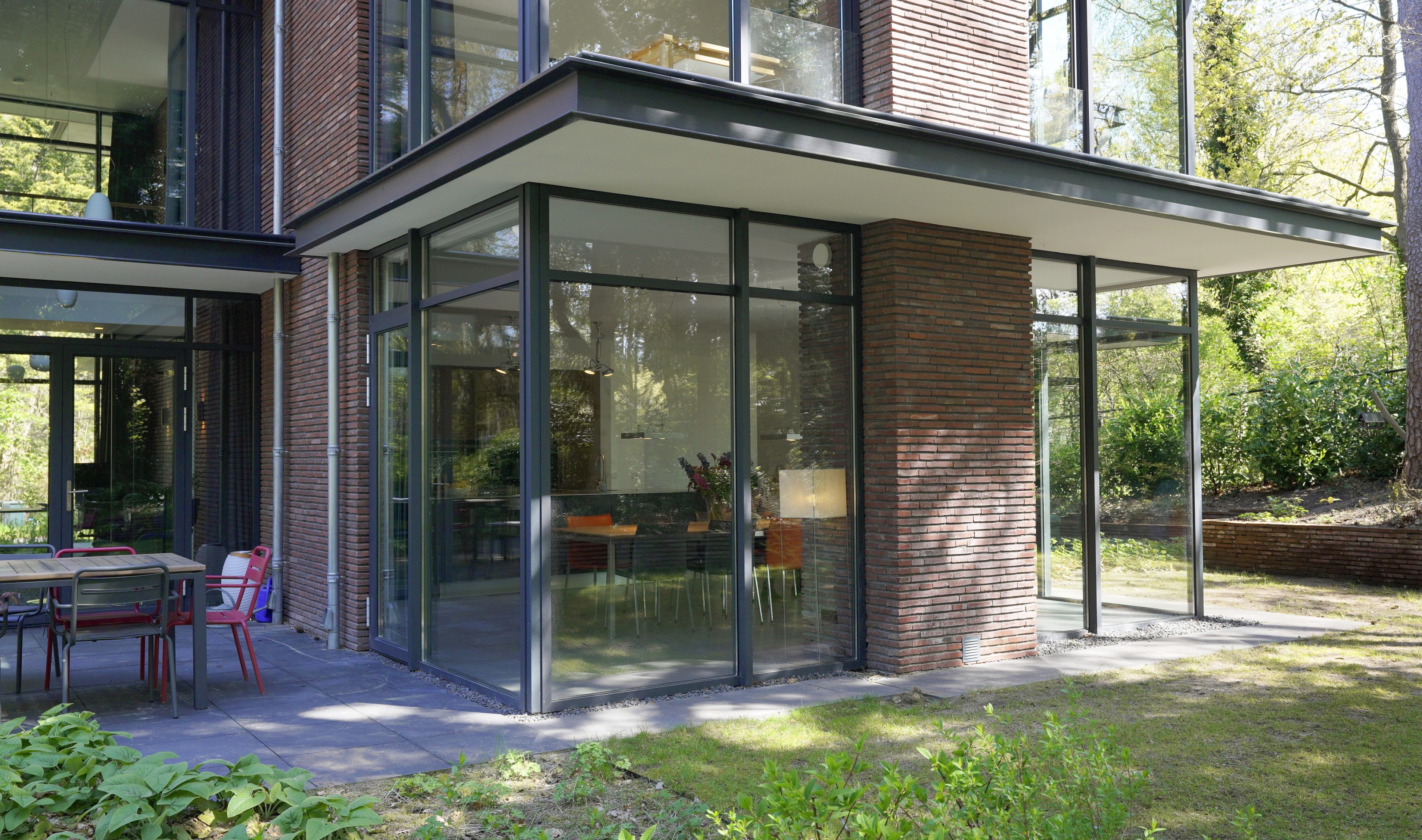 Fase 2 werd al een jaar na oplevering aan de rechterzijde van het eerste bouwdeel gerealiseerd. Hierdoor ontstond een kruisvormige plattegrond. Een vide, met hoge boekenkast als eyecatcher, verbindt de entreehal met de royale tv-kamer. Op de verdieping kwam een mastersuite met inloopkast en badkamer. Op het gebied van esthetiek was er de wens om een elegante, ranke en leesbare woning te maken. Engel vertelt: “Veel moderne villa’s zijn bonkig en robuust met dikke dakranden en wit stucwerk. Wanneer je een standaard dakrand van 40 centimeter halveert, creëer je een veel eleganter beeld. Ik kijk voortdurend waar ik verfijning kan toepassen. Zo waren ook de zichtlijnen van belang. Door op iedere hoek glas te maken, ontstaan er lange, diagonale zichtlijnen over de kavel. Hierdoor krijg je een veel ruimtelijker gevoel en wordt de tuin onderdeel van het huis.”