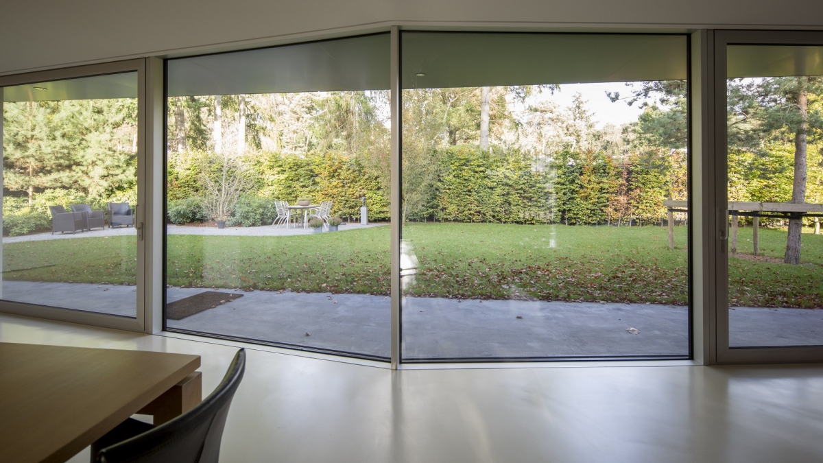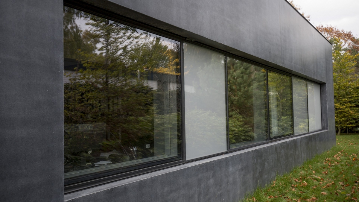 In de andere zijgevel zijn de vensters gevat in een band. “Om het robuuste karakter van de zijgevel te versterken, wilden we één horizontale uitsnede in het beton maken in plaats van losse vensters. Door ook hier te kiezen voor een semi-structureel vliesgevelsysteem van Reynaers hebben we transparante, translucente en opake glasdelen samengevoegd als een bandraam.” Ook hier is een parallel uitzetraam toegepast. “Groot voordeel van een parallel raam voor de gebruikers is dat de schaarverbindingen ook in geopende stand grote bescherming tegen inbraak bieden”, verzekert de architect. Zo biedt deze heldere transparante woning de bewoners ook veiligheid en geborgenheid.