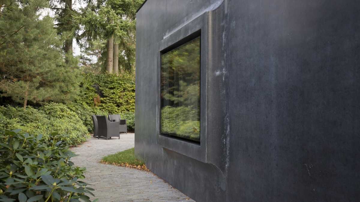 De koppen van de woning, de daklijst en de terrasvloer zijn uitgevoerd in antraciet beton. Beide zijgevels bestaan uit een 12 ton wegende prefab betonwand van 11 x 3 meter, uit één stuk gegoten. Om de hoeken zijn smallere 2,6 meter hoge betonplaten geplaatst. De zelfdragende betonnen panelen rusten direct op de fundering. Architect Tim Brans van Barcode Architects vertelt over de panelen: “De combinatie van de donkere kleur, de thermische en fysische eigenschappen van beton en de enorme afmetingen van de panelen stelden ons voor een grote uitdaging. De panelen waren te groot om met een machine te polijsten. Ze zijn vier maal met de hand gepolijst om ze het gewenste reflecterende oppervlakte te geven. Daarbij zijn dit soort donkere en massieve elementen onderhevig aan aanzienlijke expansie bij opwarming. Door verbindingen te gebruiken die zowel in horizontale als in verticale richting kunnen bewegen, hebben we het mogelijk gemaakt om de enorm zware gevelplaten in de hoeken in een uiterst fijne open naad van 10 mm te laten samenkomen.”